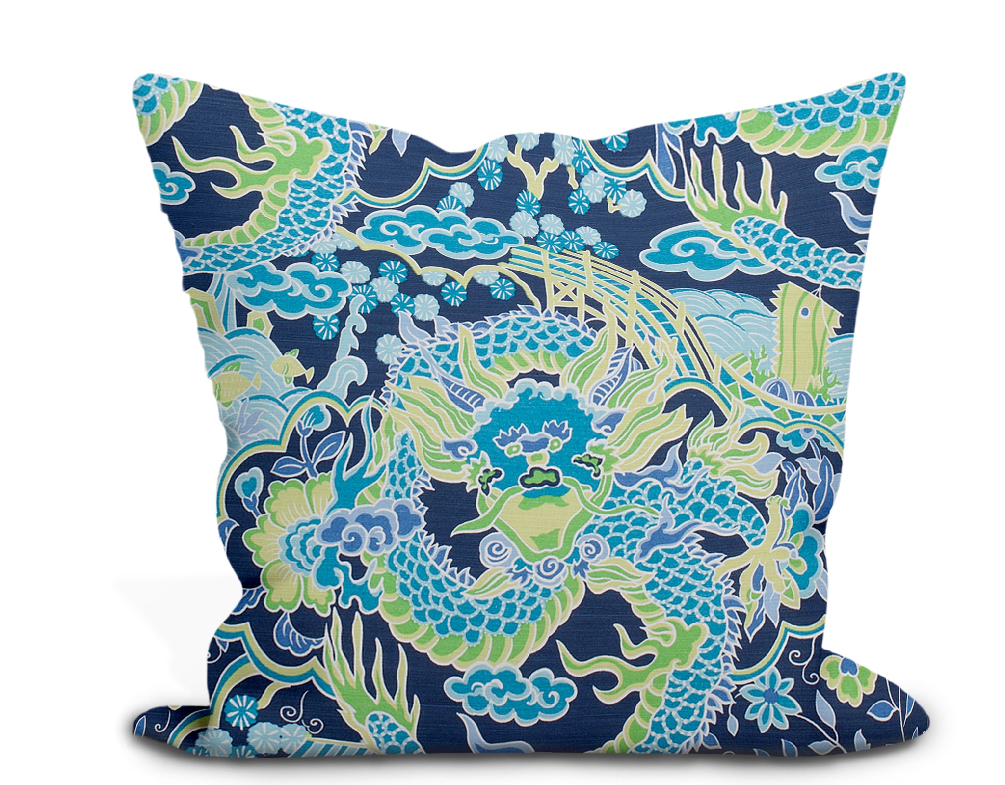 Custom made pillow cover in abstract chinoiserie Thibaut's Imperial Dragon fabric. Please choose size and other custom options from the drop down menu. Price is per single pillow cover unless purchased with insert.