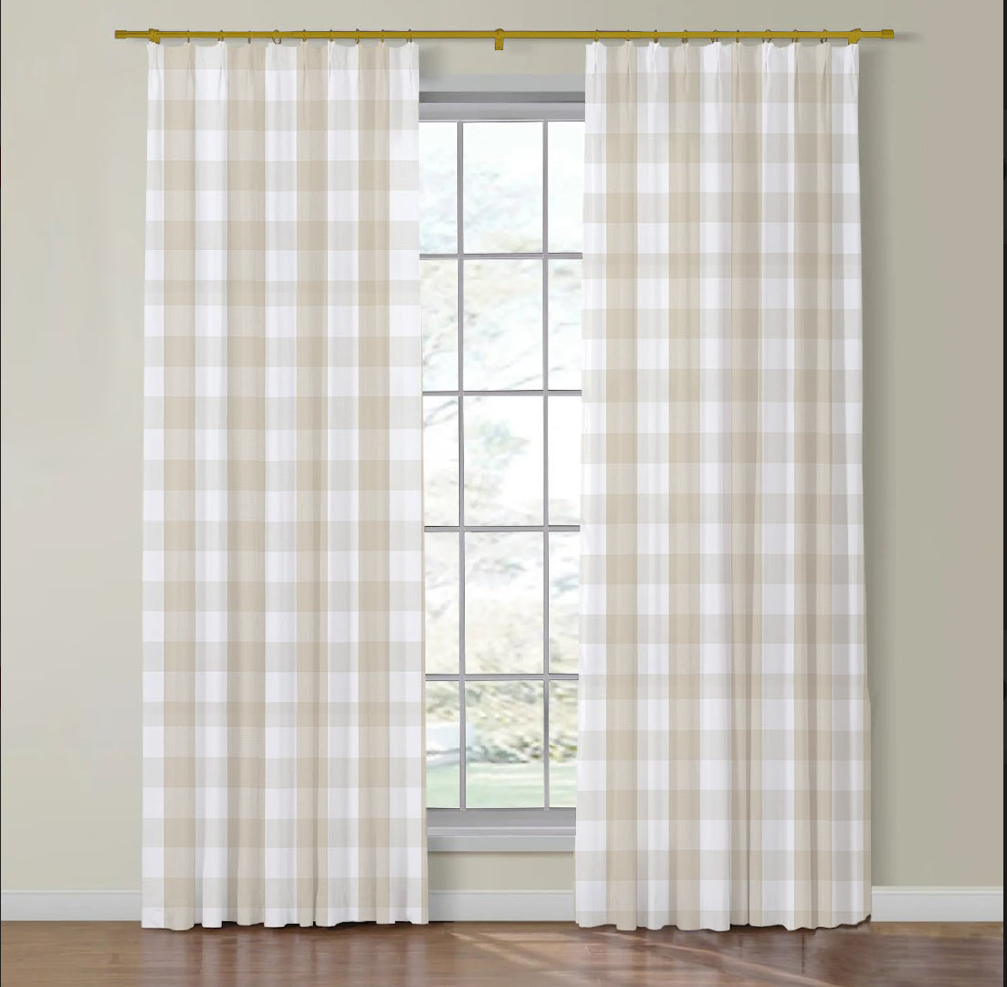 Two made to order drapery panels in Thibaut's Hammond Check fabric in the following lengths: