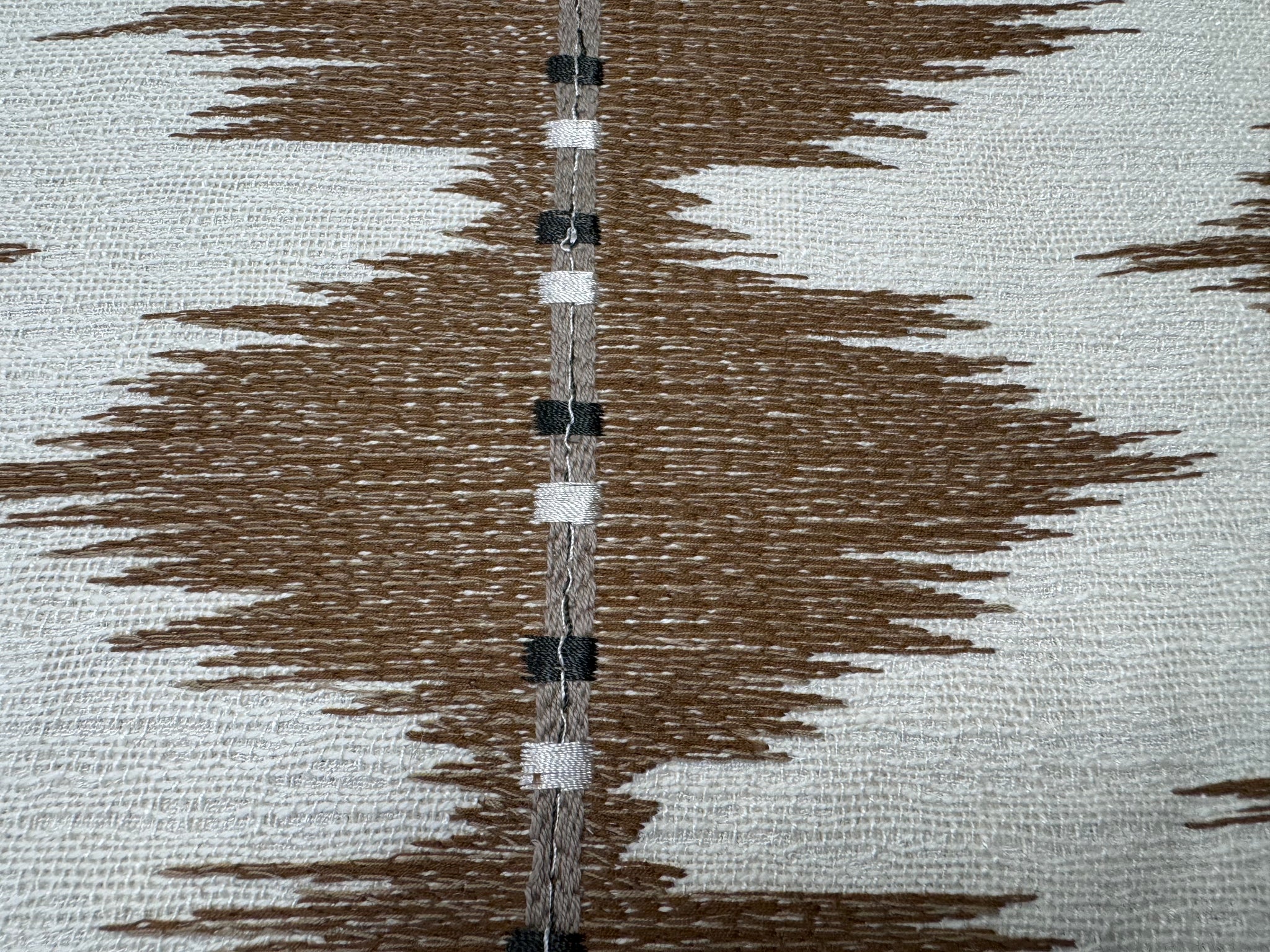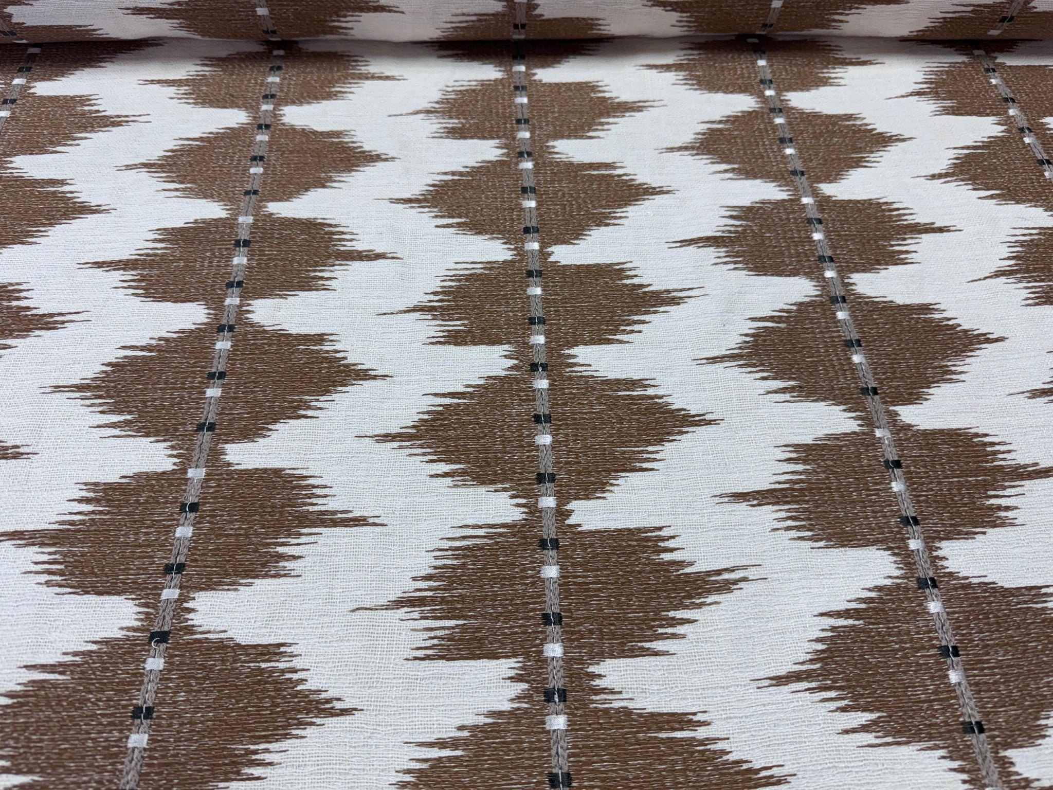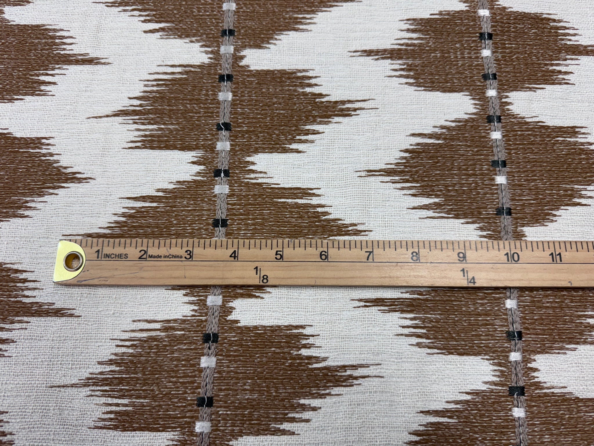 54” wide Colefax and Fowler Myrthus fabric by Larsen, with a crisp dry hand, this ikat inspired stripe is embroidered with a blended yarn on a gently textured ground.