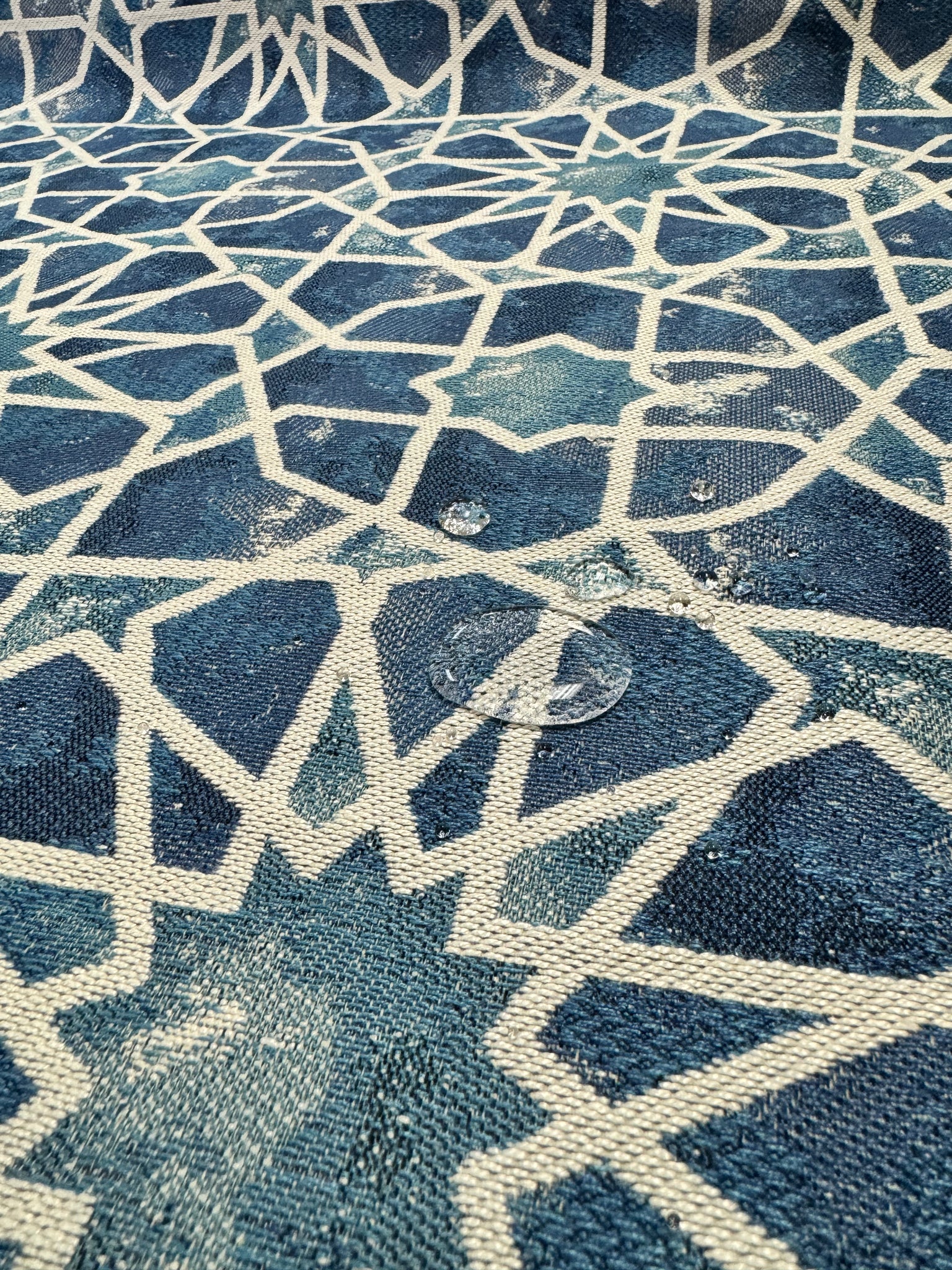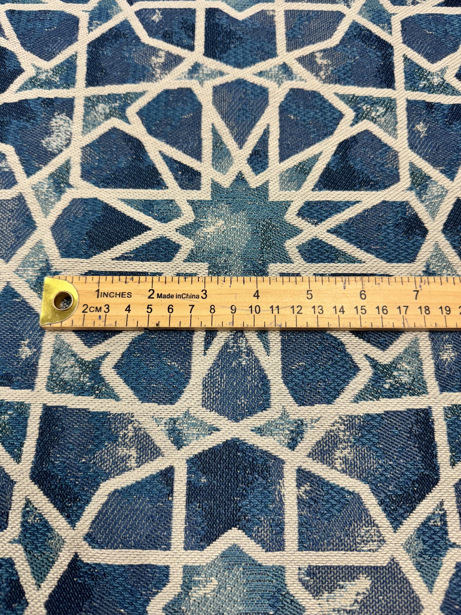 54” wide Kravet Design 35100-5 Performance Crypton Home Collection Indoor water & stain resistant Ethnic Geometric upholstery fabric in Blue and Ivory.