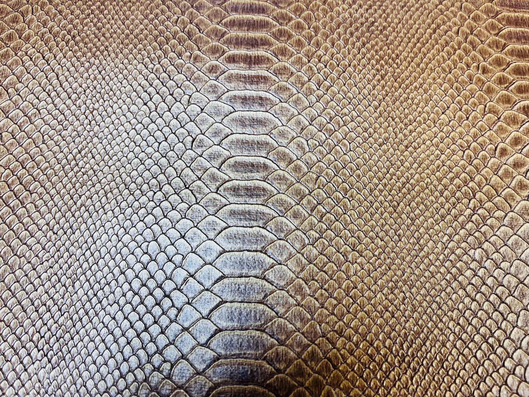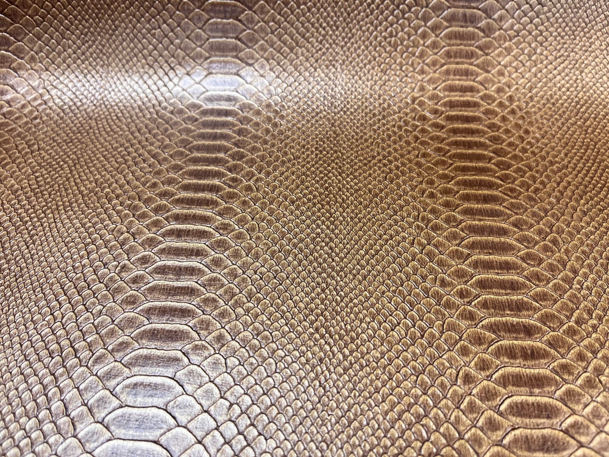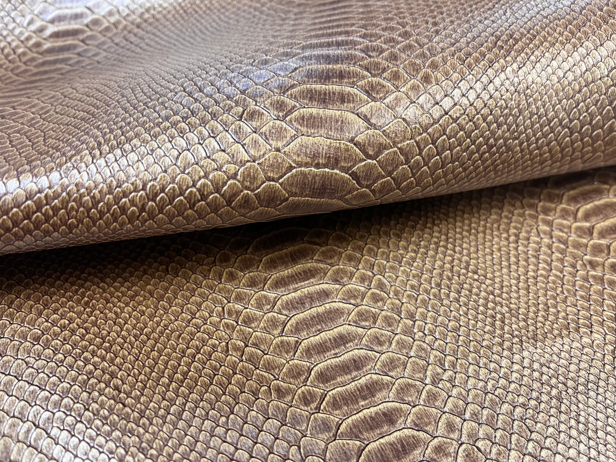 54” wide designer heavy duty faux leather upholstery vinyl in sumptuous caramel color with hints of bronze and copper with an embossed reptile pattern. Price is per