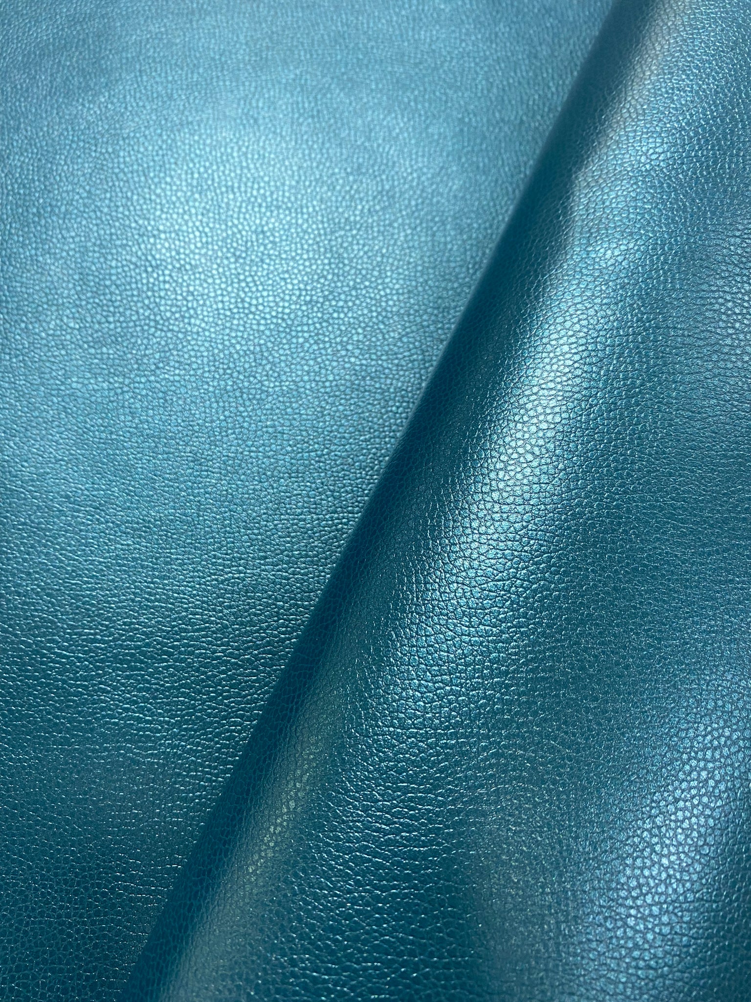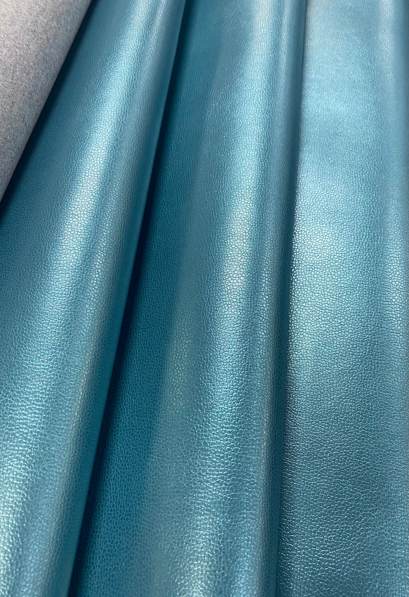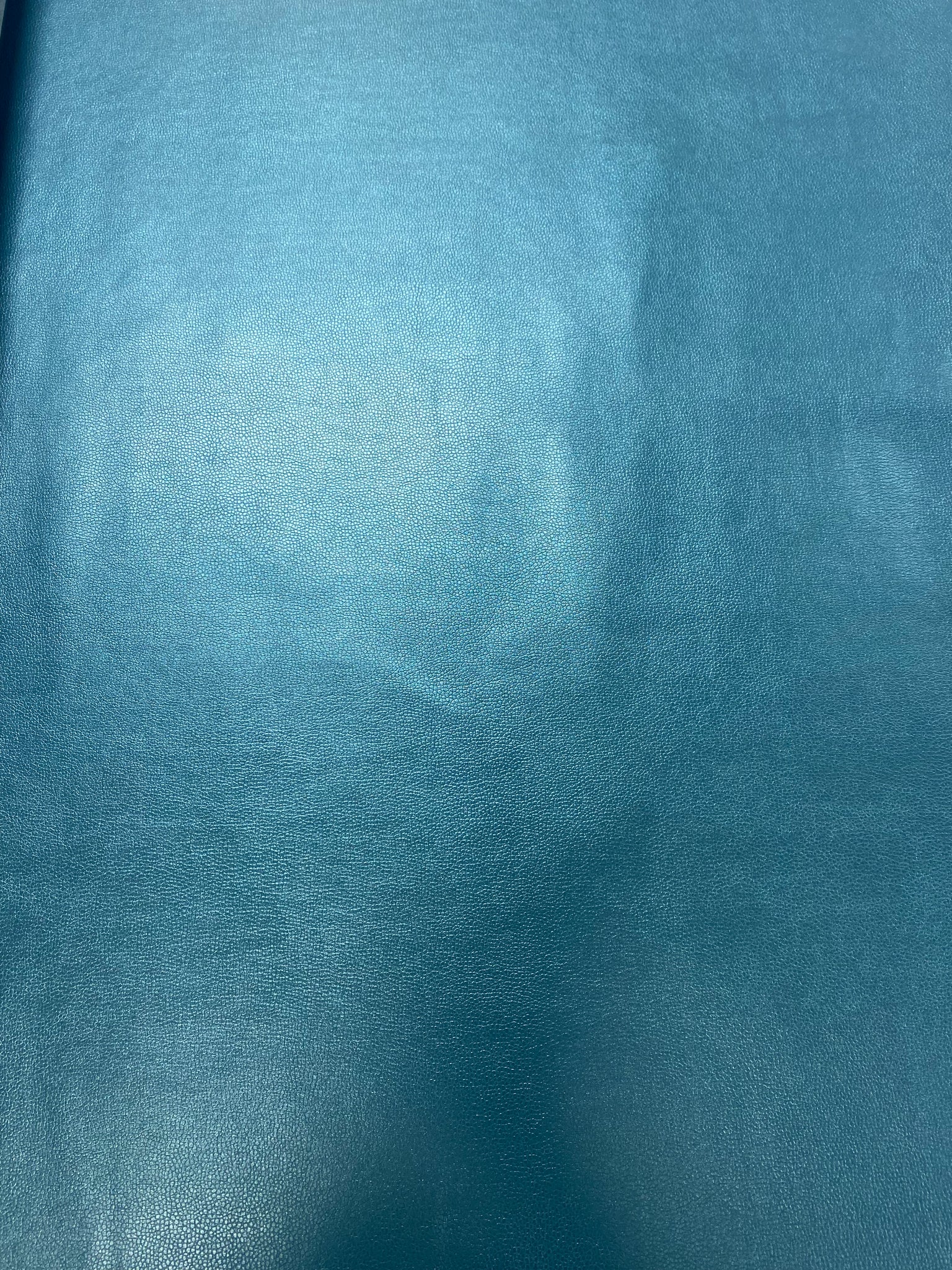 54" wide designer pearlucent metallic vegan faux leather vinyl upholstery fabric in teal blue. Price is per yard. Let us know if you need more than what is available in our store.