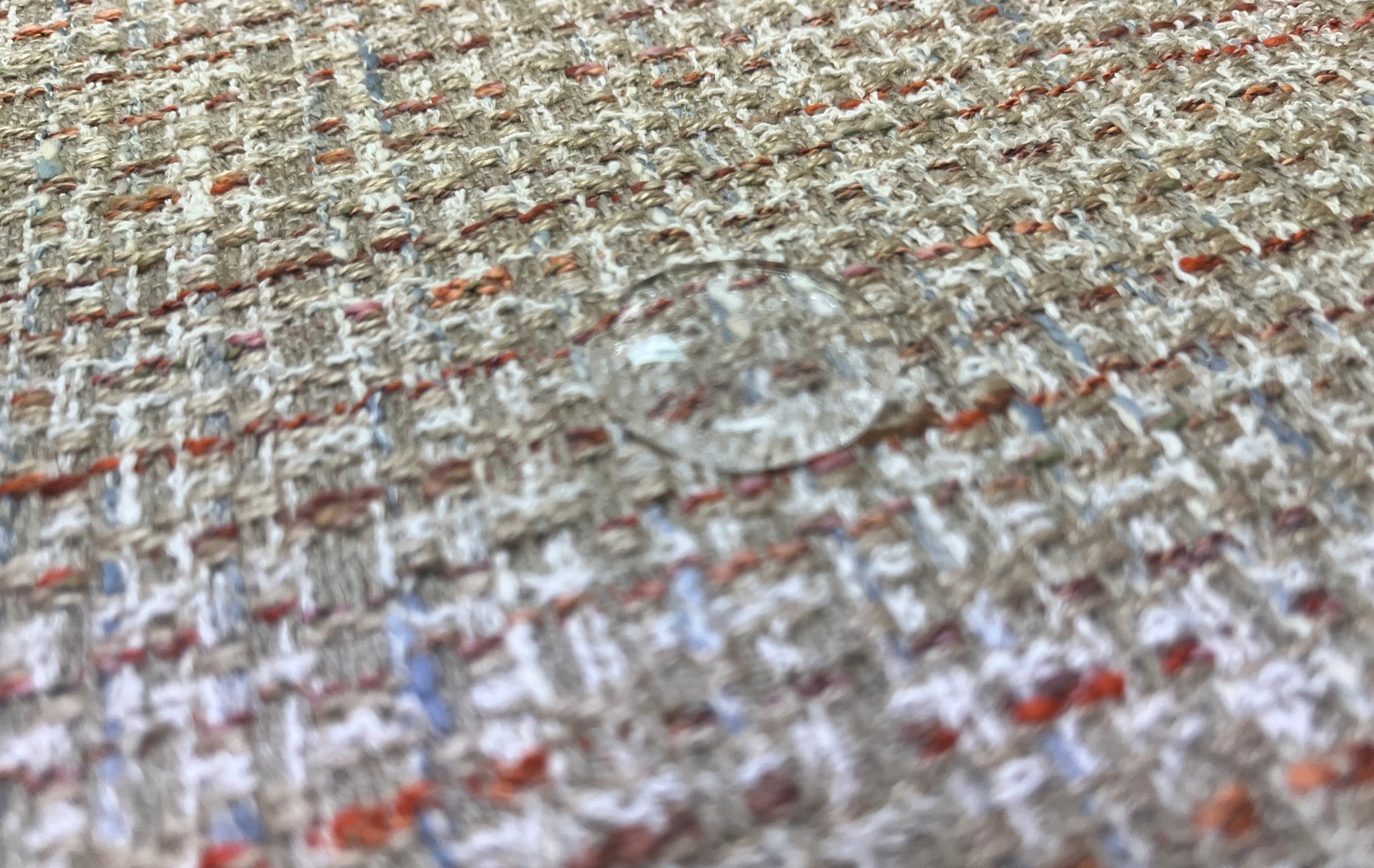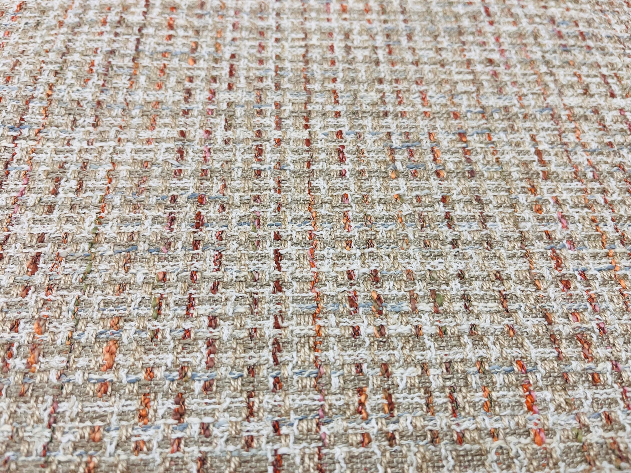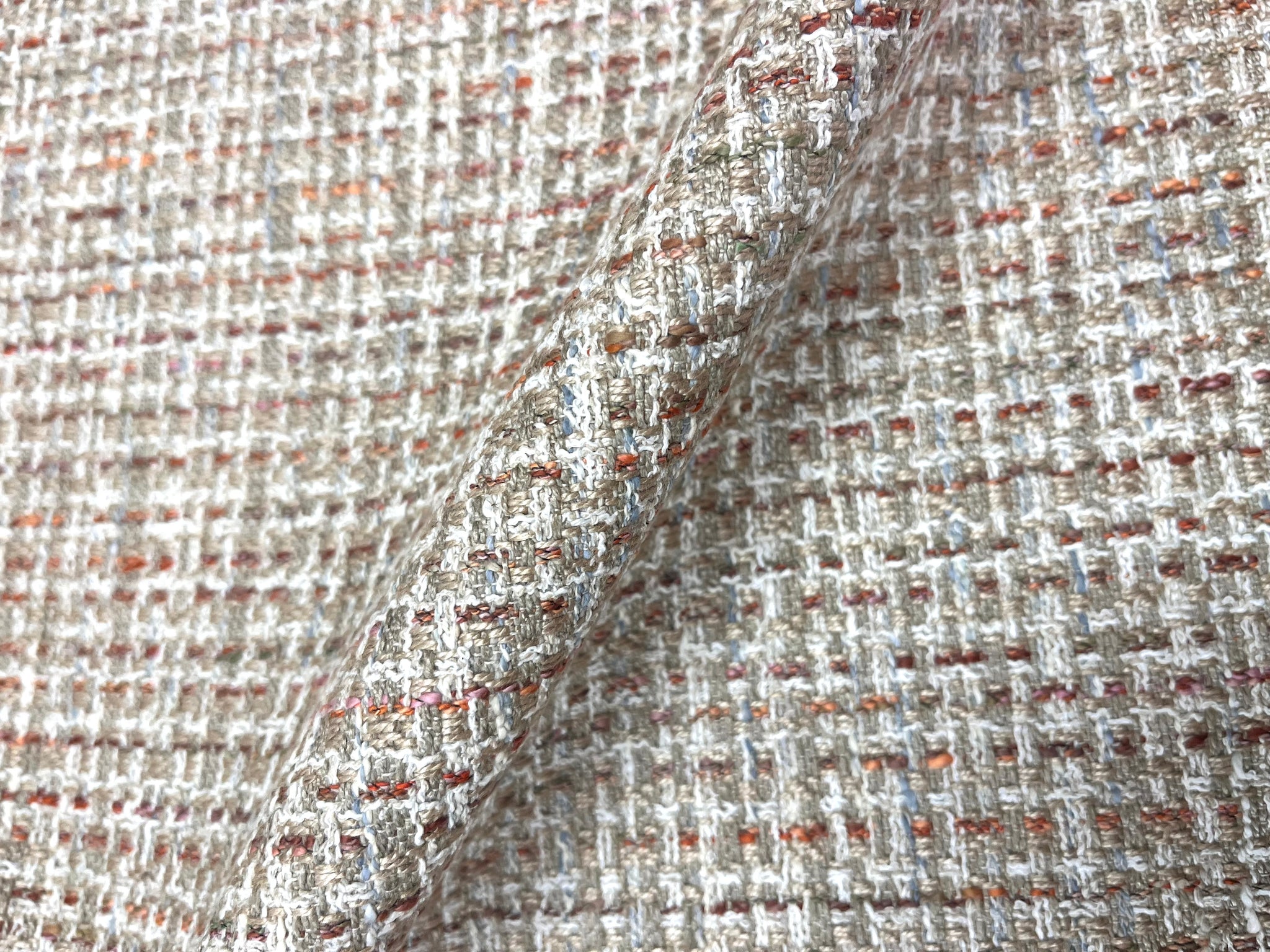 56” wide designer tweed upholstery fabric in beige, coral, blue and cream. Stain and water resistant. Price is per yard.