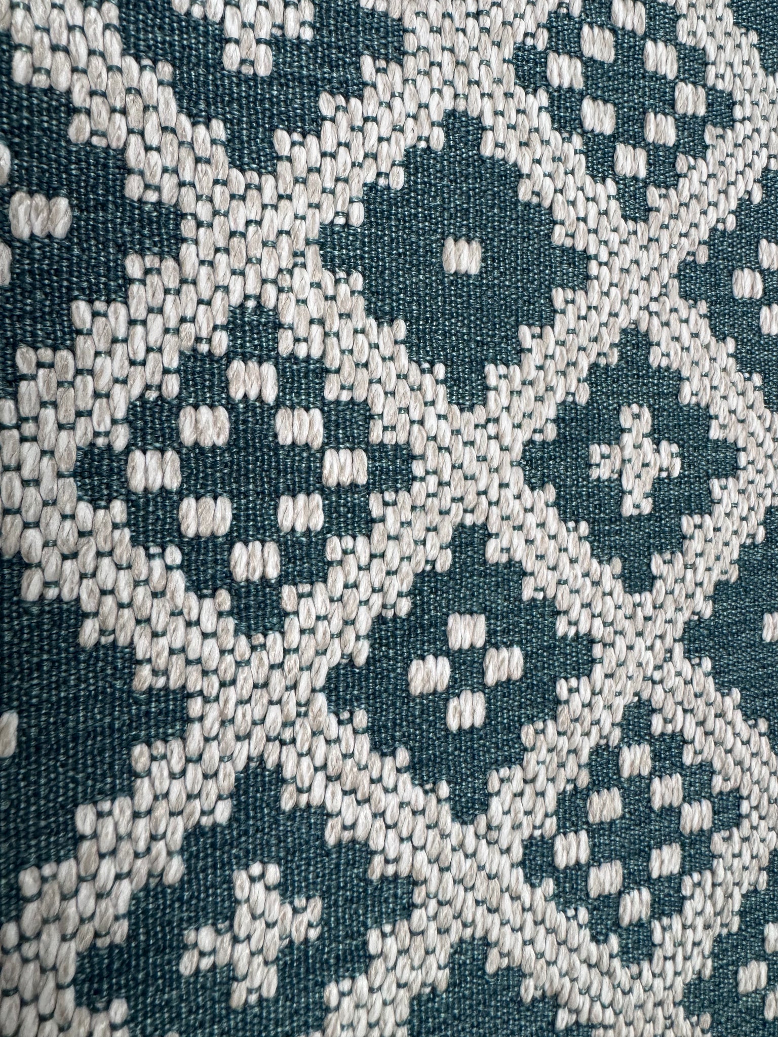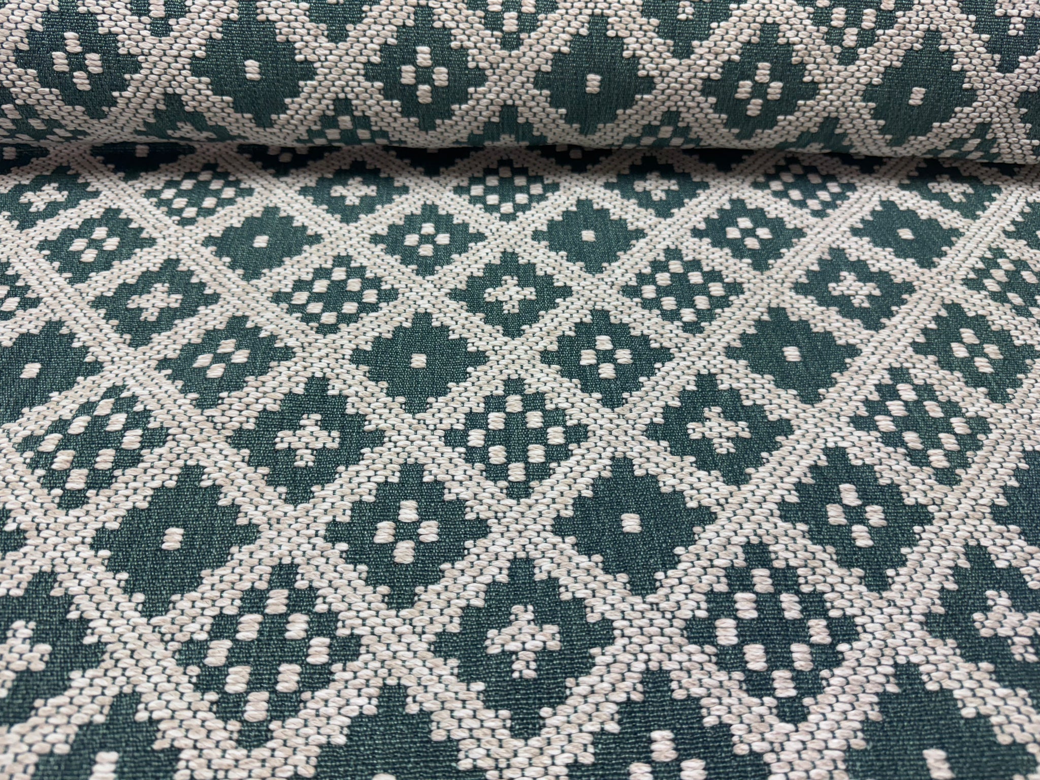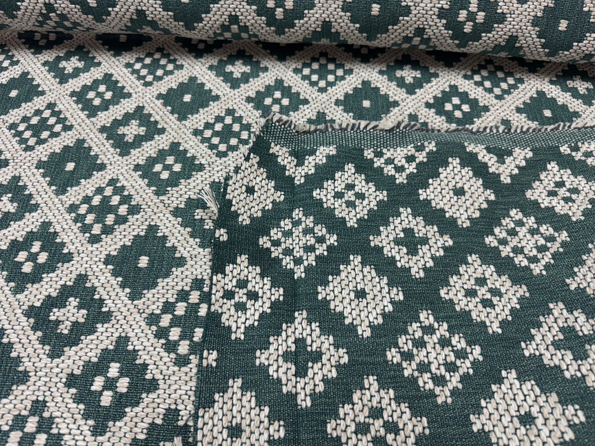 55” wide reversible OPUZEN 7347-7412 Avon Teal fabric, the pattern is a geometric design with a diamond-like motif and small floral star-shaped elements within the diamonds in green and off white heavy upholstery fabric.