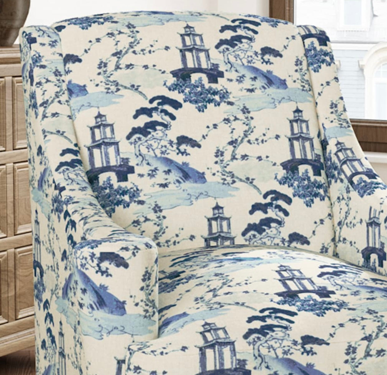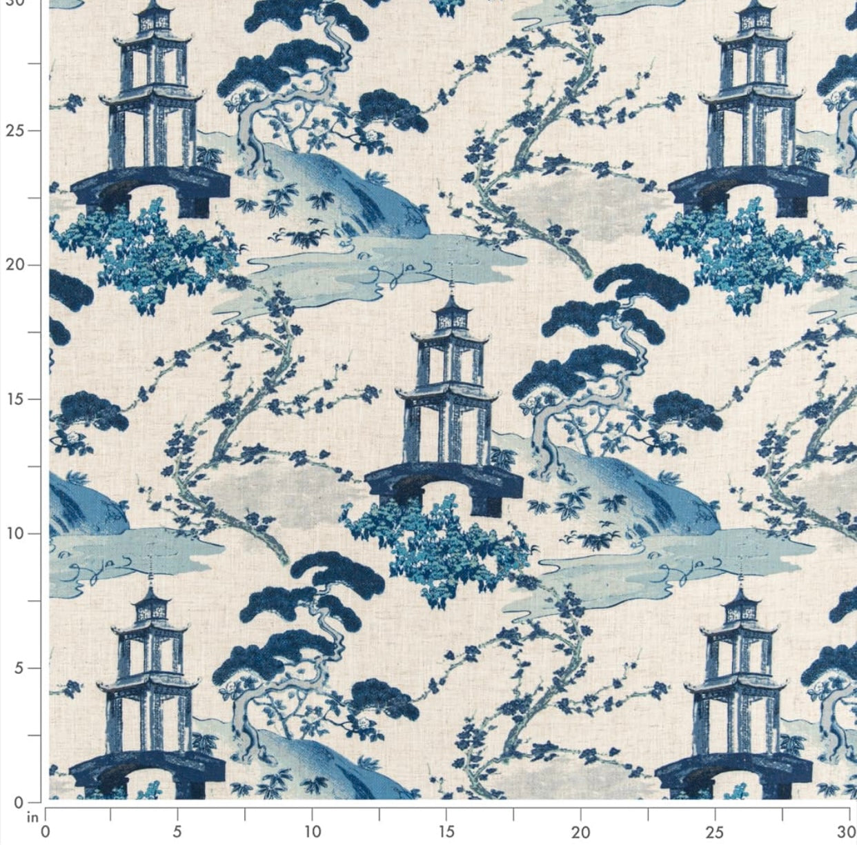 Stain resistant chinoiserie asian upholstery drapery fabric in navy, aqua blue and cream. Price is per yard. Let us know if you need more than what is available in our store.