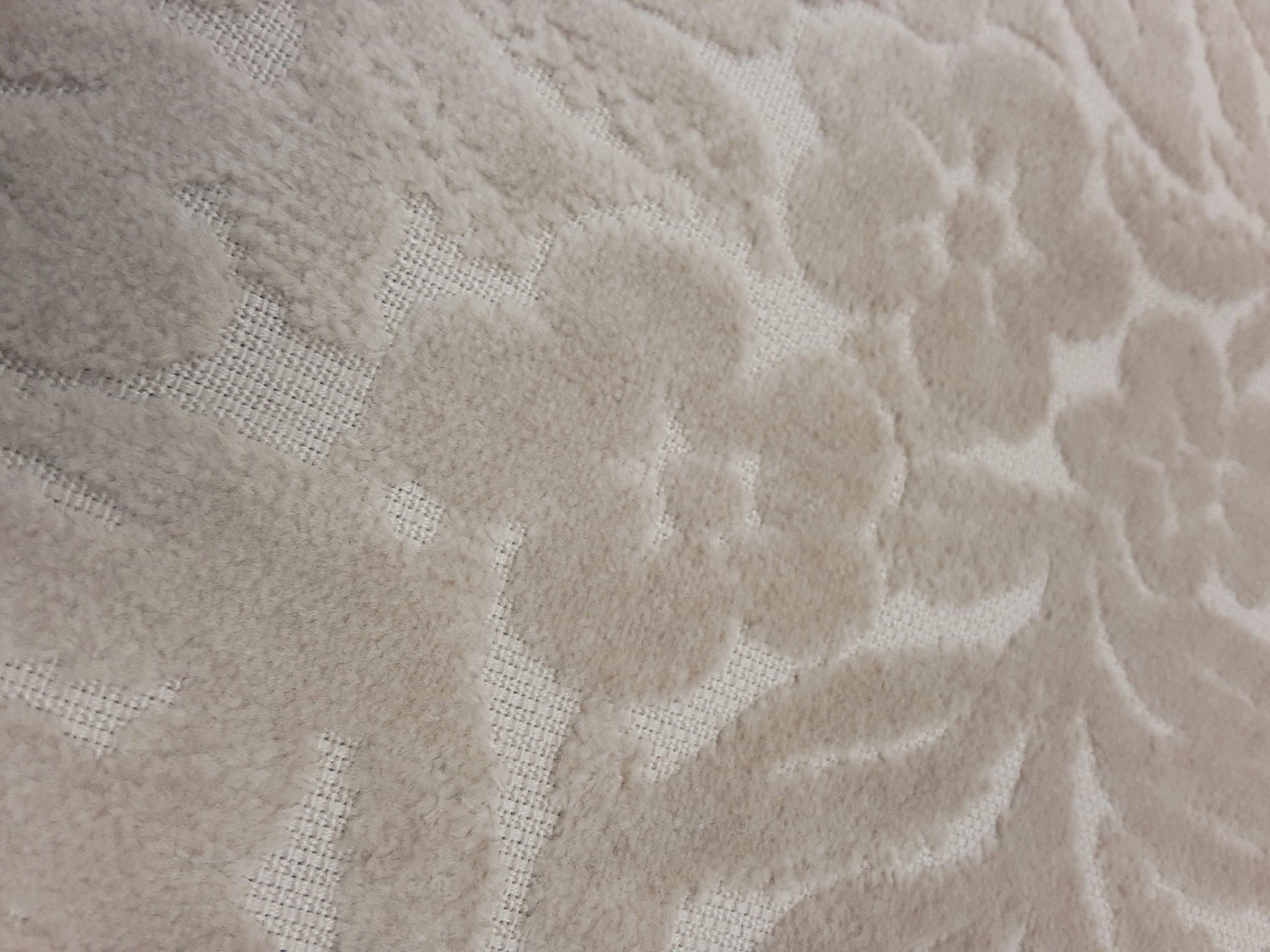 A beautiful velvet fabric with a floral motif with colors of taupe and beige. Water and stain resistant. Can be used for upholstery. 54" width. Price is per yard.