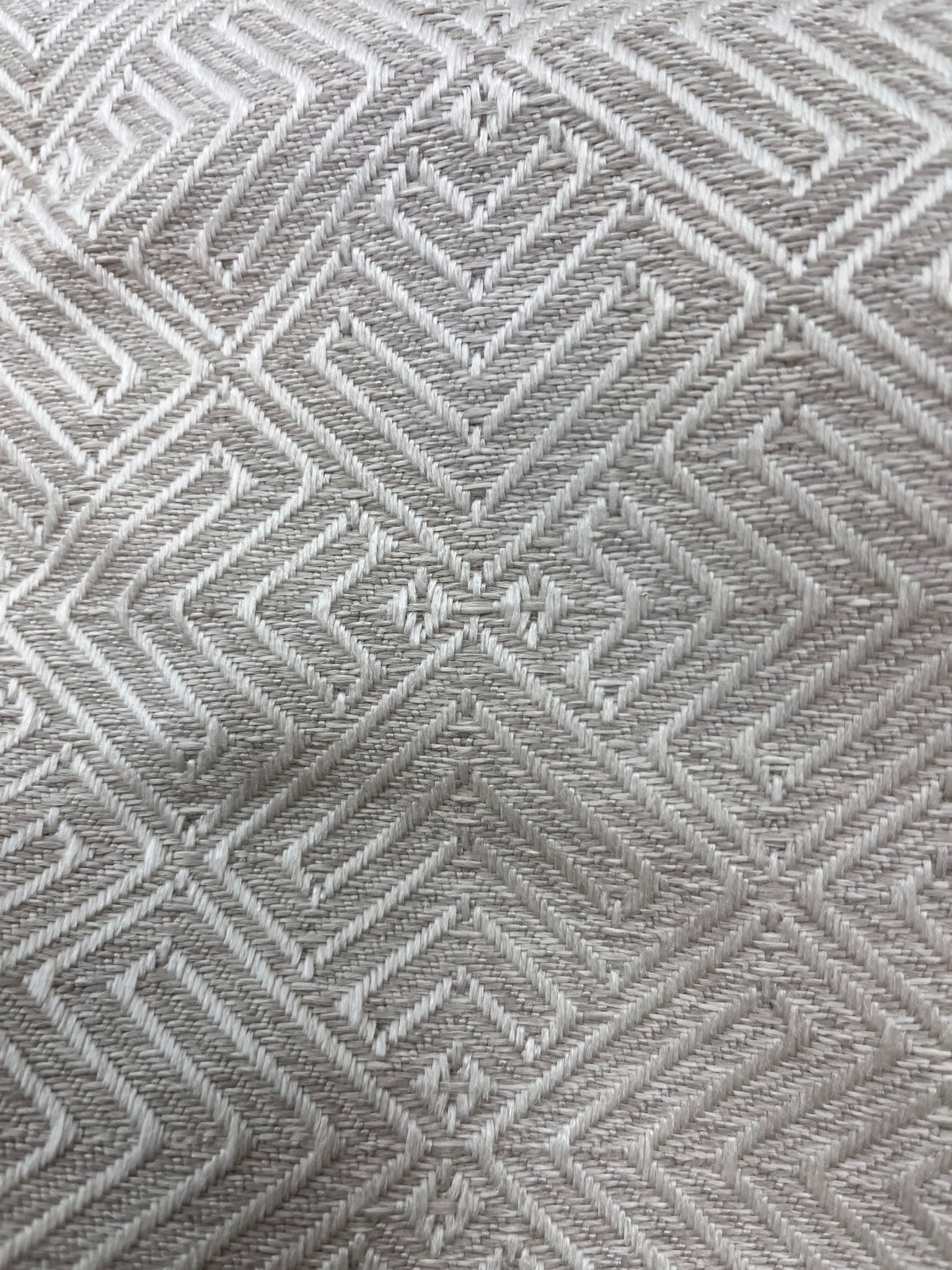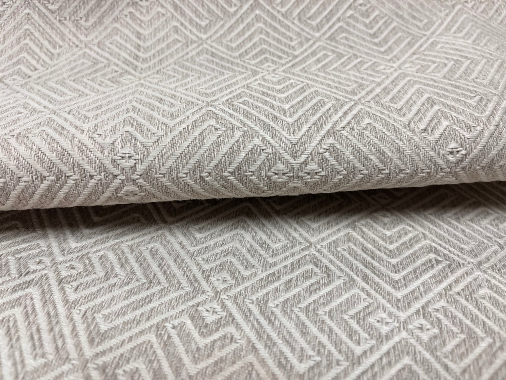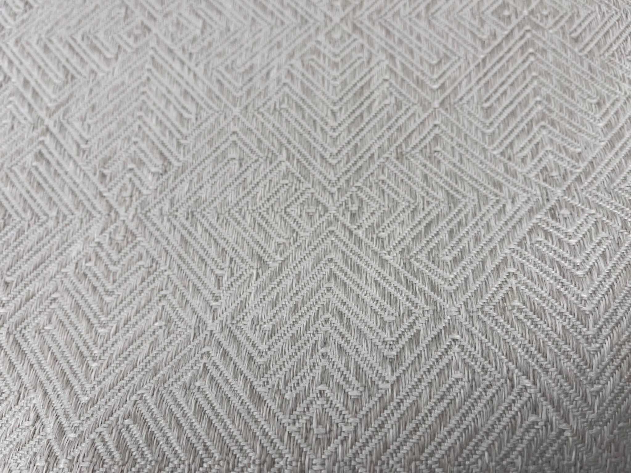 59” wide designer indoor outdoor Journey fabric by Urban Source in White Sand (taupe) with a woven geometric pattern. Price is per yard.