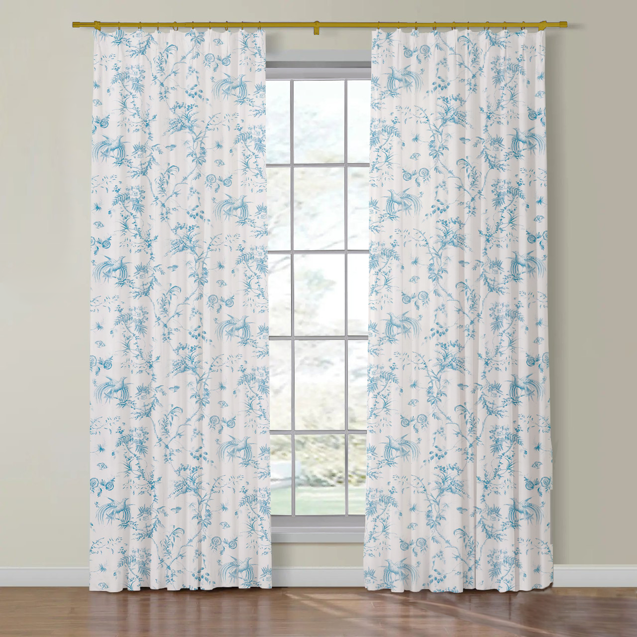 Two made to order drapery panels in Schumacher's Toile De La Prairie fabric in the following lengths: