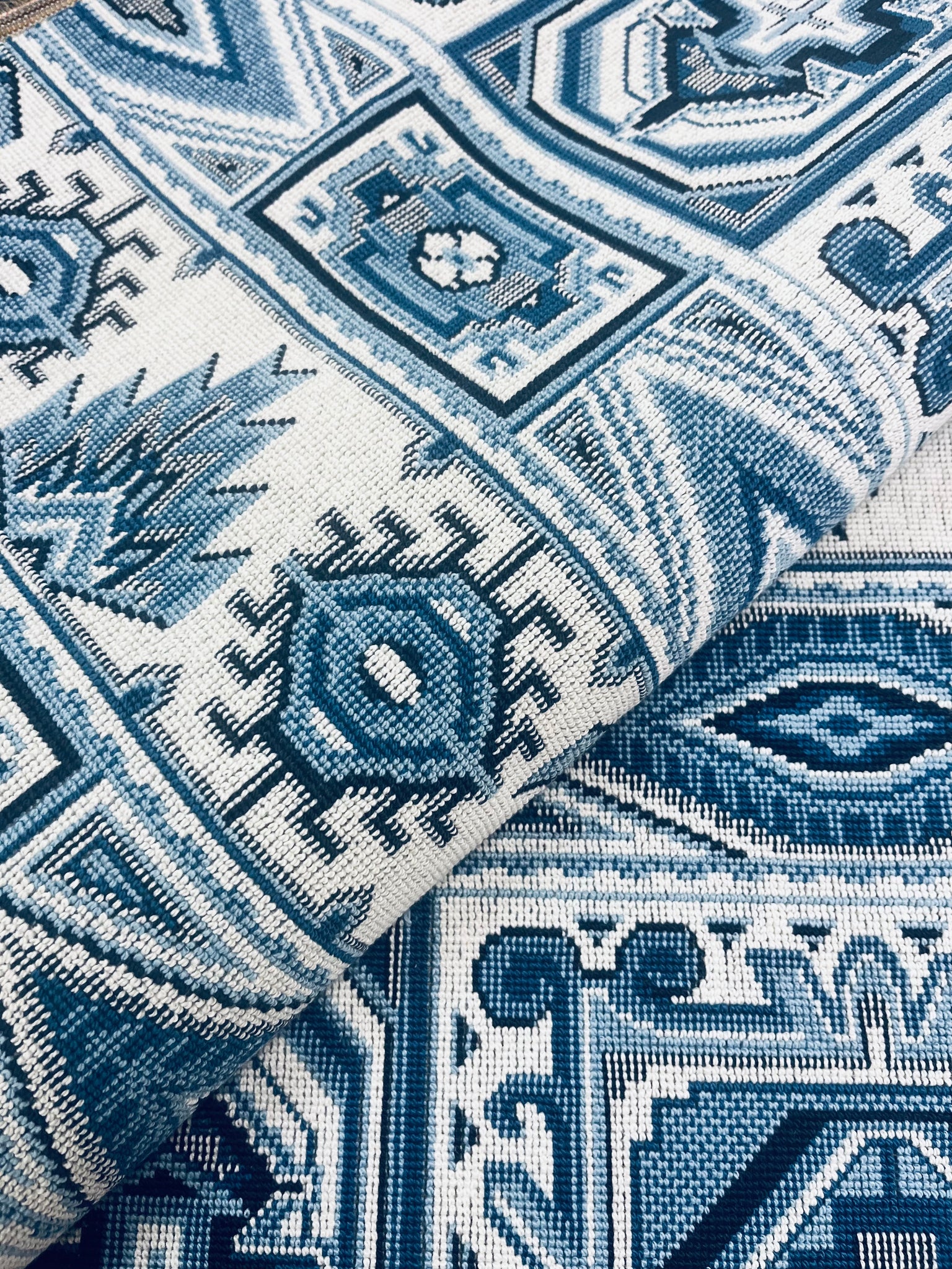 Elegant and extremely durable, Crowley Epingle in blue features a unique assemblage of interesting geometric motifs derived from antique carpets. This wonderful, mid-scale, upholstery-weight fabric has a dense loop pile, making it stand up well on pieces that get constant use.