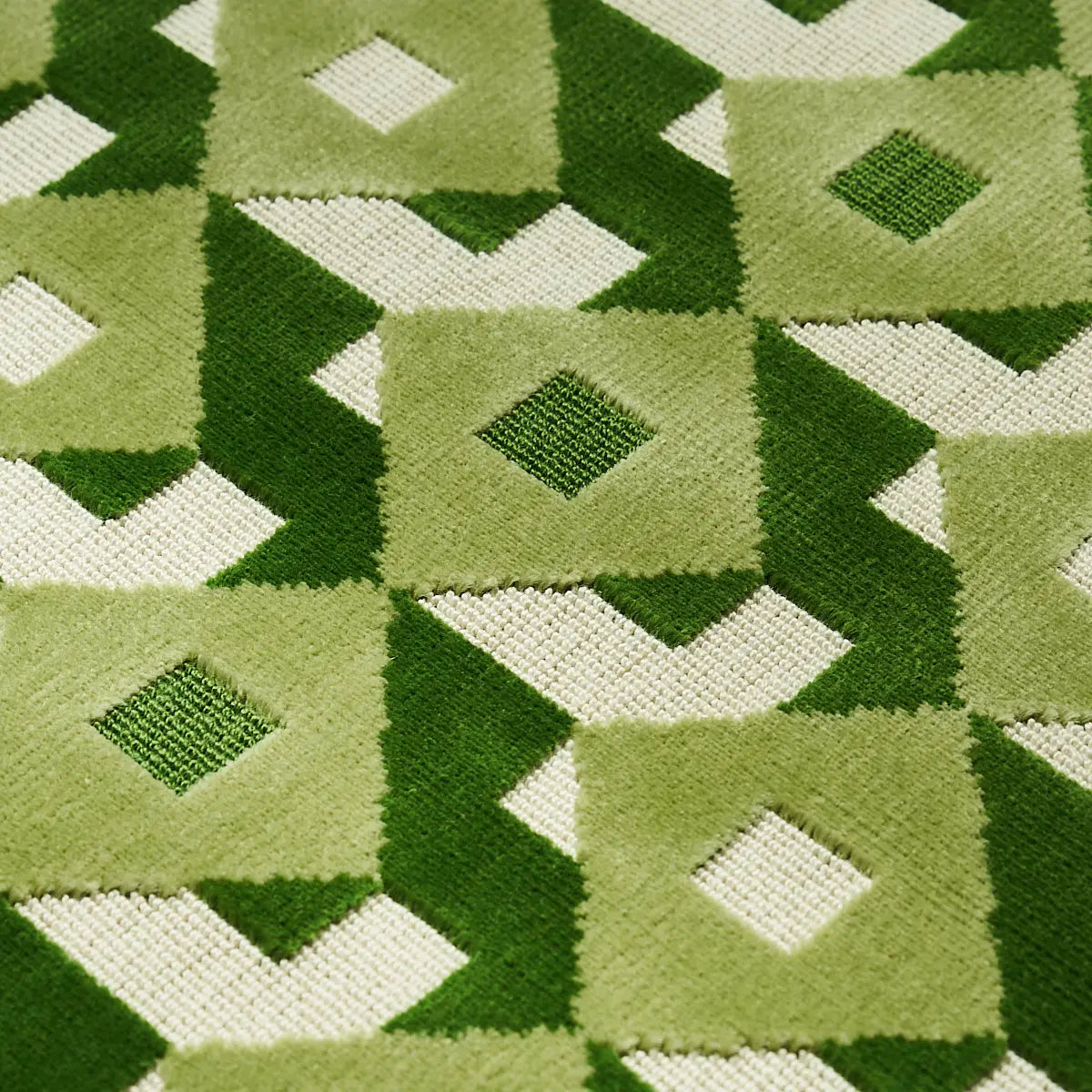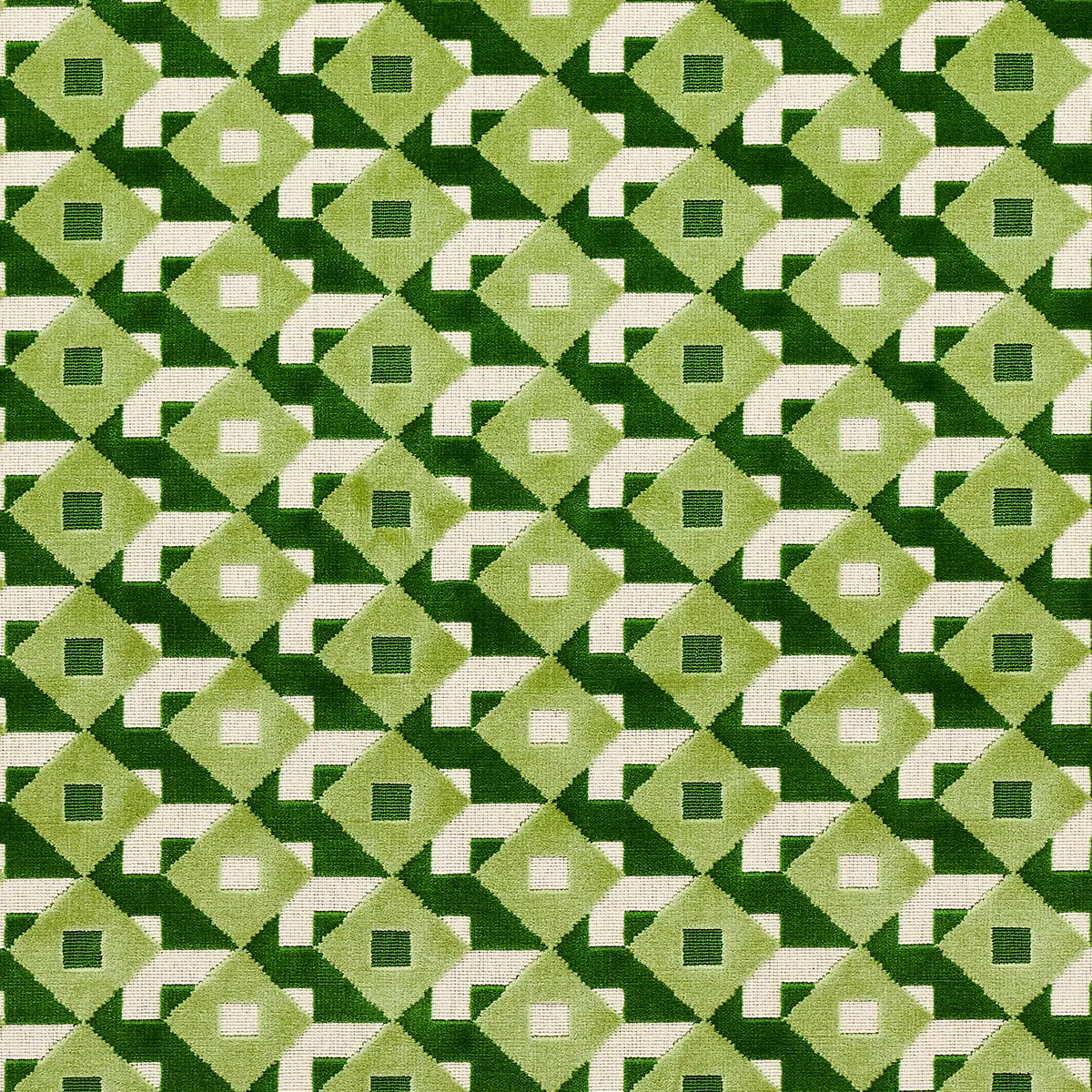 An all-over three-color geometric reminiscent of Op Art patterns is rendered in cushy cut velvet to create a supremely sophisticated upholstery fabric that will play well with others.
