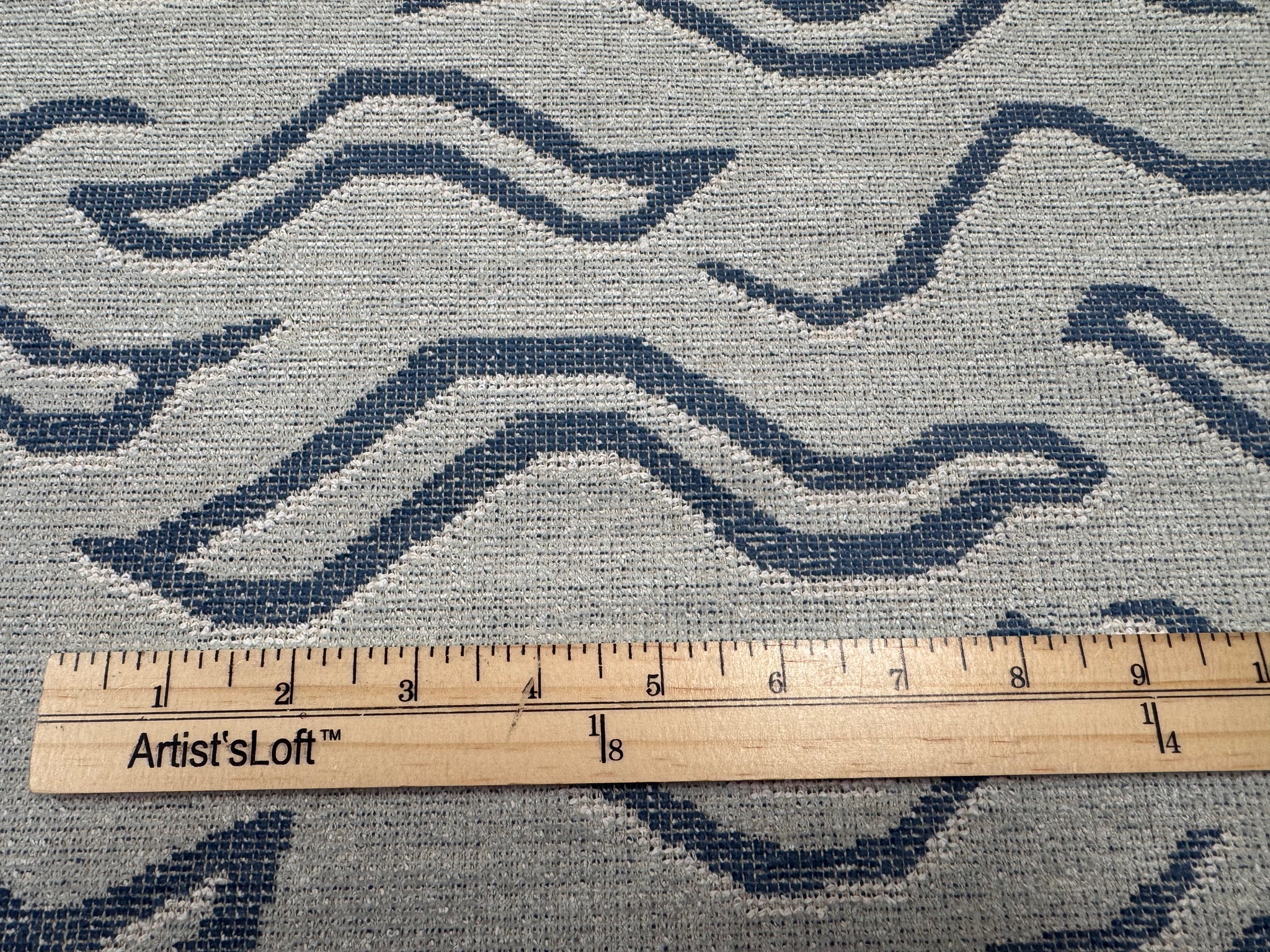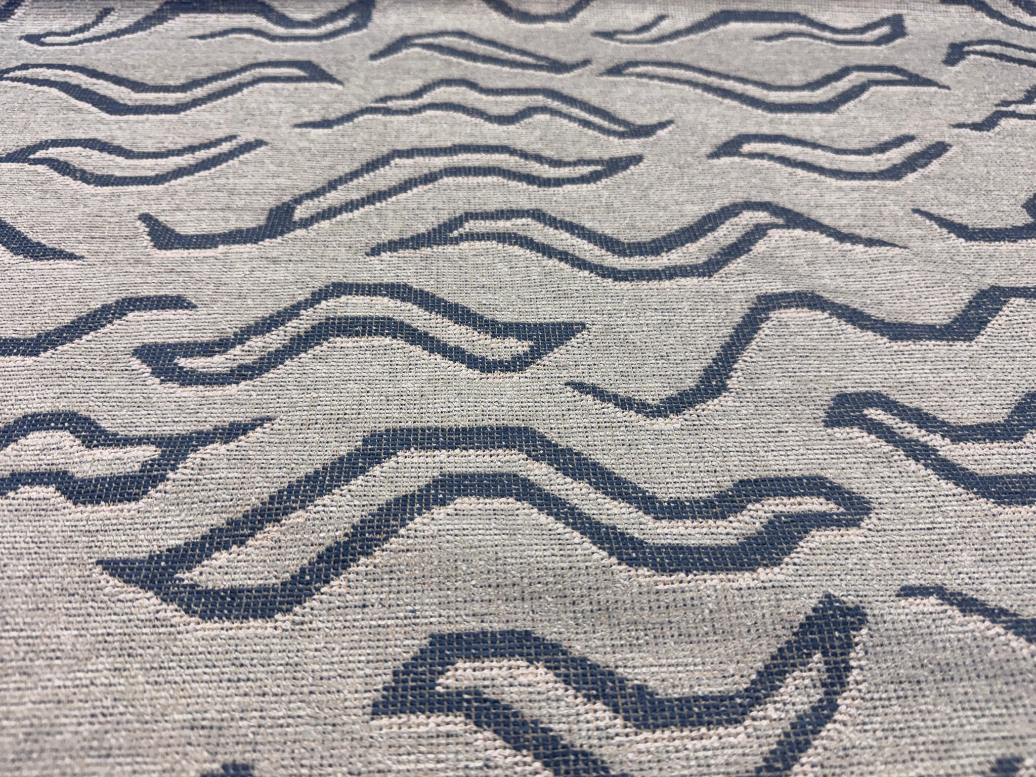 56” wide Kata in Denim from the Tapis collection by Schumacher. The design is an upholstery-weight flat weave that features an abstract interpretation of a traditional Tibetan tiger pattern. It has a textured finish, incorporating a small amount of chenille for a softer feel.
