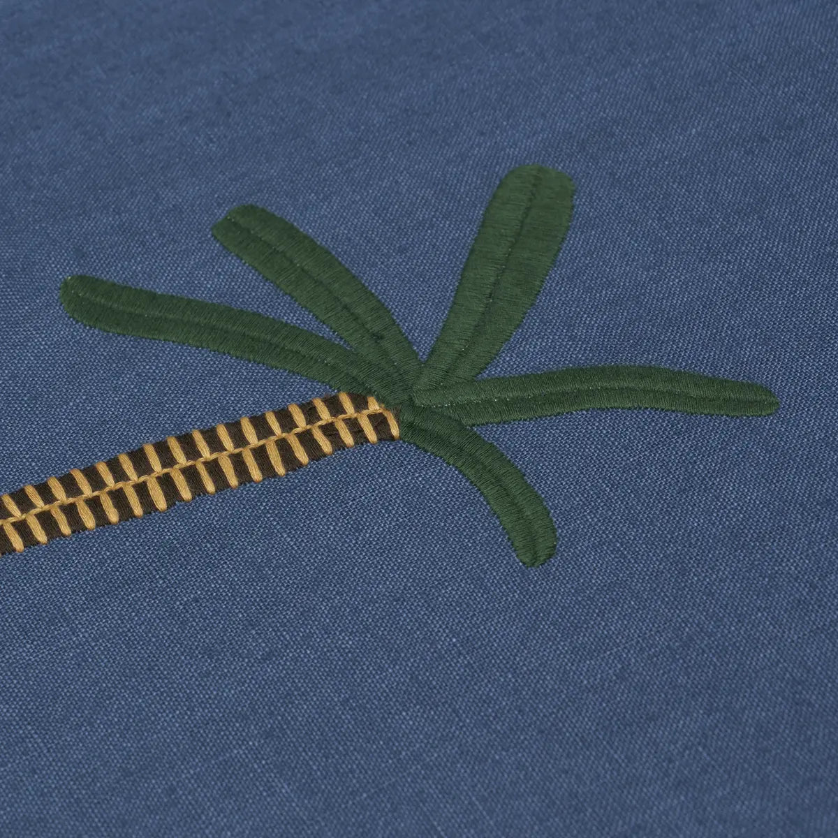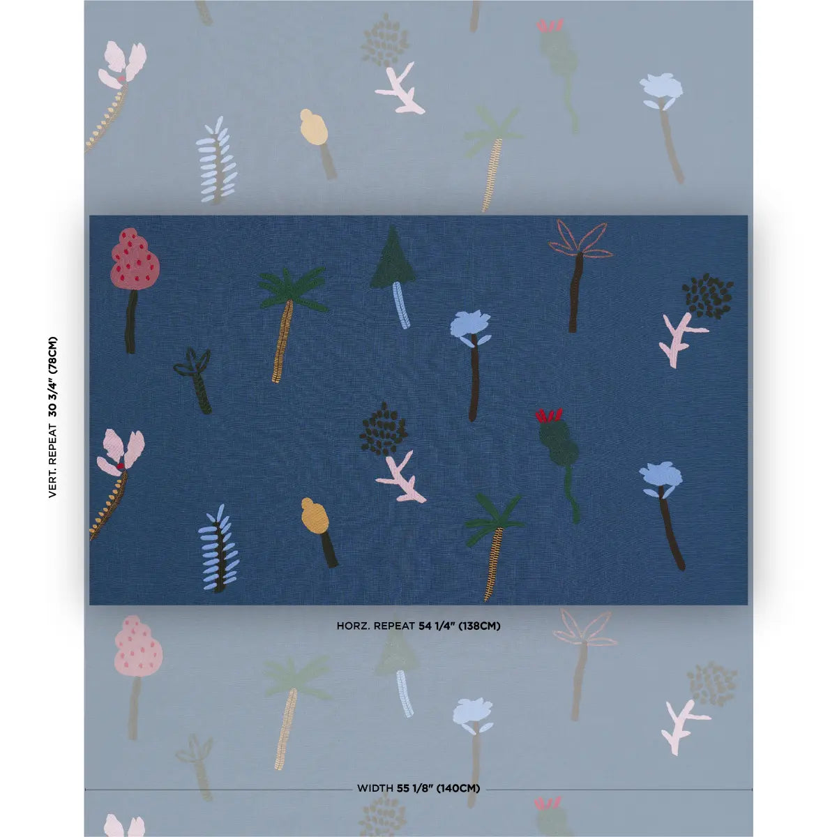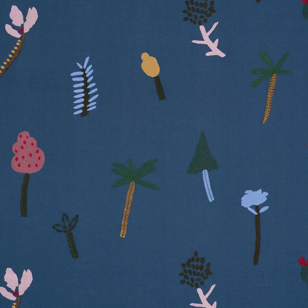Created in collaboration with Caroline Z Hurley and based on her original paintings, Tropical Trees is a whimsical embroidered design featuring palm trees, painterly blooms, and other tropical motifs stitched on an airy linen ground. This open, large-scale botanical is a playful, textural pattern ideal for window treatments.