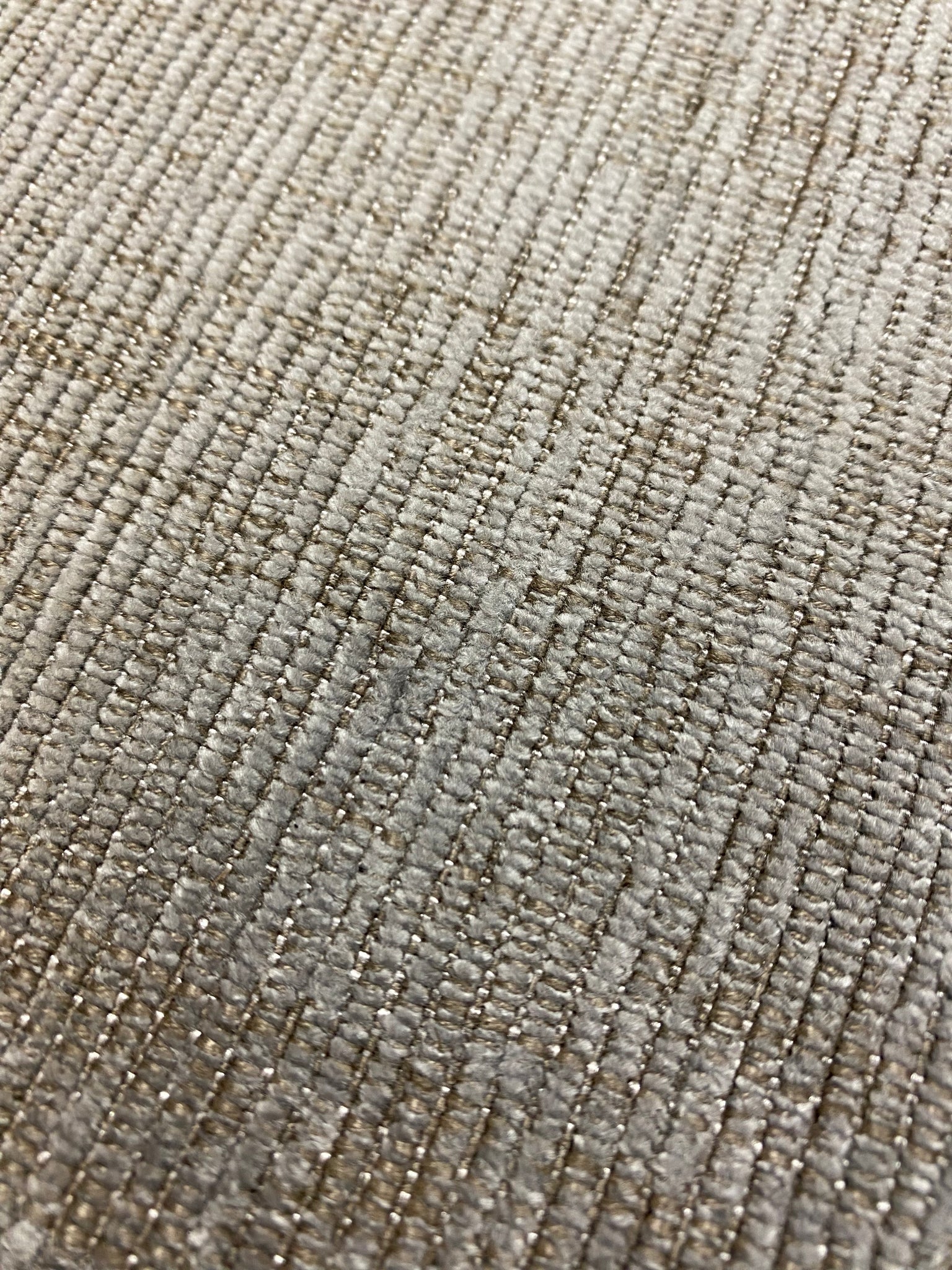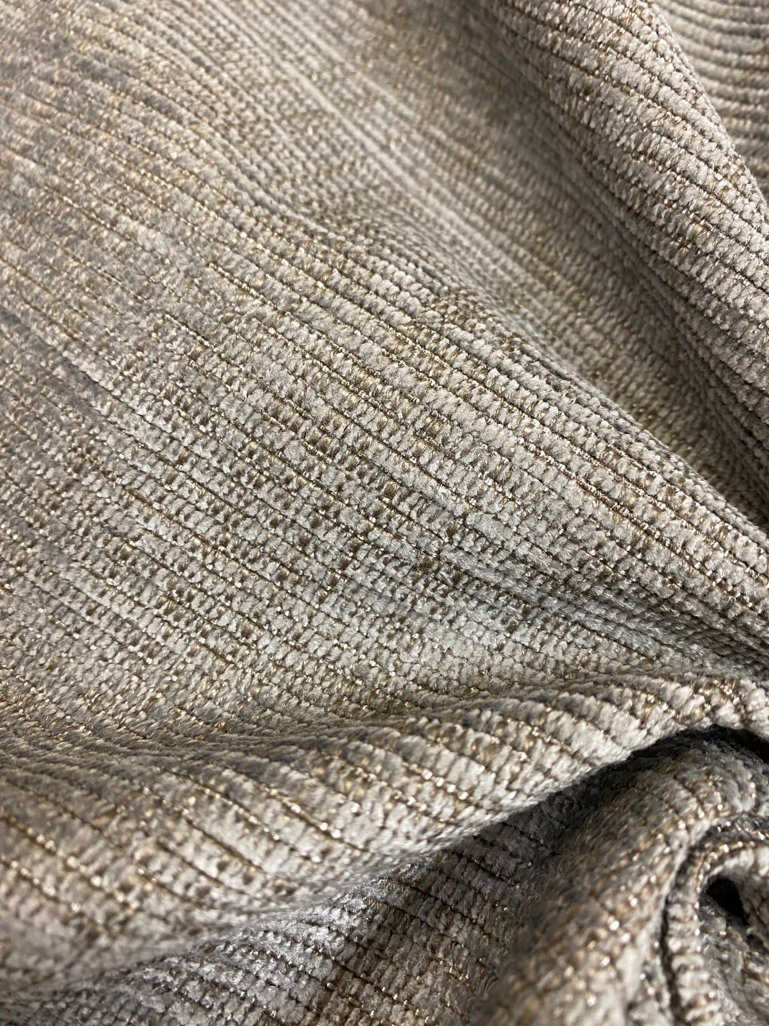 1.75 yard piece of 56" wide designer water & stain resistant textured chenille upholstery fabric in grey and taupe. Price is for entire piece. Let us know if you need more than what is available in our store.