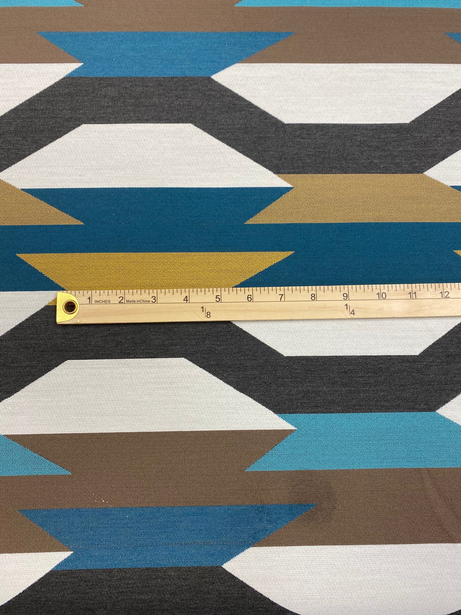56" wide Arc Com Crescendo Caribbean abstract geometric teal mustard cream water & stain resistant upholstery fabric