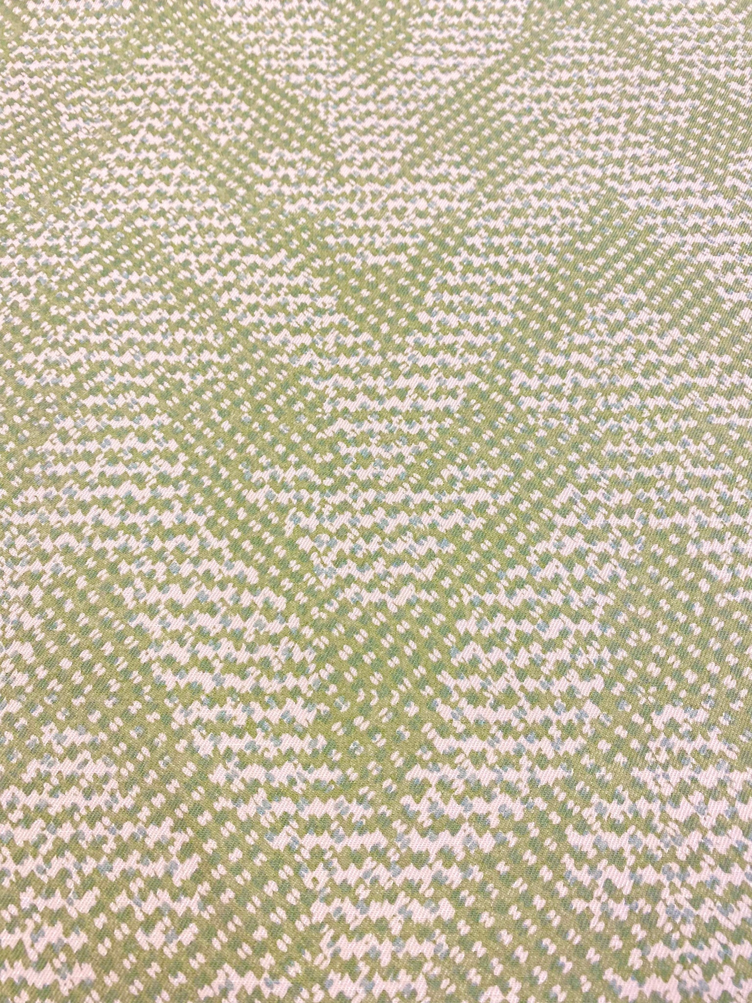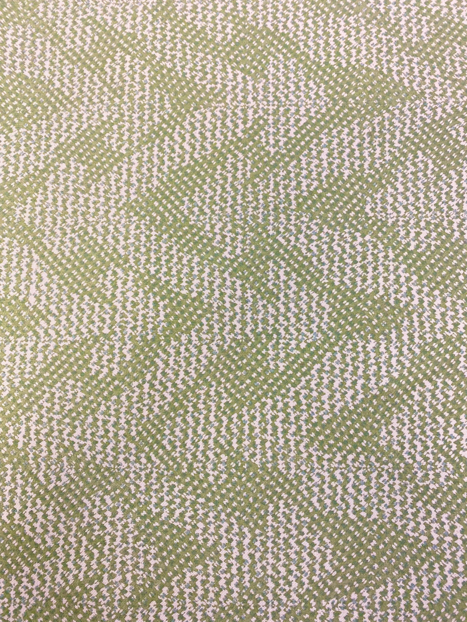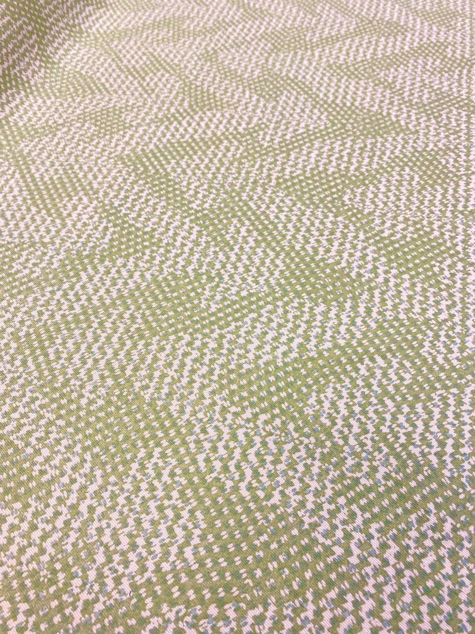 Width 54 Inches (not including a salvage). Designer cotton linen abstract upholstery fabric in cream, green and seafoam. Price is per yard. Let us know if you need more than what is available in our store.