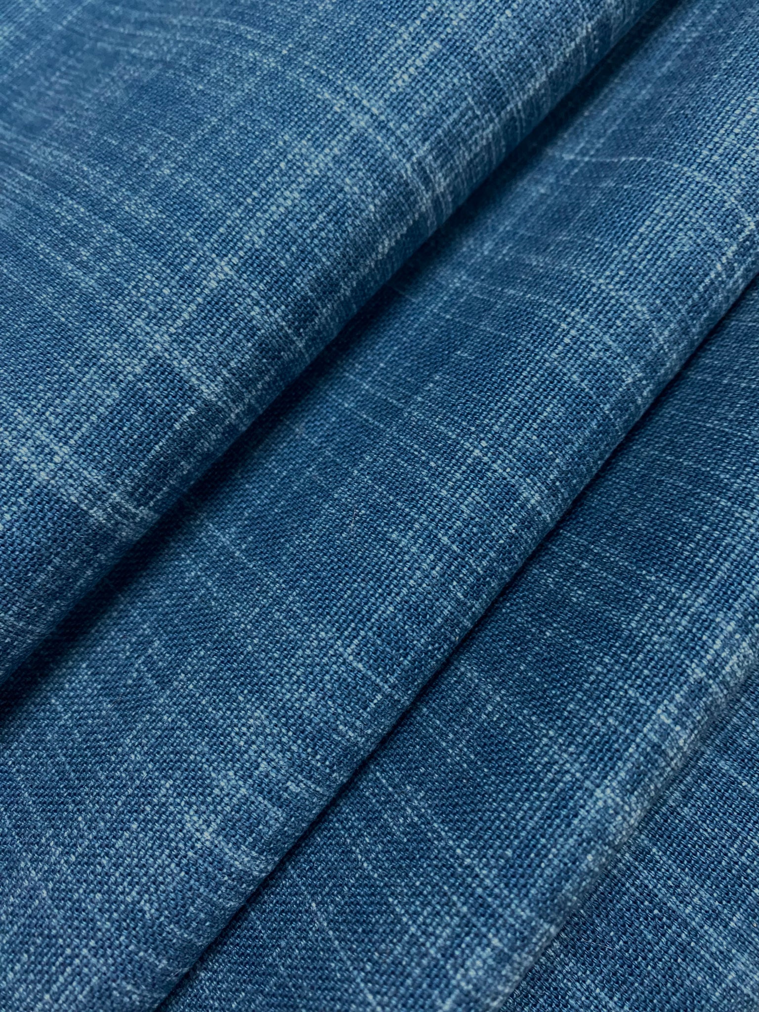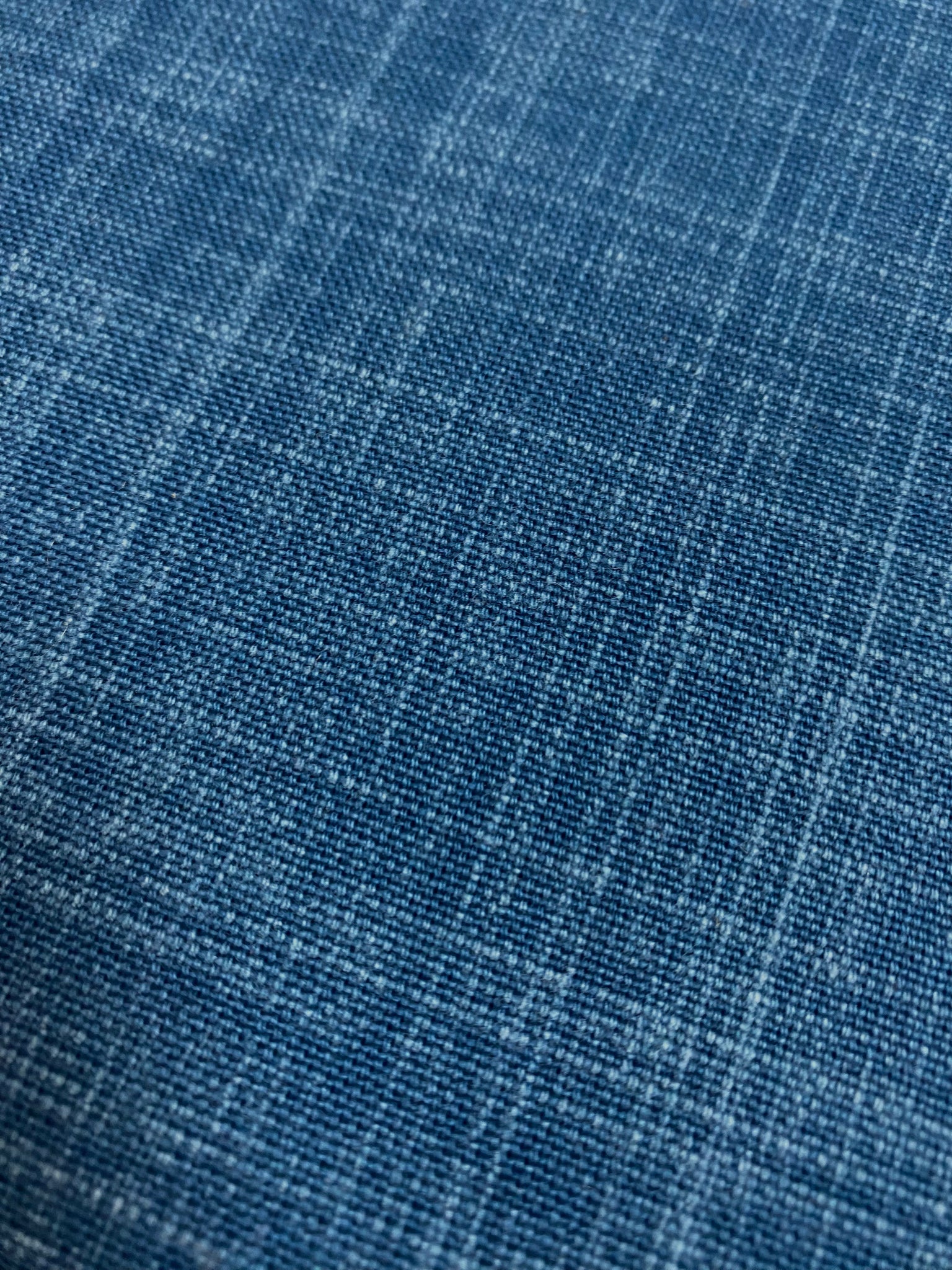 56" wide designer upholstery fabric in denim blue and navy blue. Price is per yard. Let us know if you need more than what is available in our store.