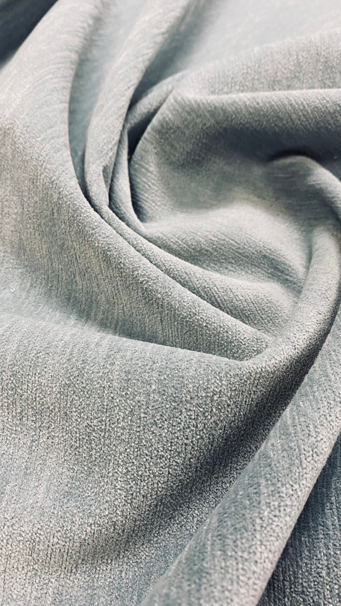 57" wide designer chenille water & stain resistant upholstery fabric in teal seafoam. Price is per yard. Let us know if you need more than what is available in our store.