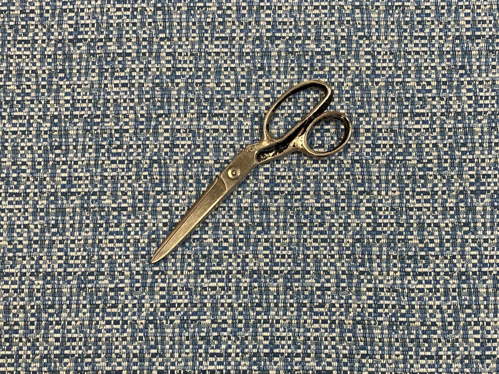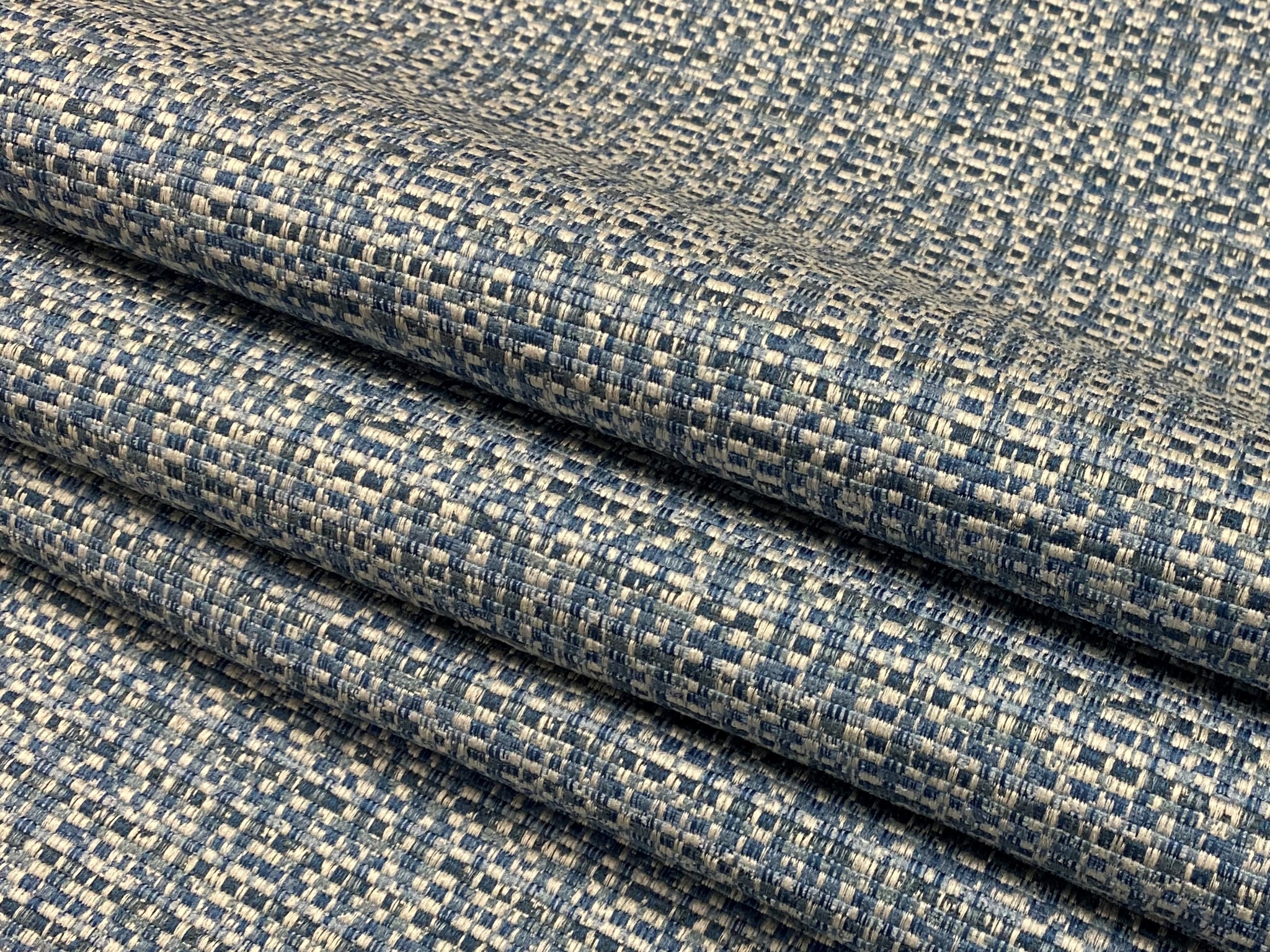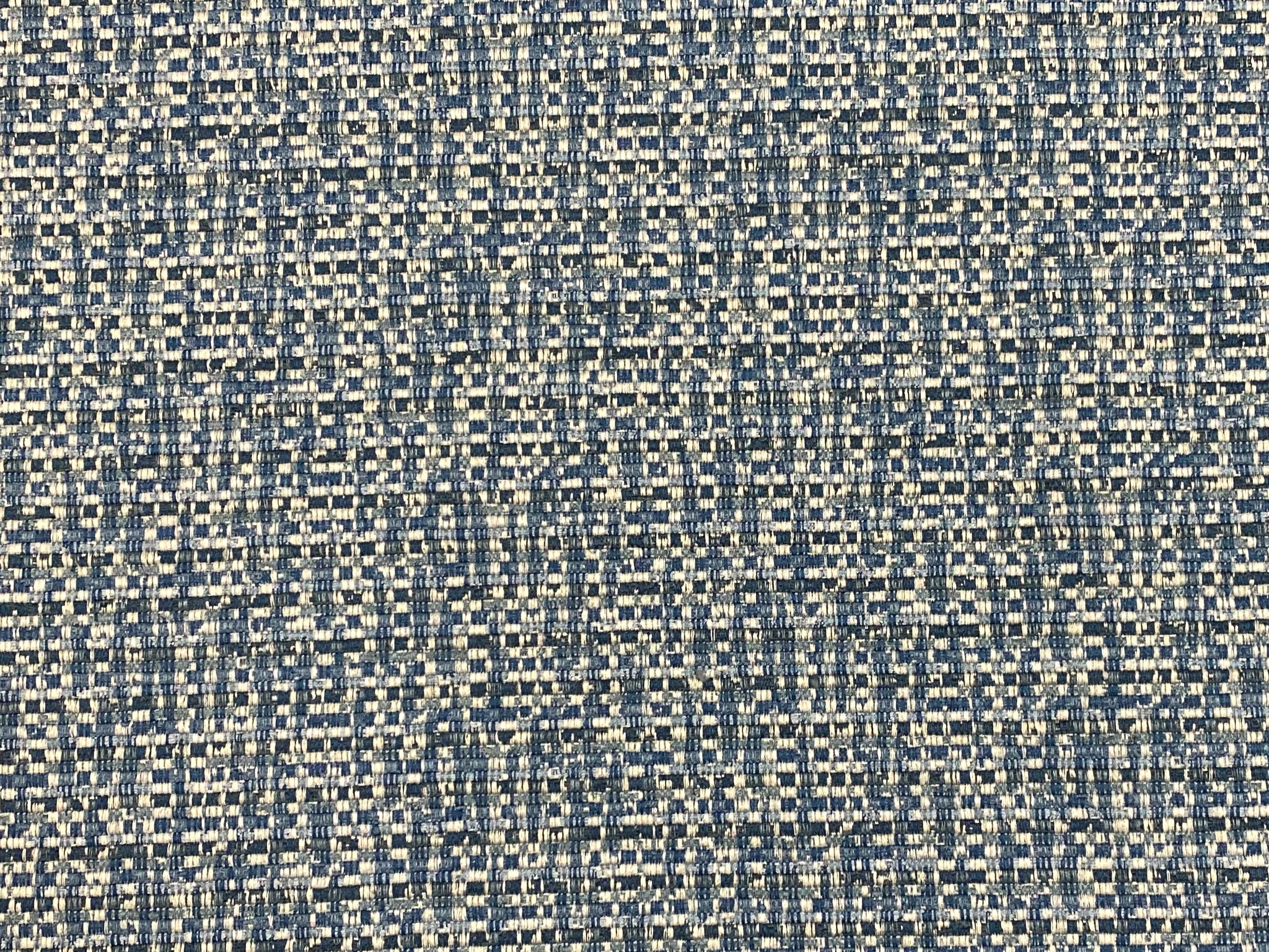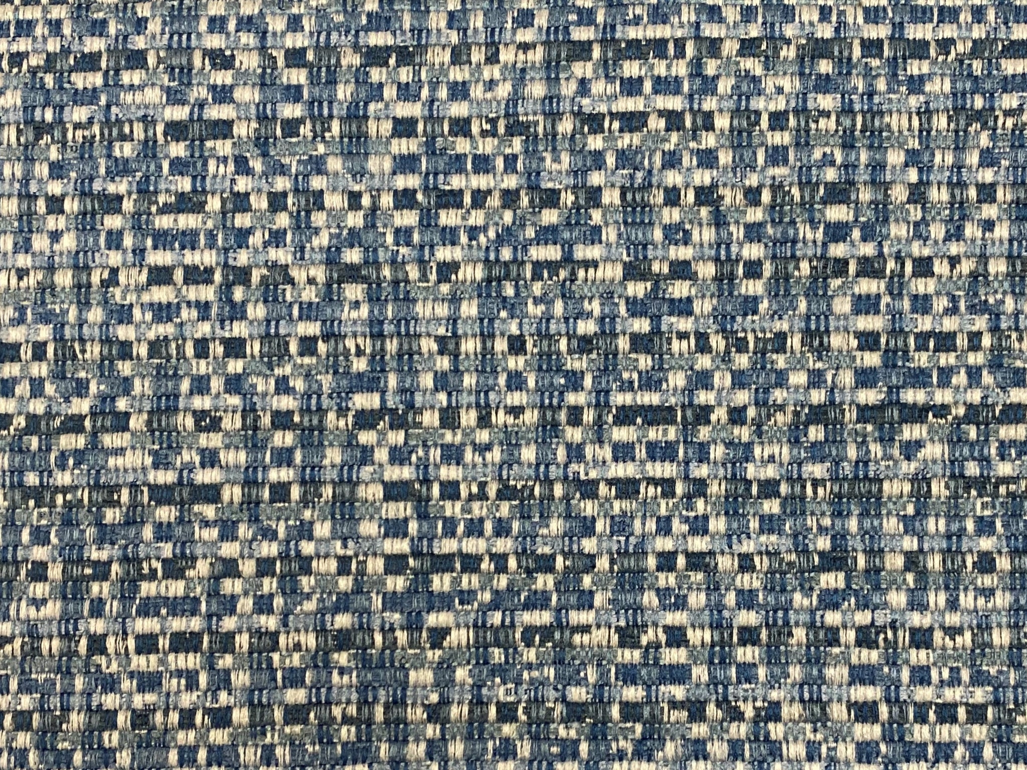 57" wide woven MCM mid century modern tweed upholstery fabric in navy blue, French blue, and off white. Price is per yard. Let us know if you need more than what is available in our store.