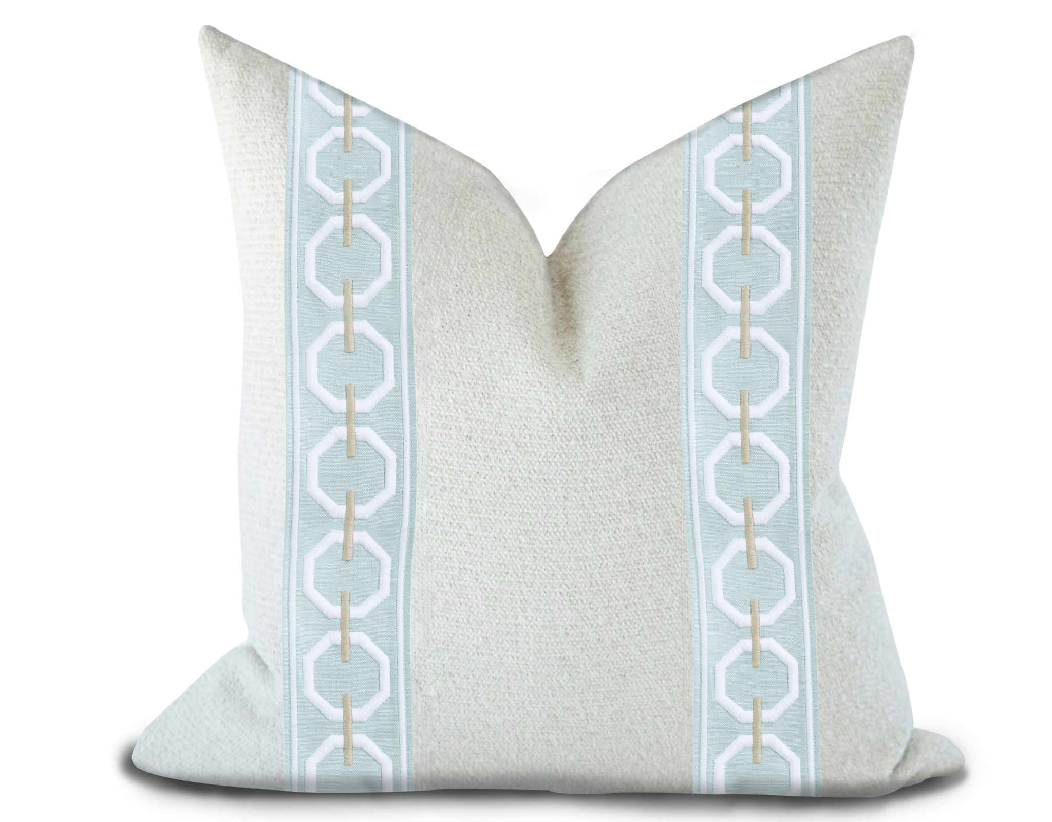 Custom Made Pillow Cover with Thibaut Katonah Tape in Mist and Linen / Self-Piping