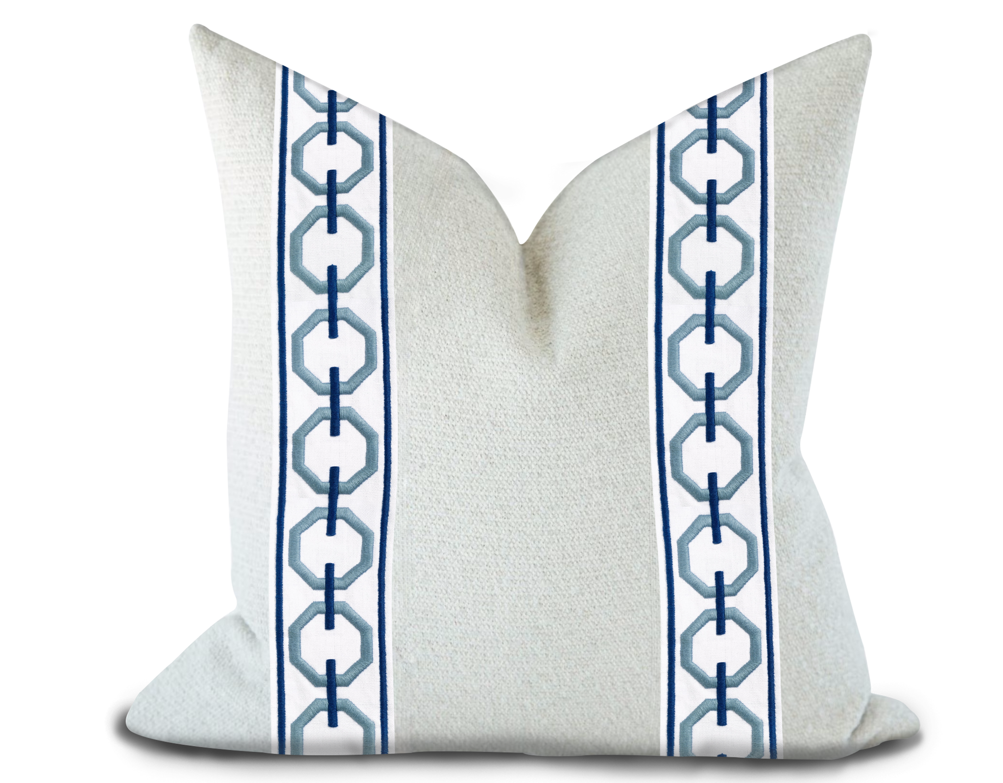 Custom Made Pillow Cover with Thibaut Katonah Tape in Sky and Bermuda / Self-Piping