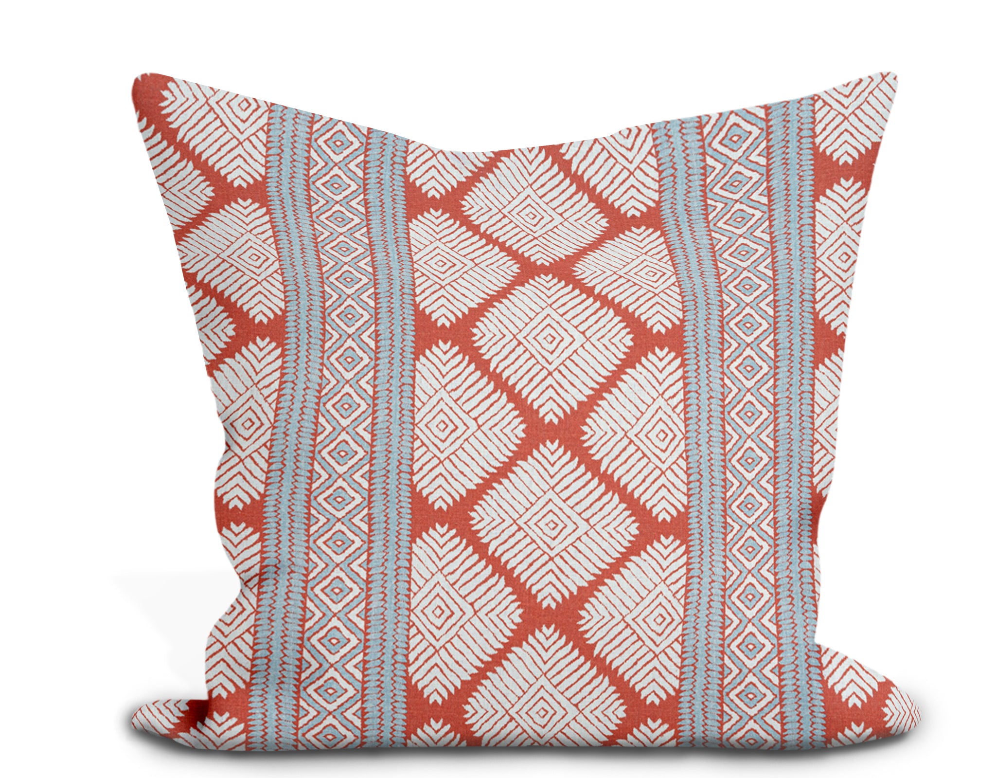 Custom made pillow cover in abstract geometric Thibaut's Austin in coral and spa blue fabric. Please choose size and other custom options from the drop down menu. Price is per single pillow cover unless purchased with insert.