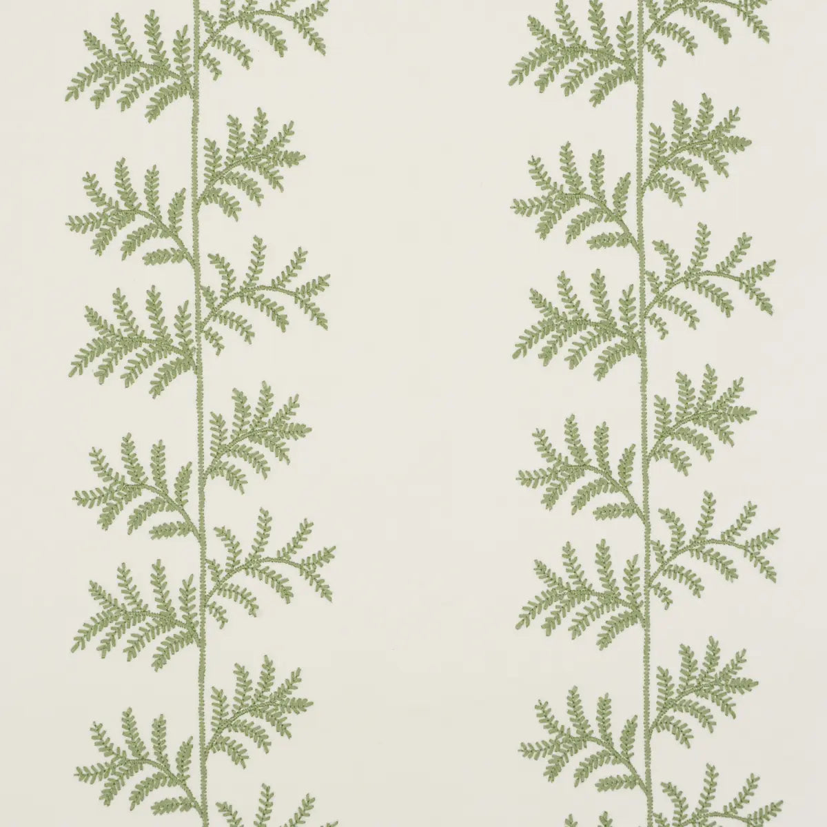 Climbing fern fronds are stitched on a paperbacked linen ground in Eloise Embroidery Wallcovering, a delicate medium-scale botanical stripe. The epitome of elegant simplicity, this delightful embroidered wallpaper adds subtle pattern and texture to walls. Also available as a fabric.