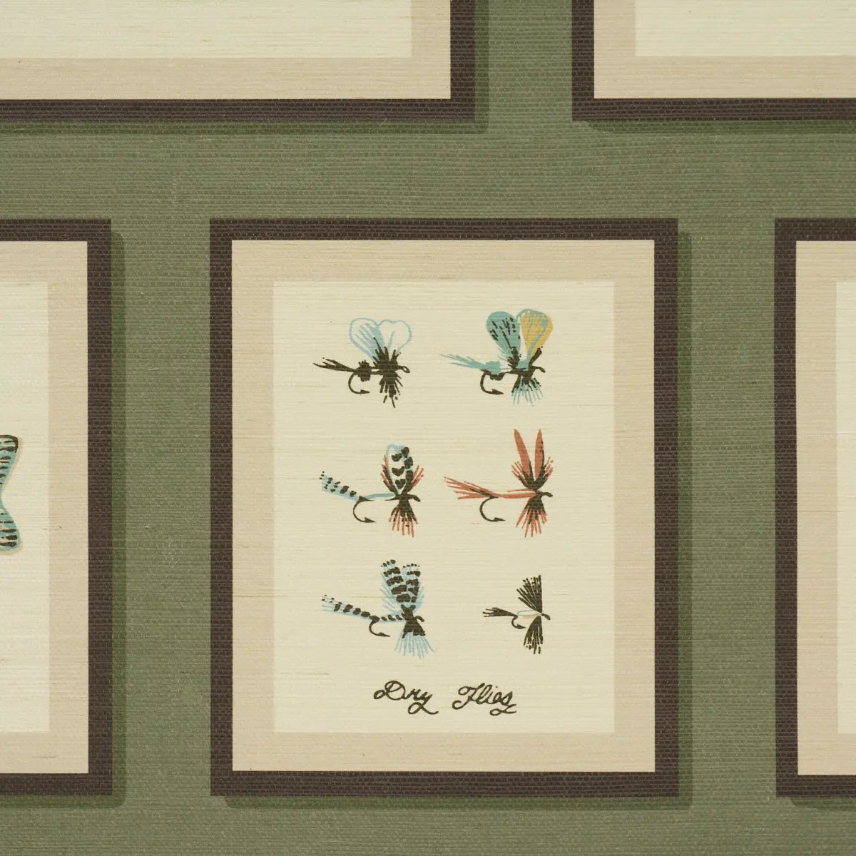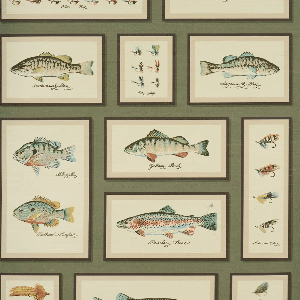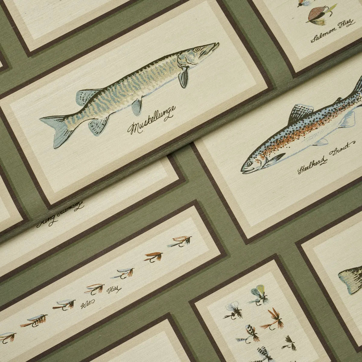 Our studio breathed new life into a documentary print when it created Jamie’s Trophies Sisal wallpaper, a fun-spirited ode to the art of angling. A salon-style arrangement of framed fish prints and feather flies is printed on a sisal ground, giving this textural large-scale trompe l’oeil its unique charm and graphic presence.