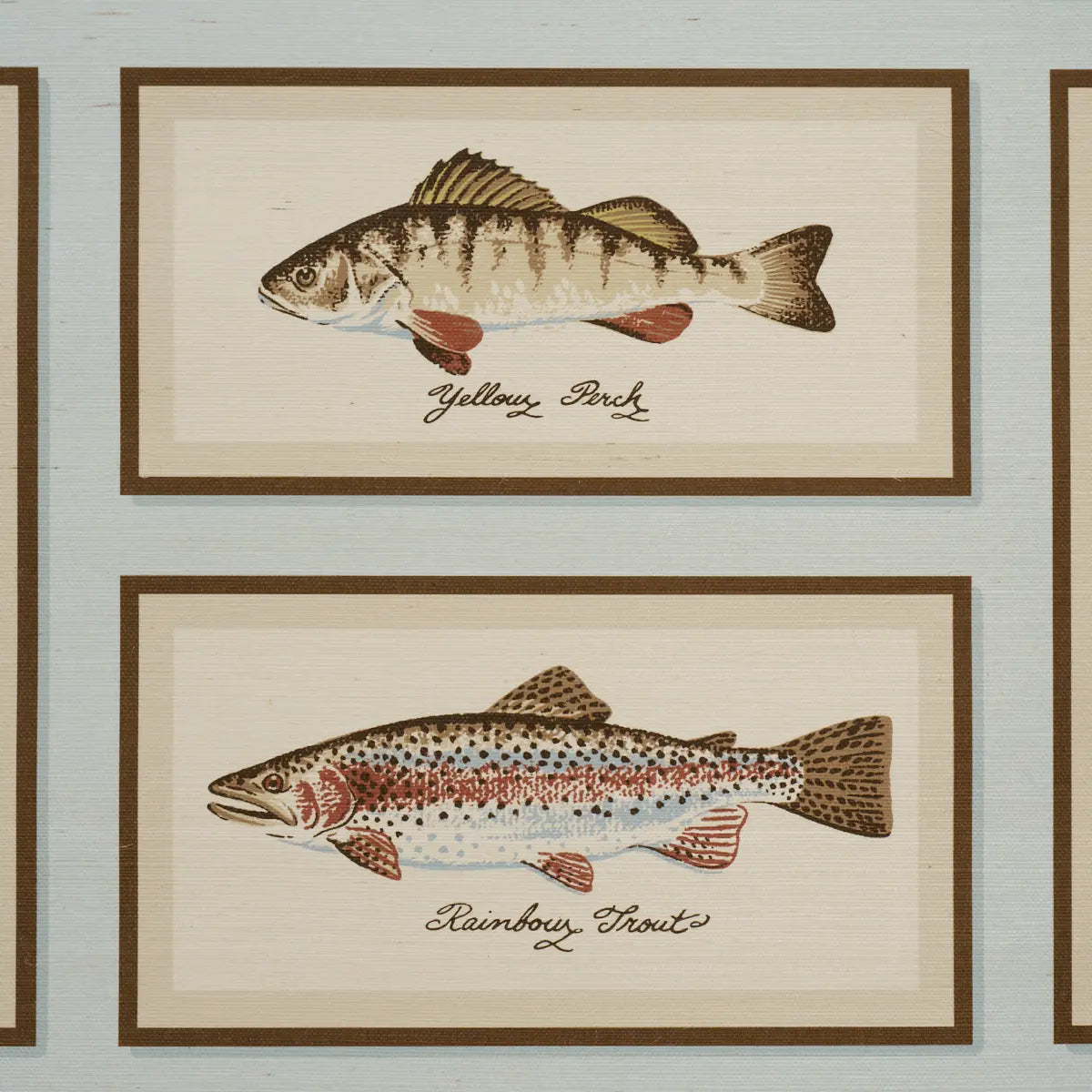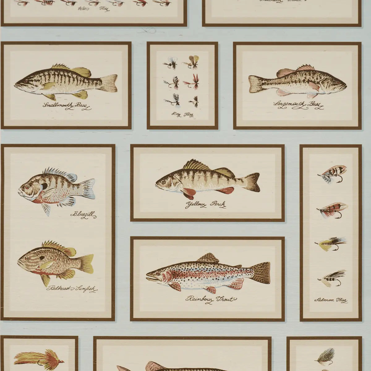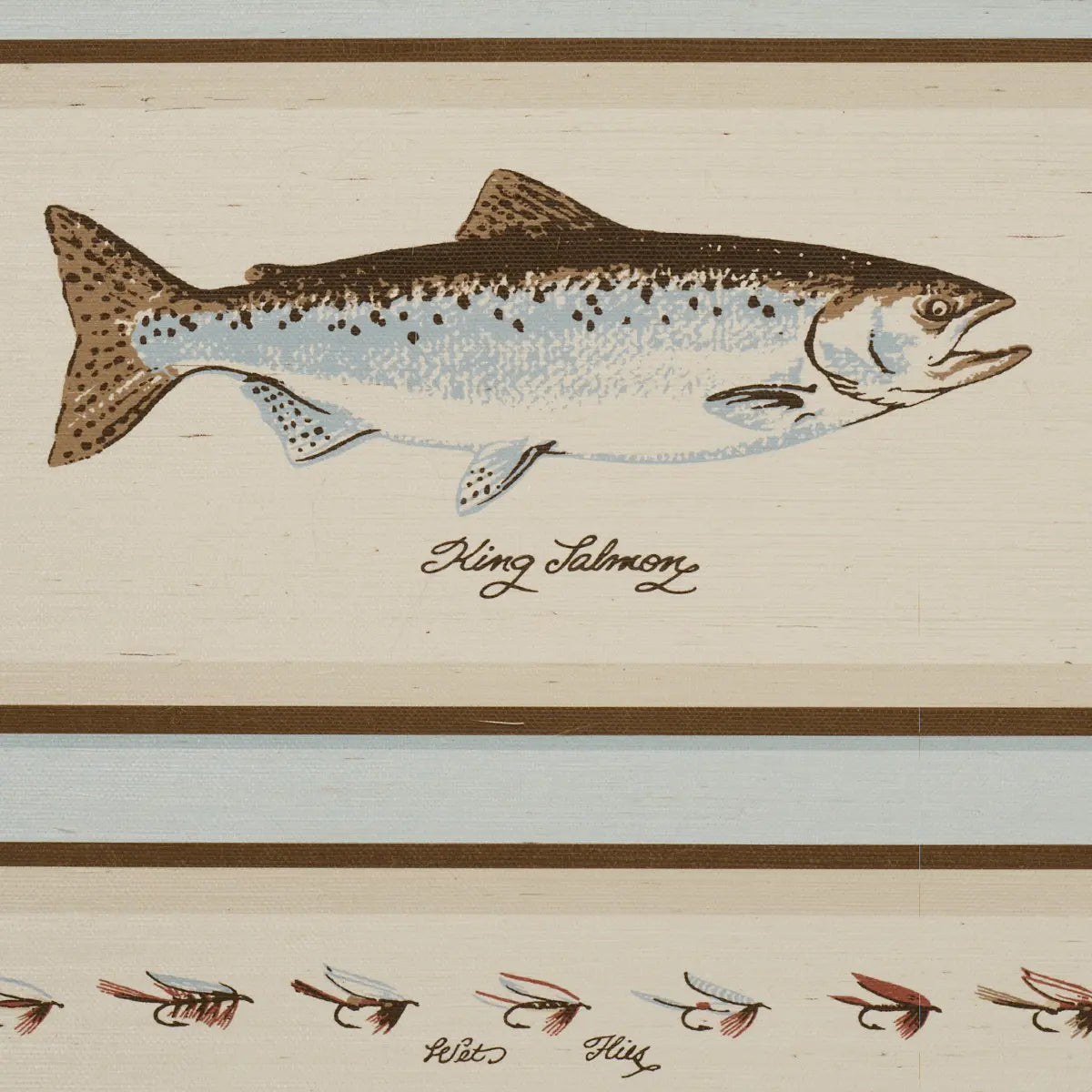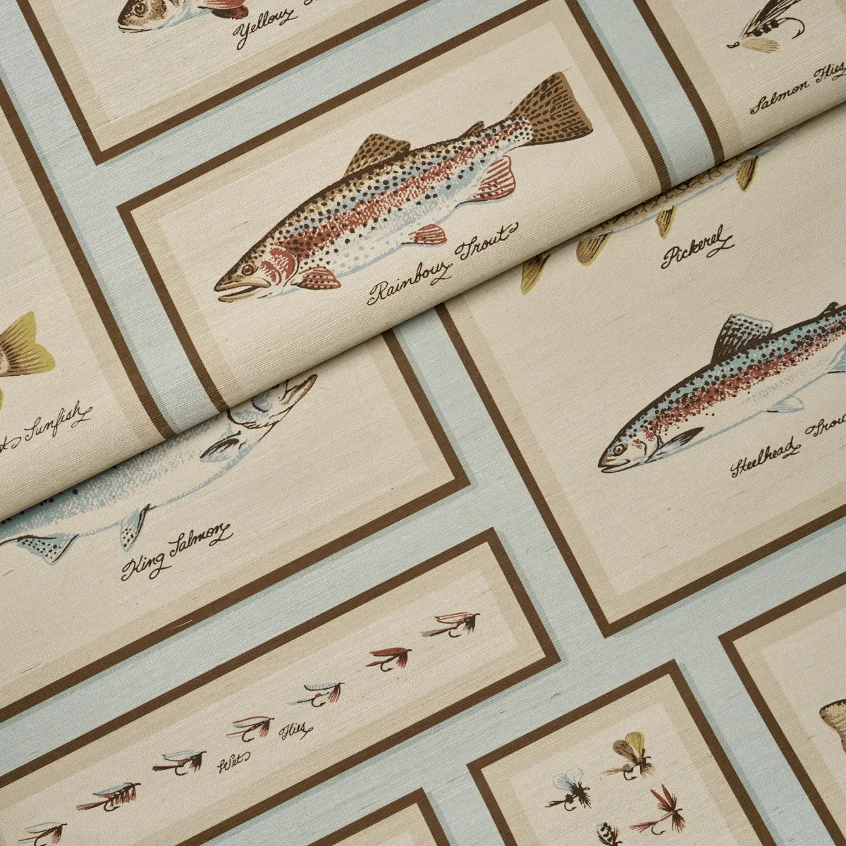 Our studio breathed new life into a documentary print when it created Jamie’s Trophies Sisal wallpaper, a fun-spirited ode to the art of angling. A salon-style arrangement of framed fish prints and feather flies is printed on a sisal ground, giving this textural large-scale trompe l’oeil its unique charm and graphic presence.