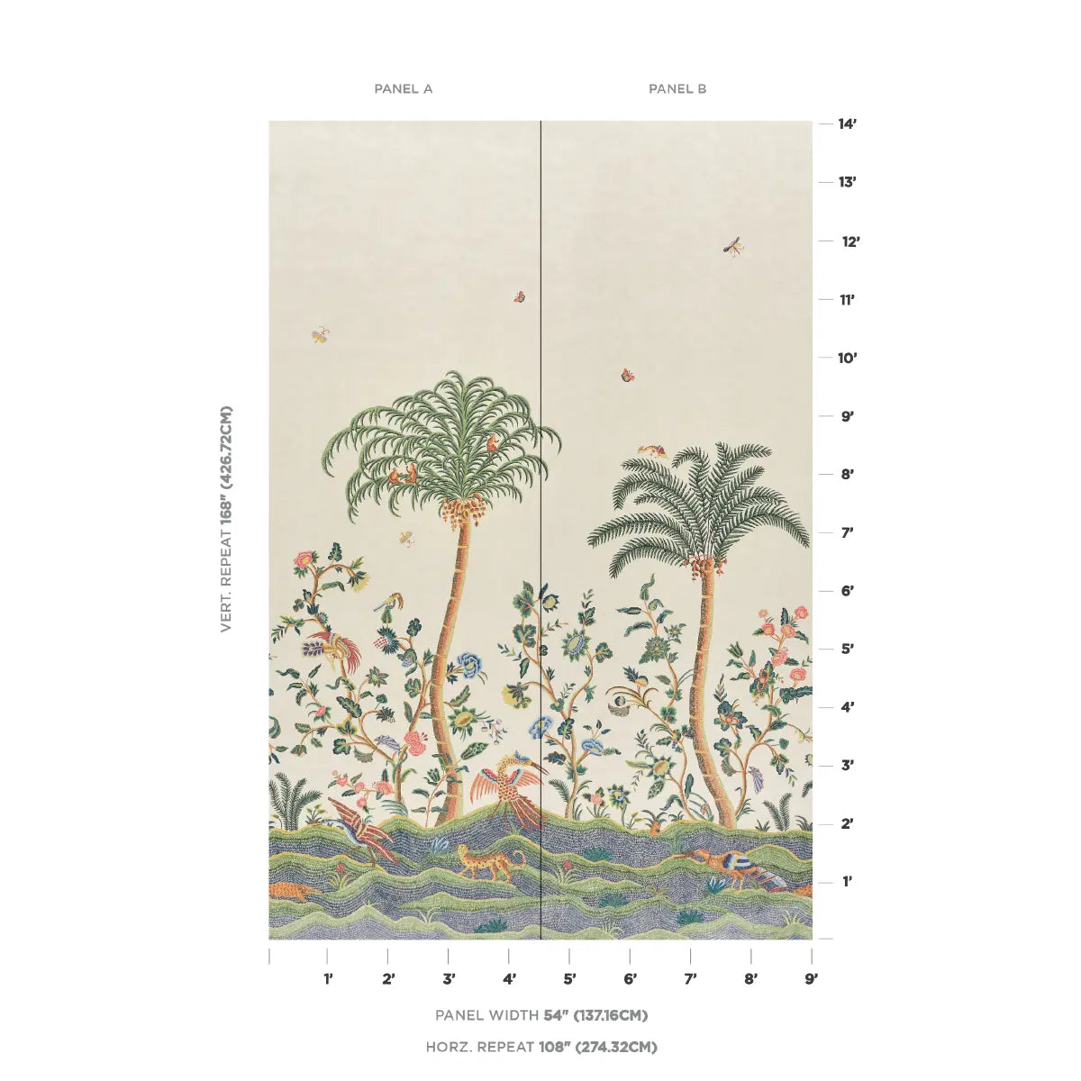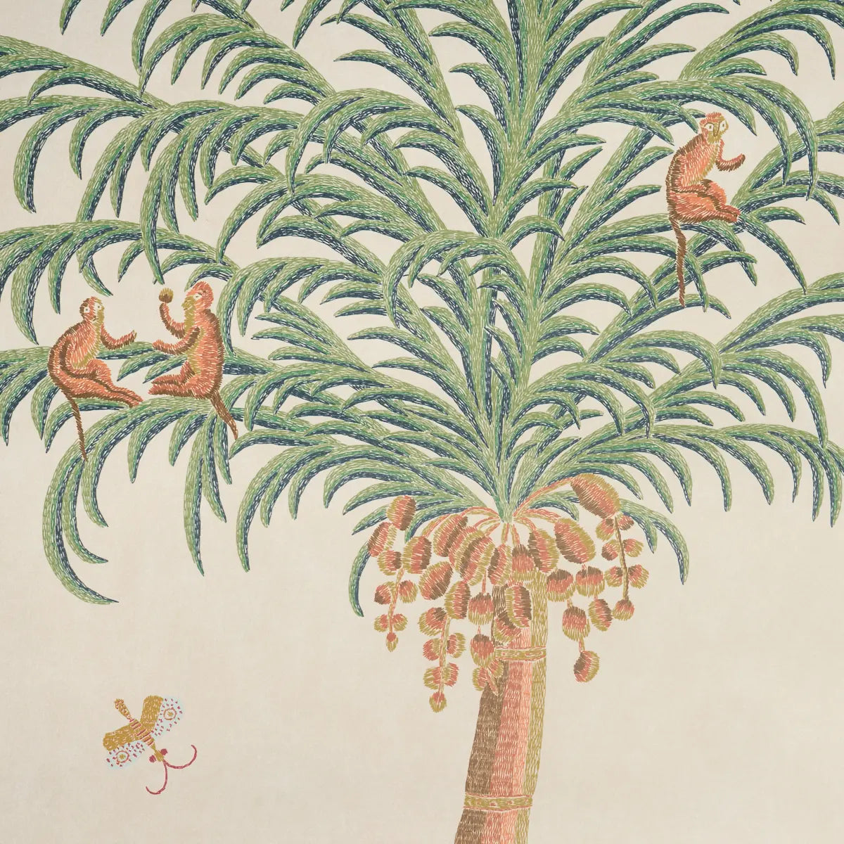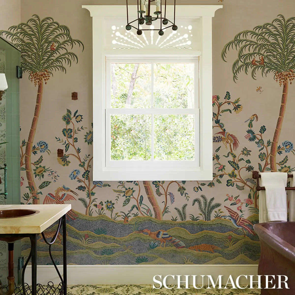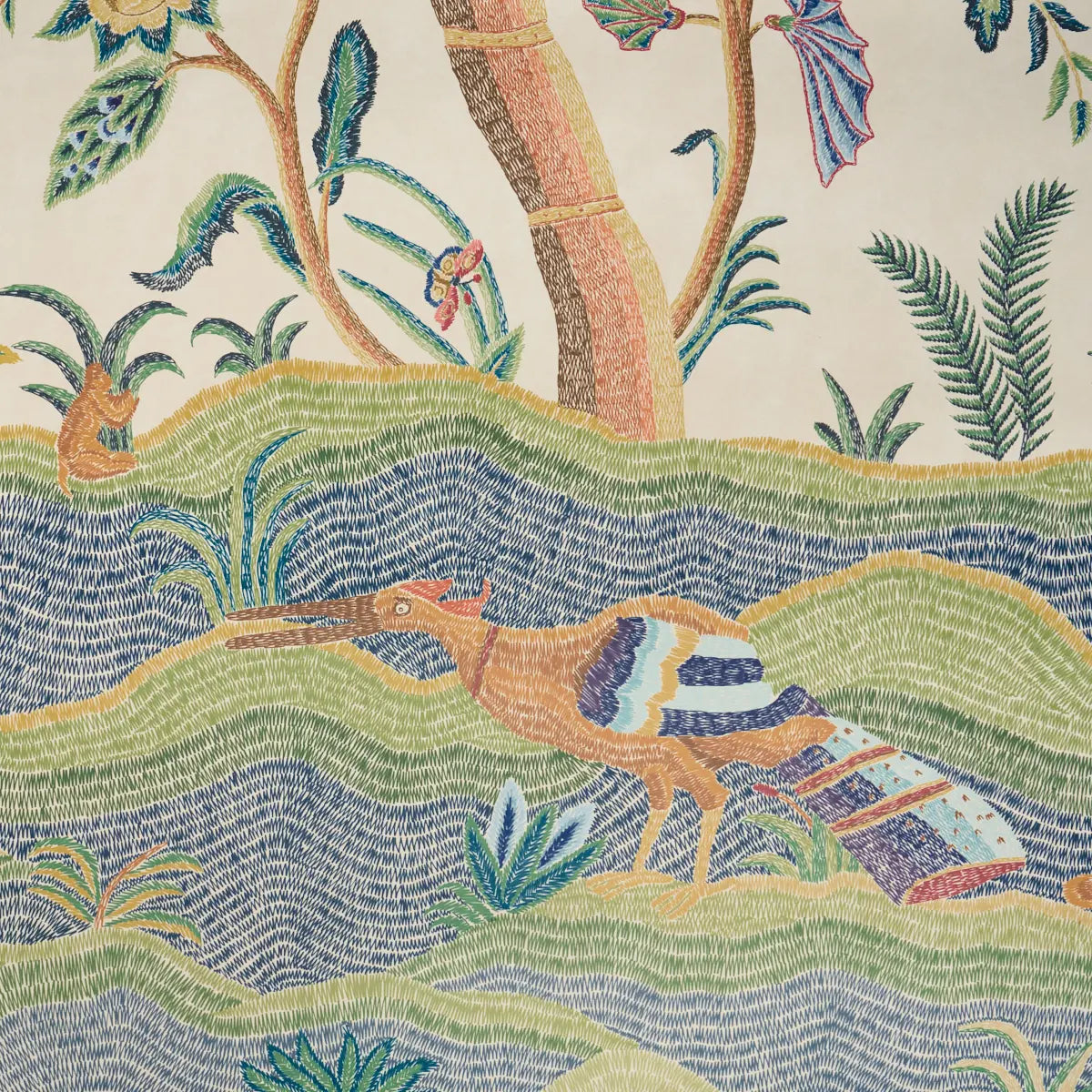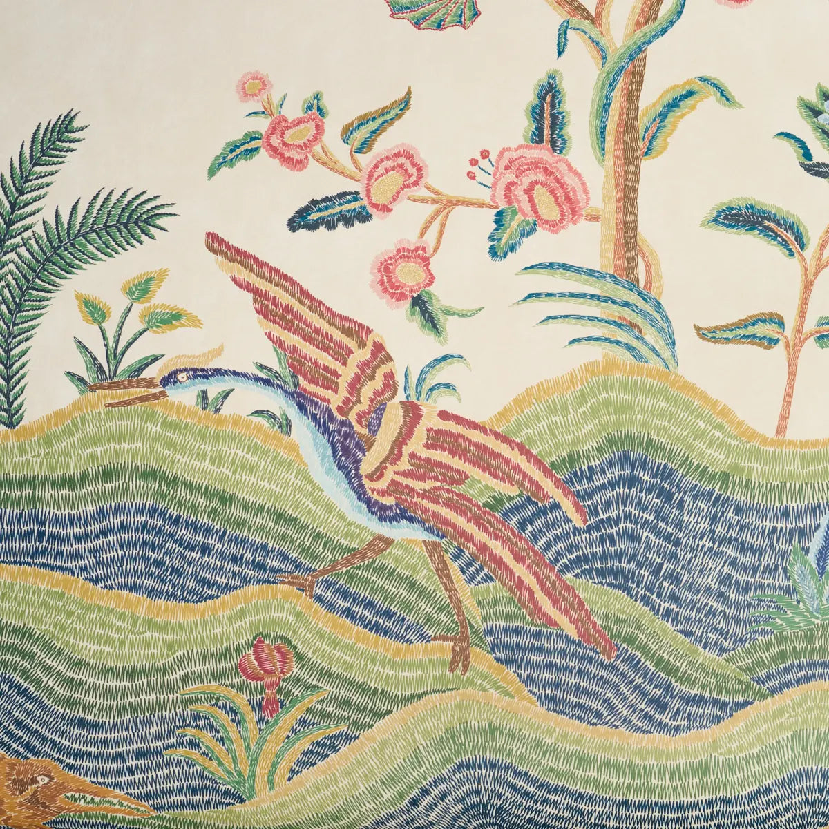 Inspired by a marvelous 18th-century crewelwork panel in the Colonial Williamsburg Foundation archive and featuring a scene hand-painted in our studio, Spotswood Crewel Panel Set is a colorful large-scale design with the three-dimensional look of an embroidered textile. Populated with a whimsical array of fanciful birds, monkeys, flowers, and foliage, this two-panel wallpaper creates a uniquely lively and exotic atmosphere.