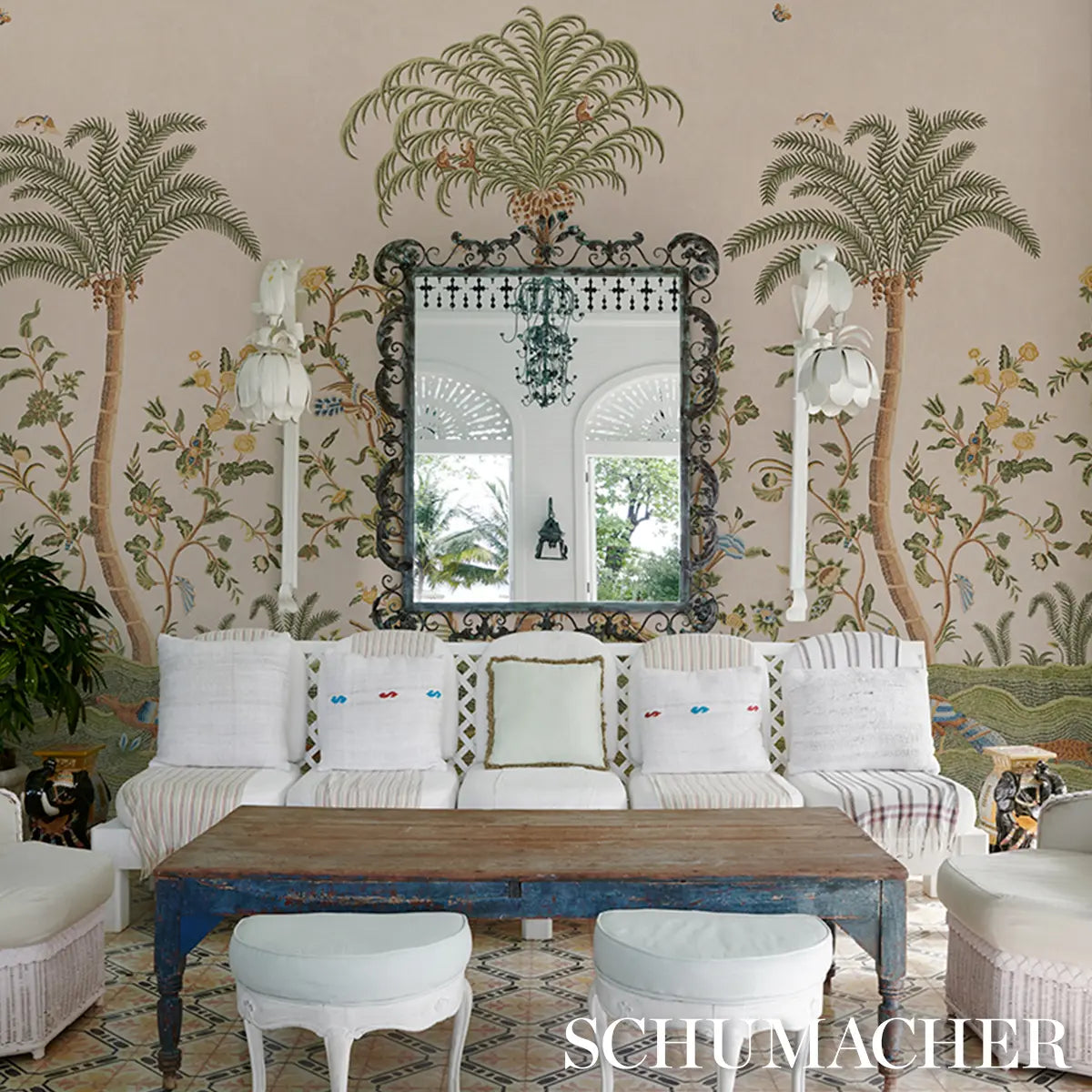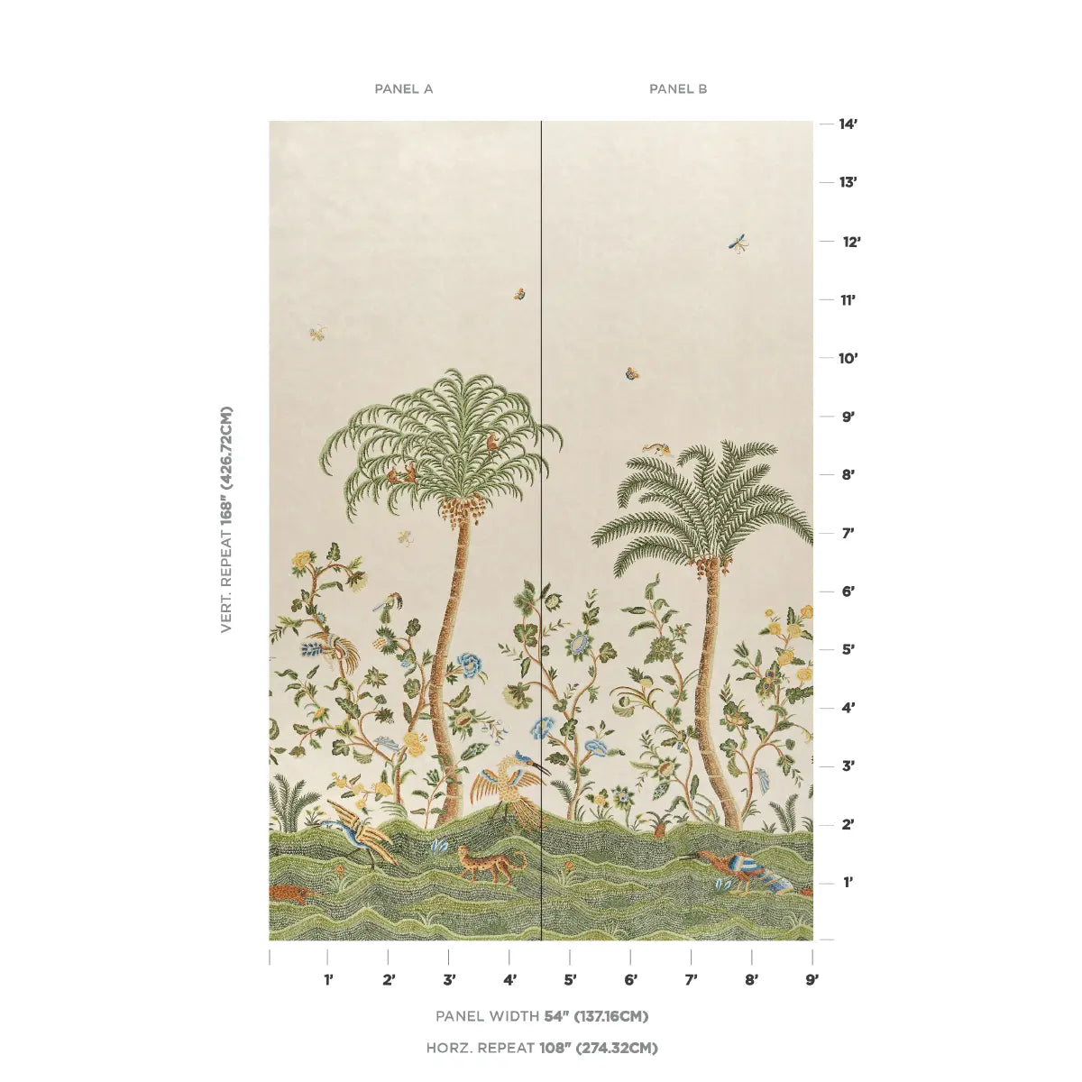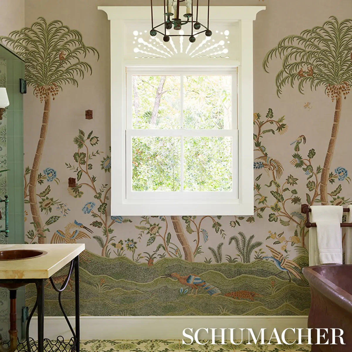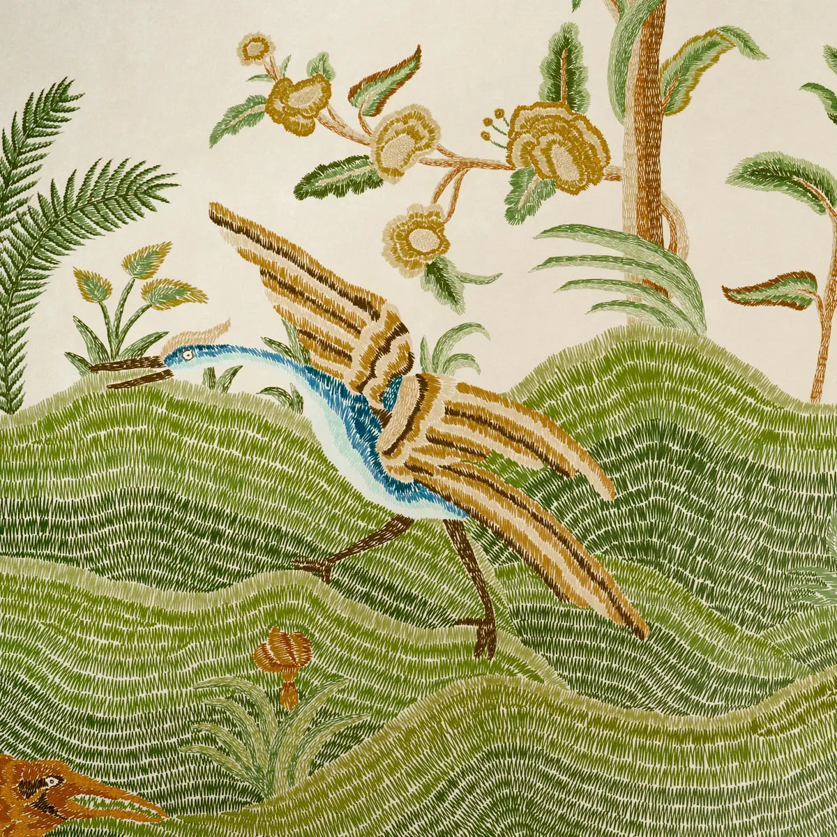 Inspired by a marvelous 18th-century crewelwork panel in the Colonial Williamsburg Foundation archive and featuring a scene hand-painted in our studio, Spotswood Crewel Panel Set is a colorful large-scale design with the three-dimensional look of an embroidered textile. Populated with a whimsical array of fanciful birds, monkeys, flowers, and foliage, this two-panel wallpaper creates a uniquely lively and exotic atmosphere.