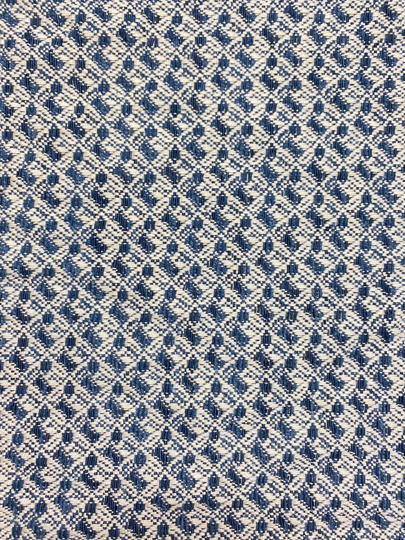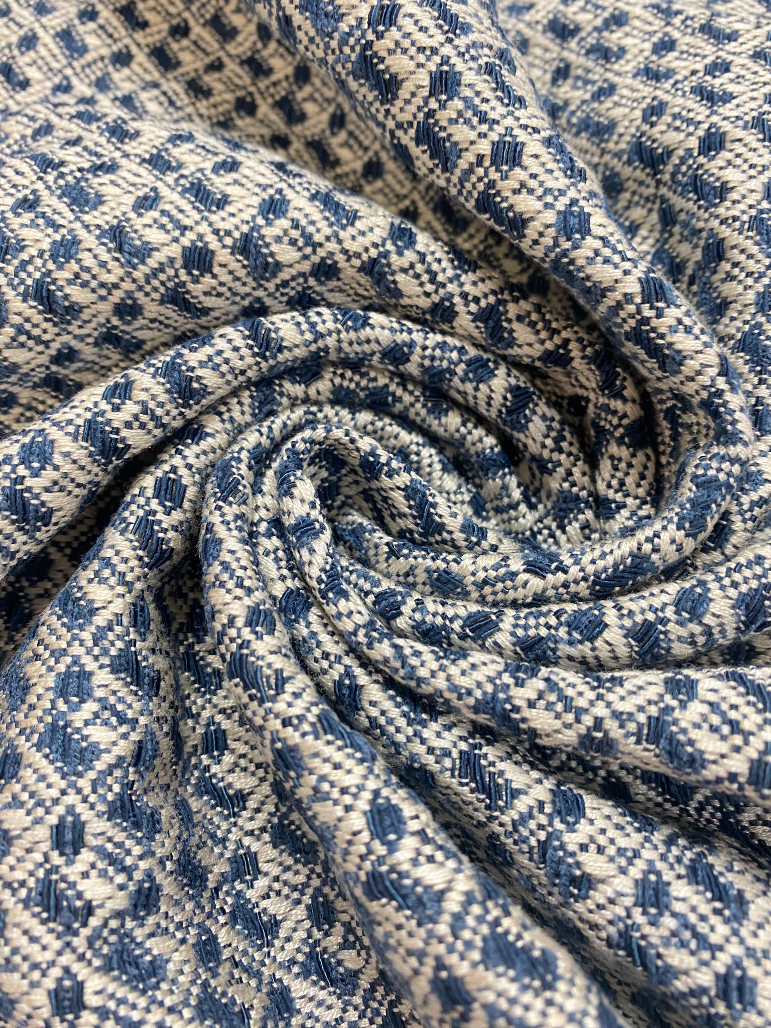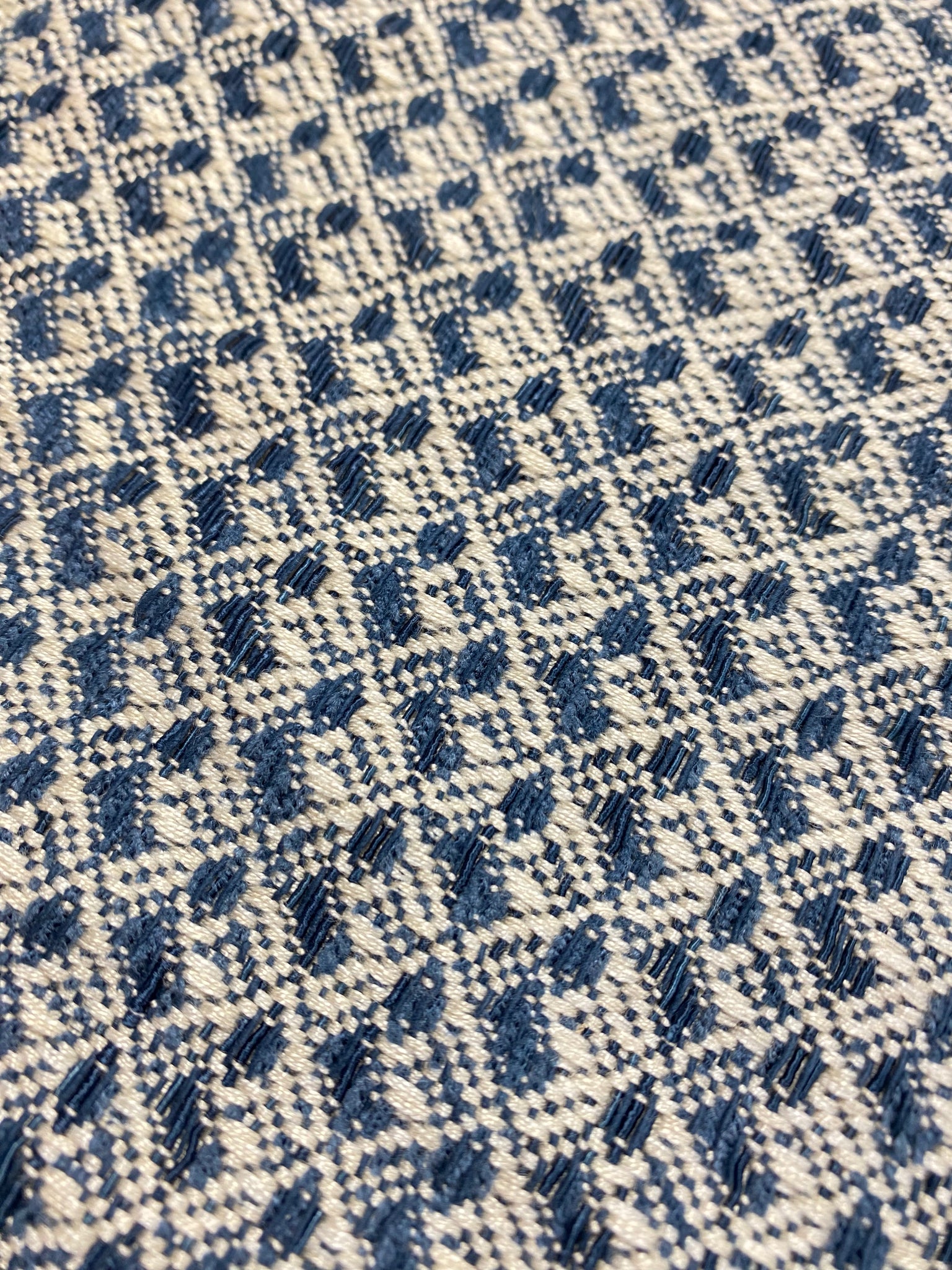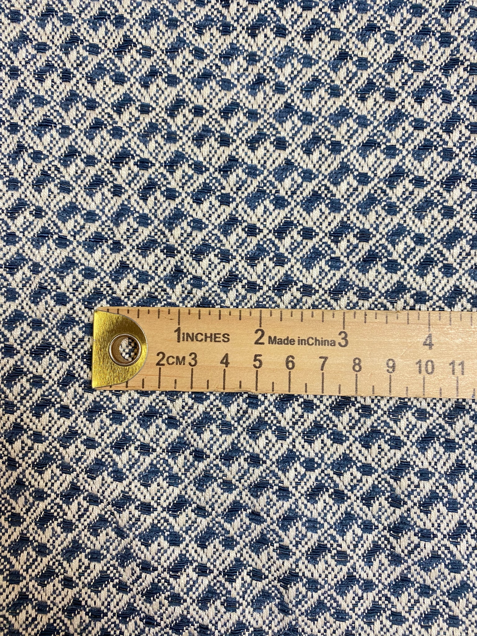 1.25 Yard of 57" wide designer linen geometric abstract upholstery fabric in navy blue and cream. Price is per entire piece. Let us know if you need more than what is available in our store.