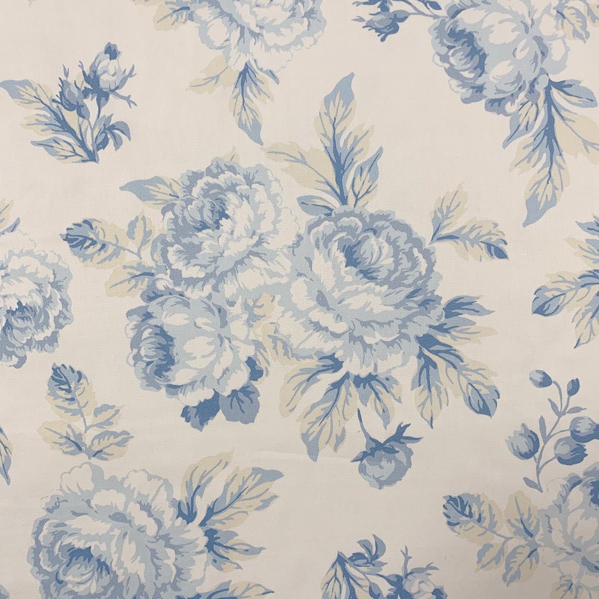 Blue Beige White Floral Cotton Sateen Upholstery Drapery Fabric