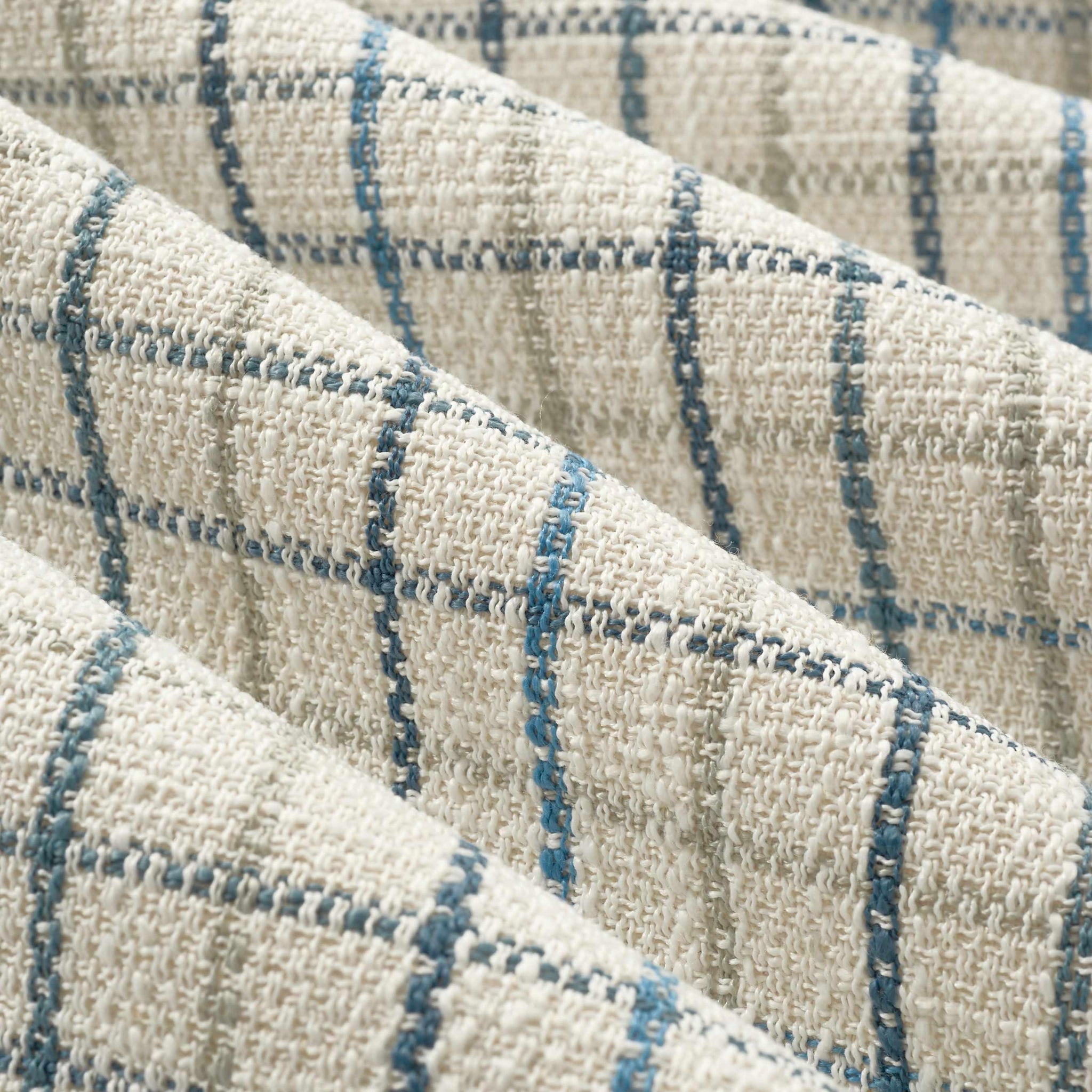 Cotton plaid check upholstery drapery fabric in navy blue, white, and seafoam. Price is per yard. Let us know if you need more than what is available in our store.