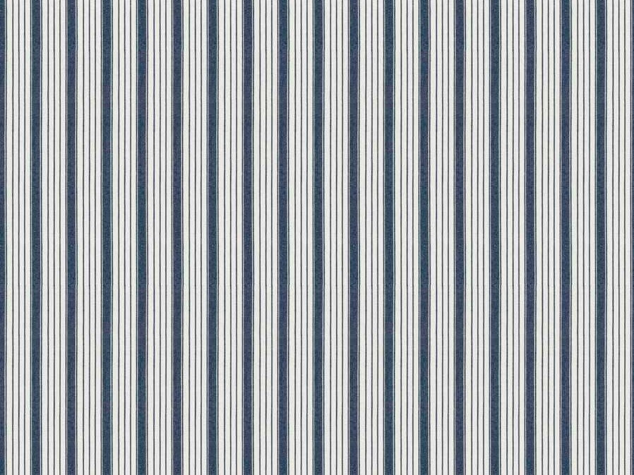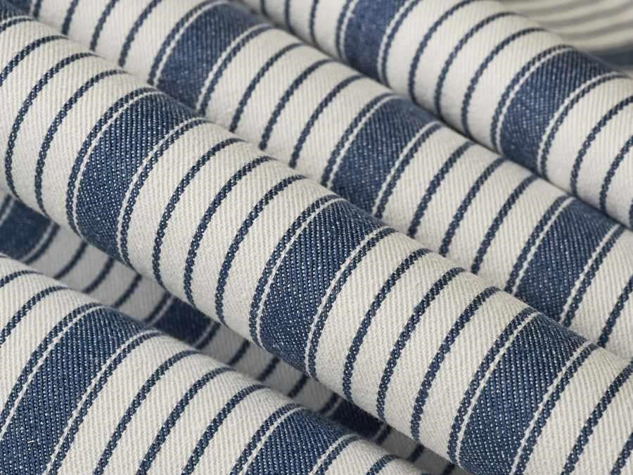 Nautical ticking stripe upholstery drapery fabric in cream and denim blue. Price is per yard. Let us know if you need more than what is available in our store.