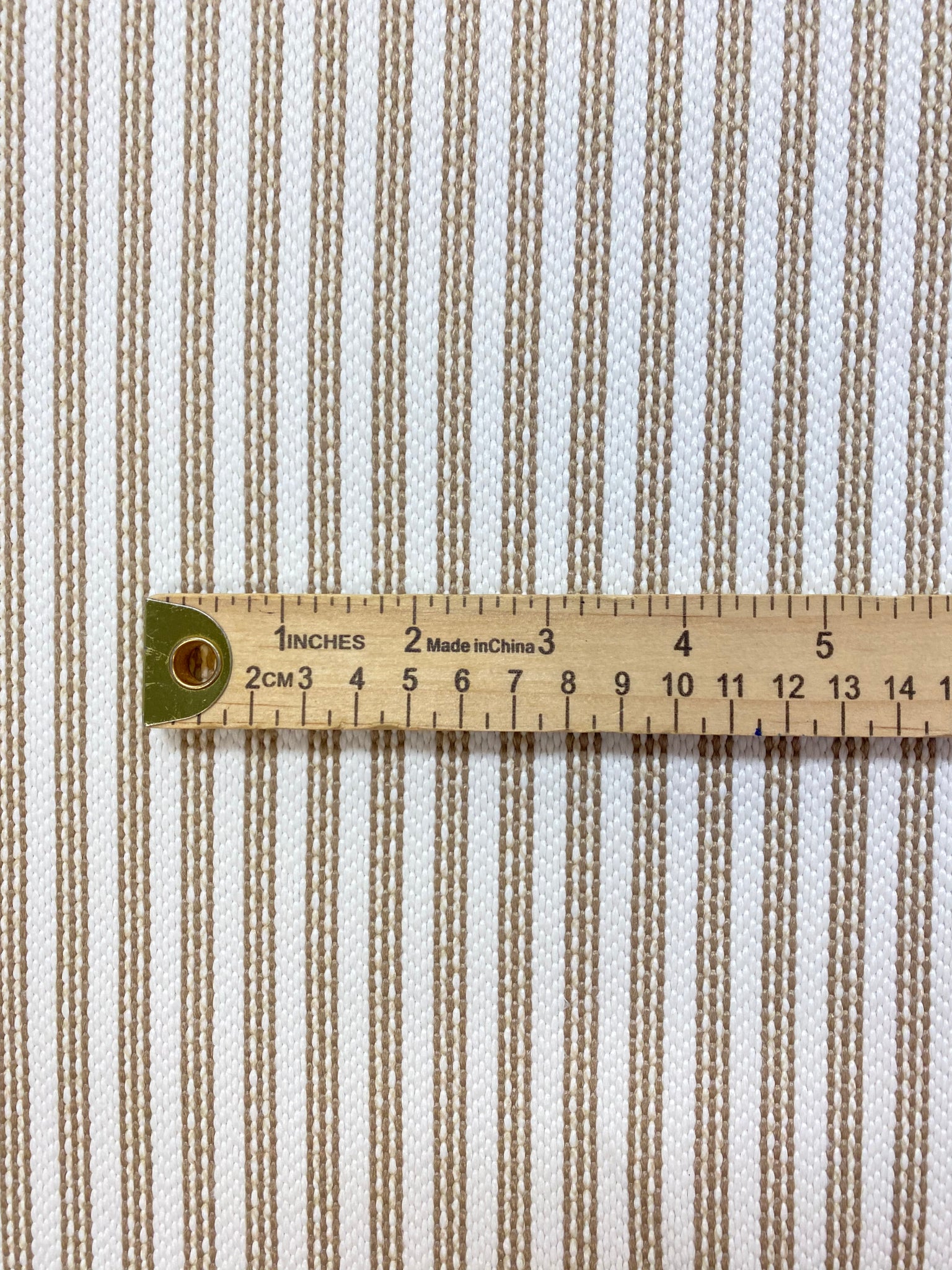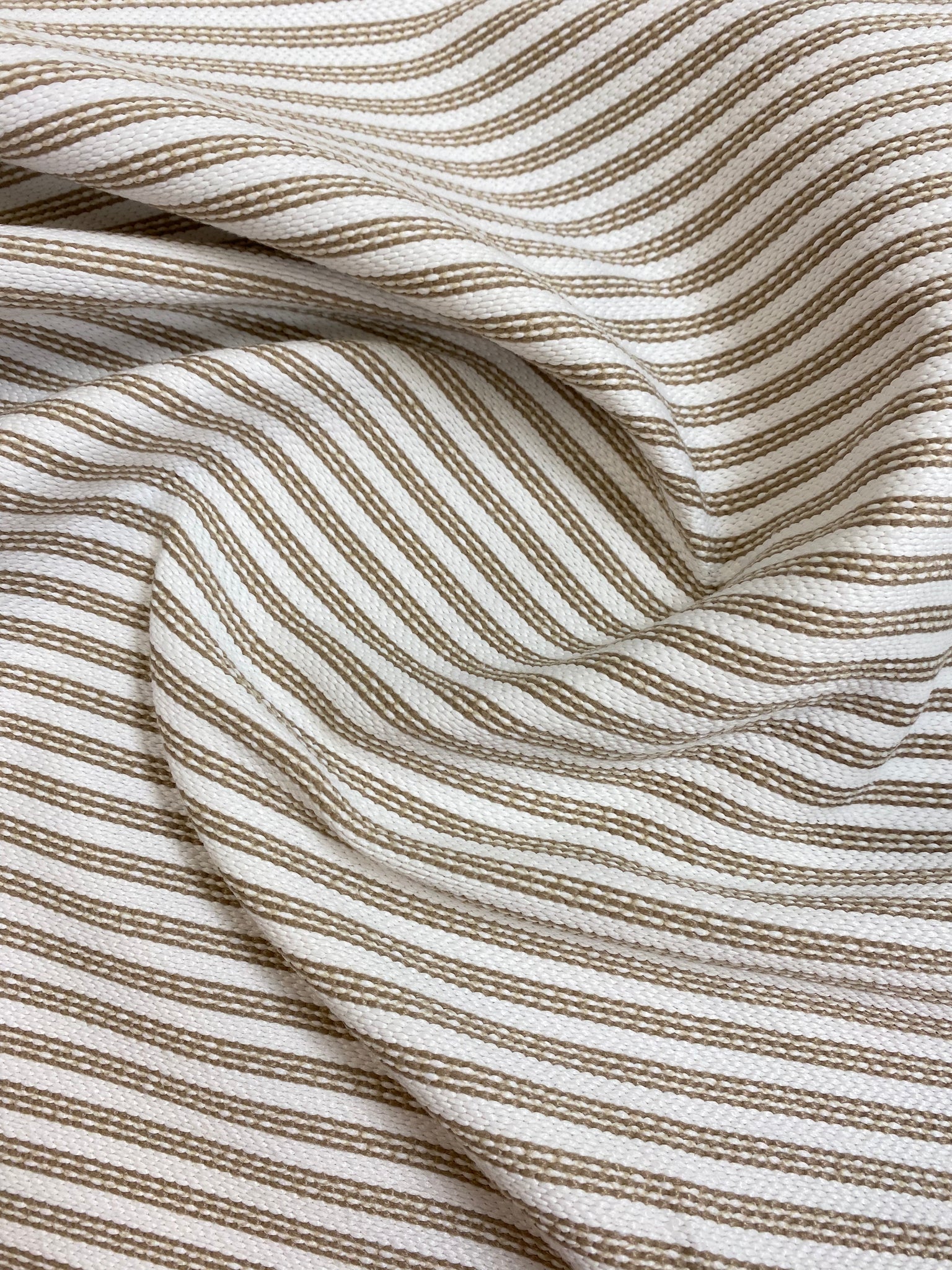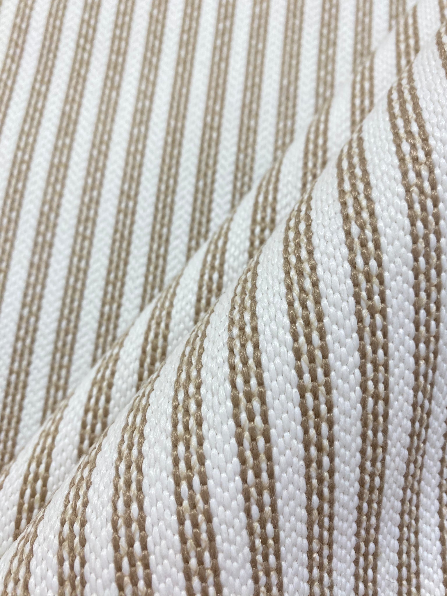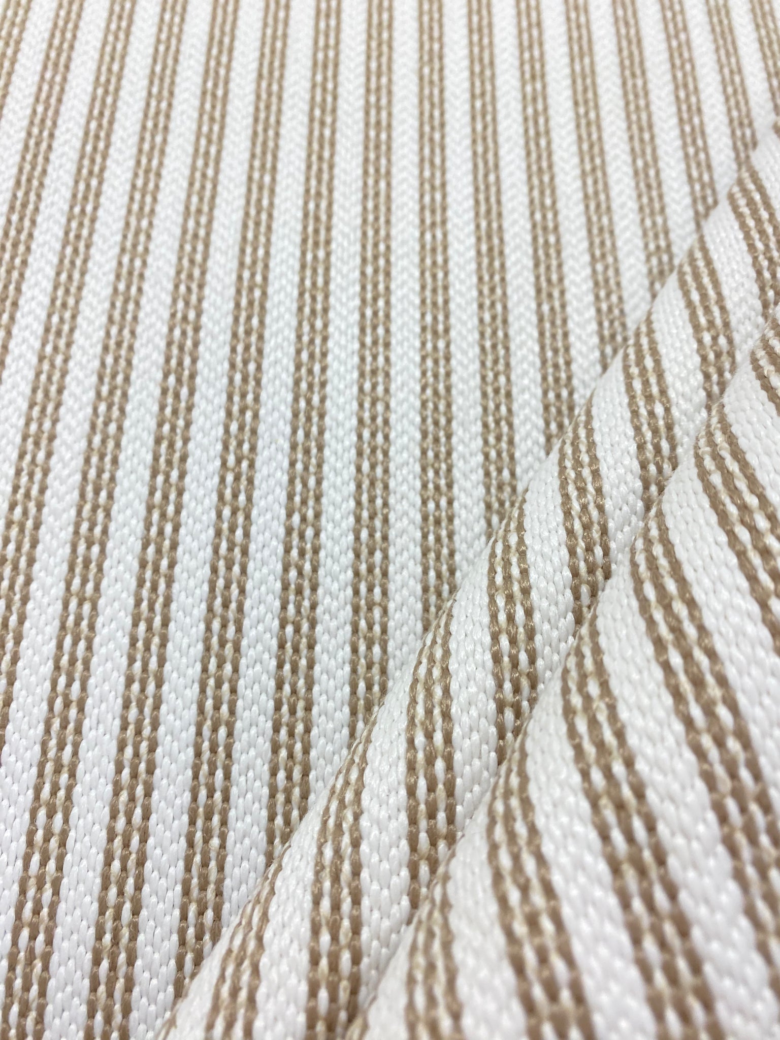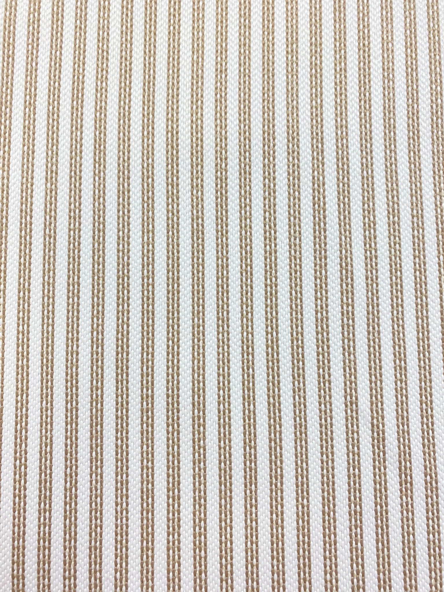 57" wide designer polypropylene woven nautical stripe upholstery fabric in beige and white. Price is per yard. Let us know if you need more than what is available in our store.