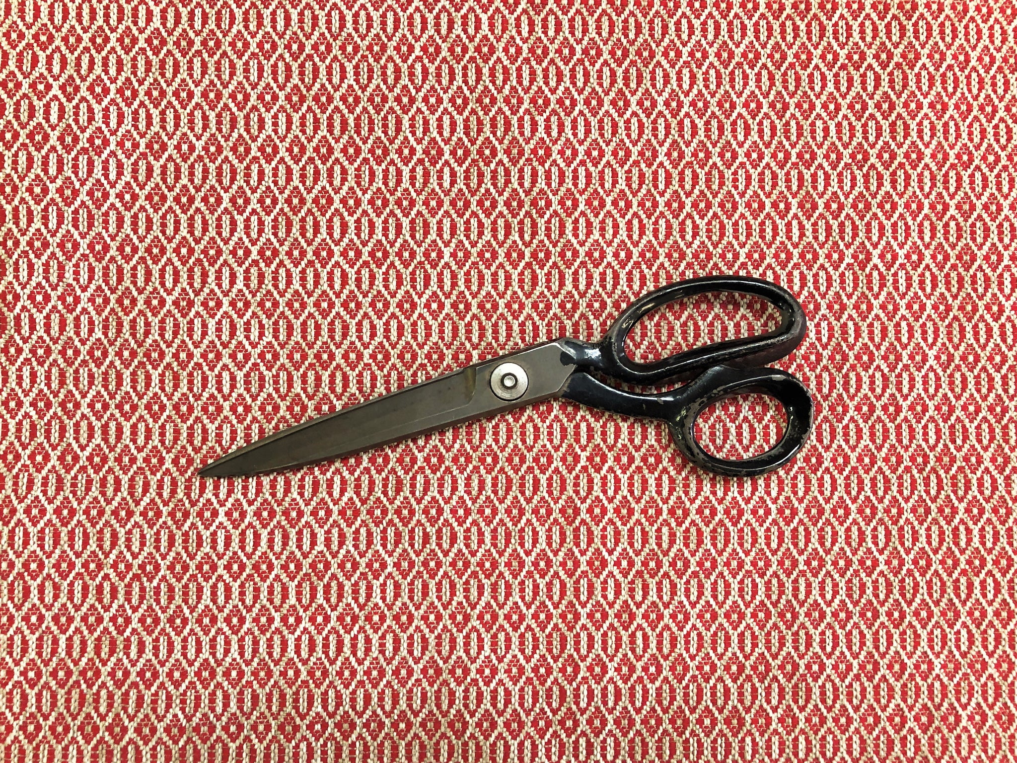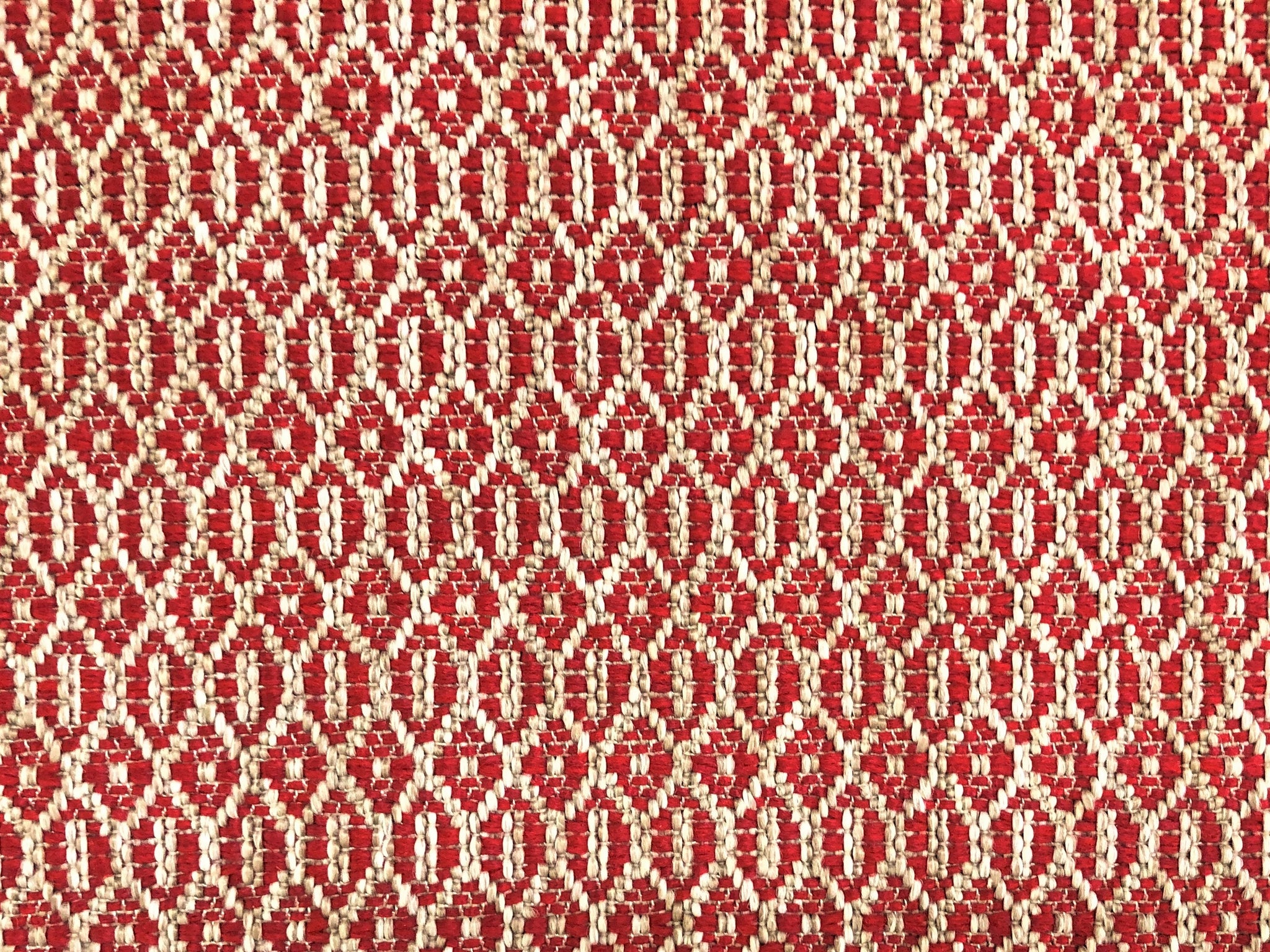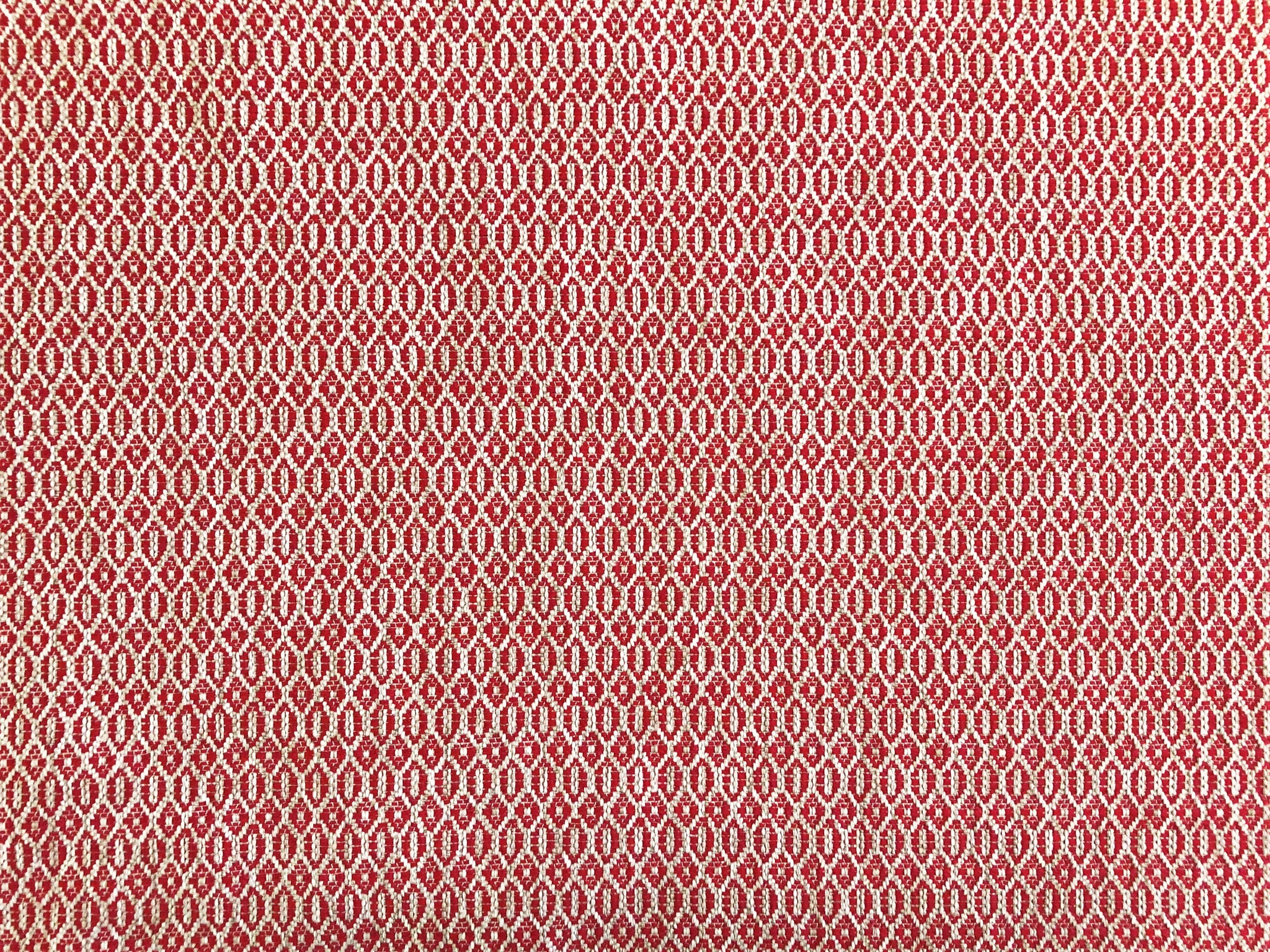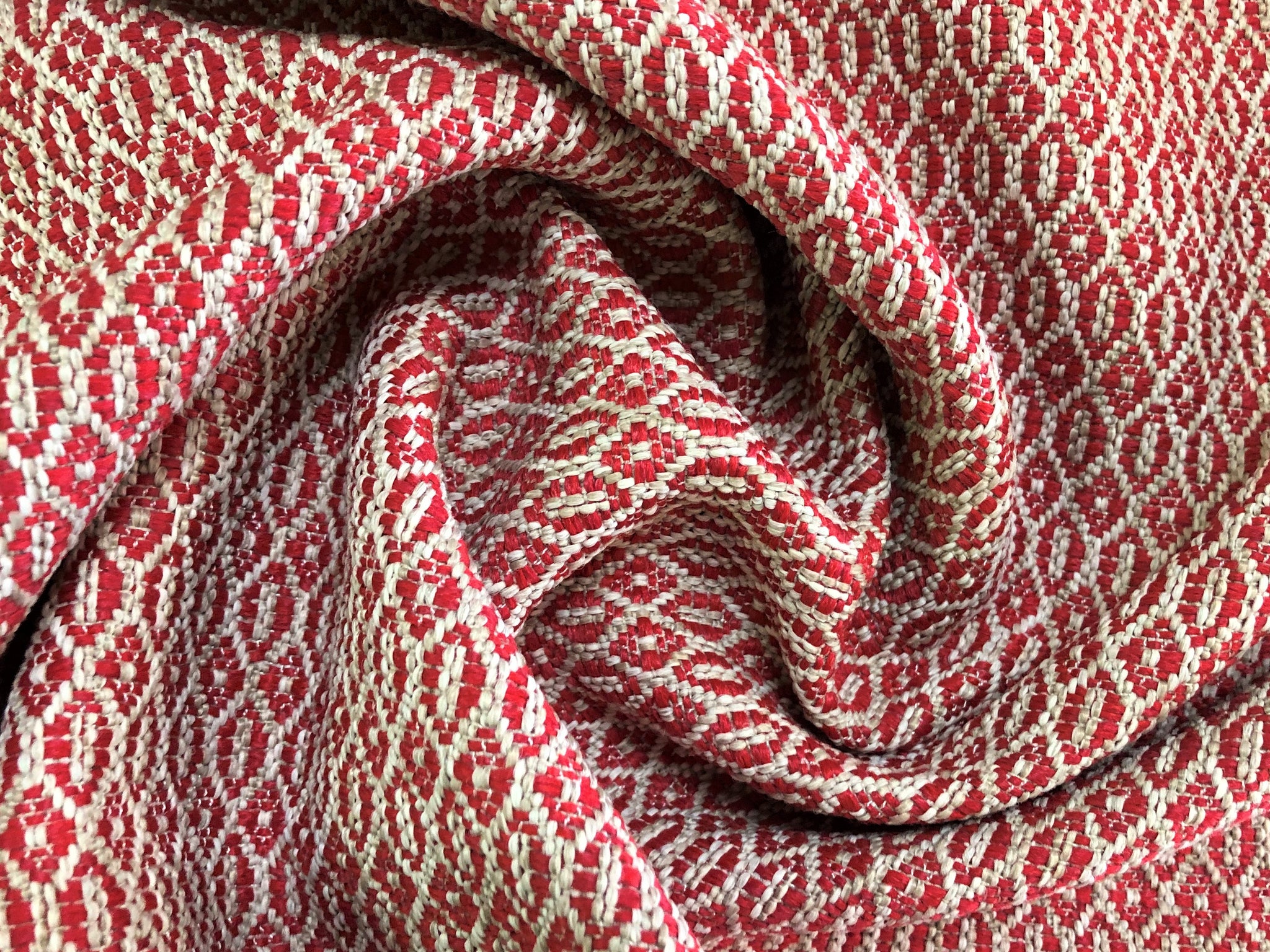 56" designer woven geometric art deco upholstery fabric in ruby red and beige. Price is per yard. Let us know if you need more than what is available in our store.