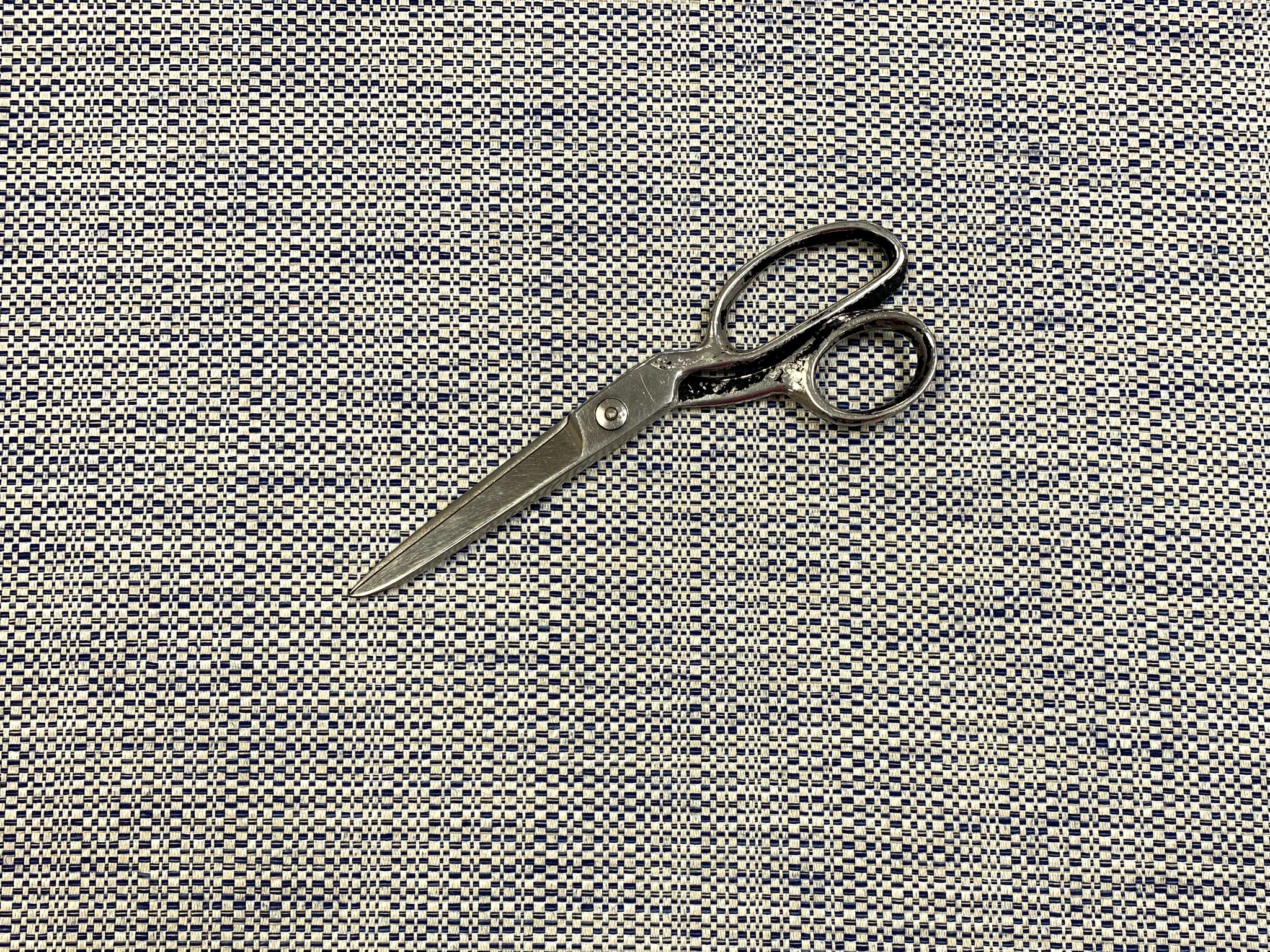 1 3/4 yard piece of 55" wide designer water & stain resistant woven MCM mid century modern tweed upholstery fabric in navy blue and beige. Price is for entire piece. Let us know if you need more than what is available in our store