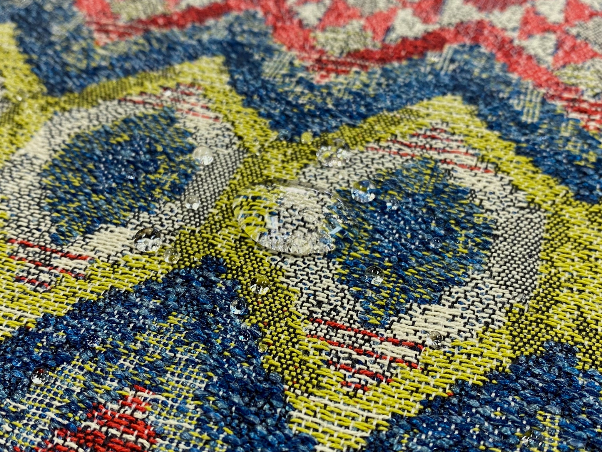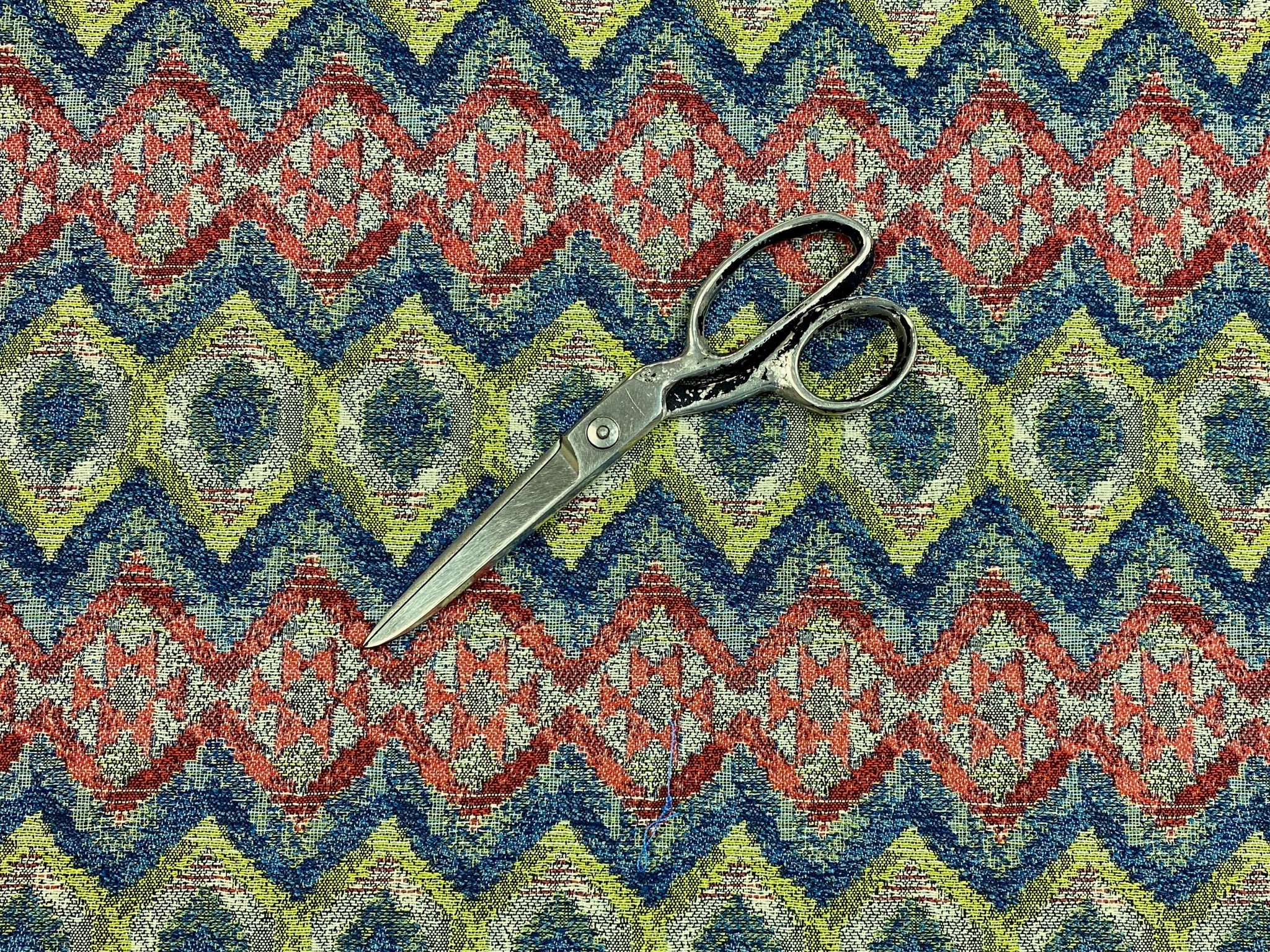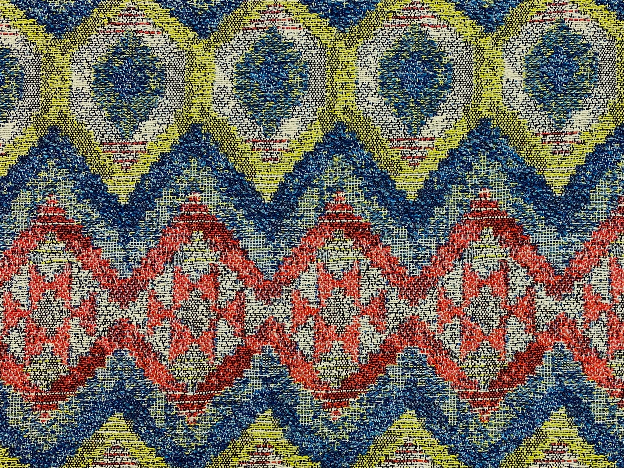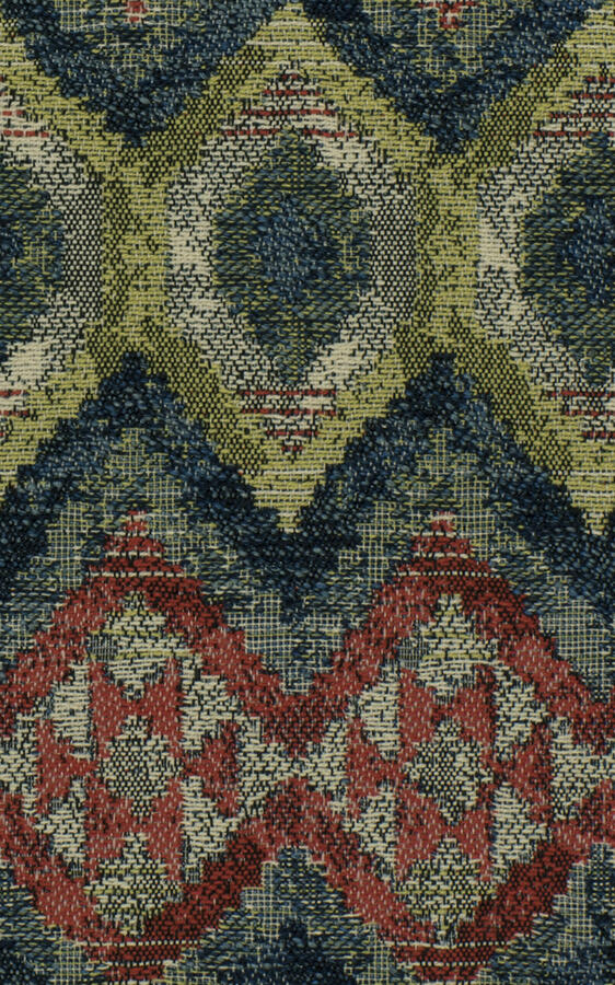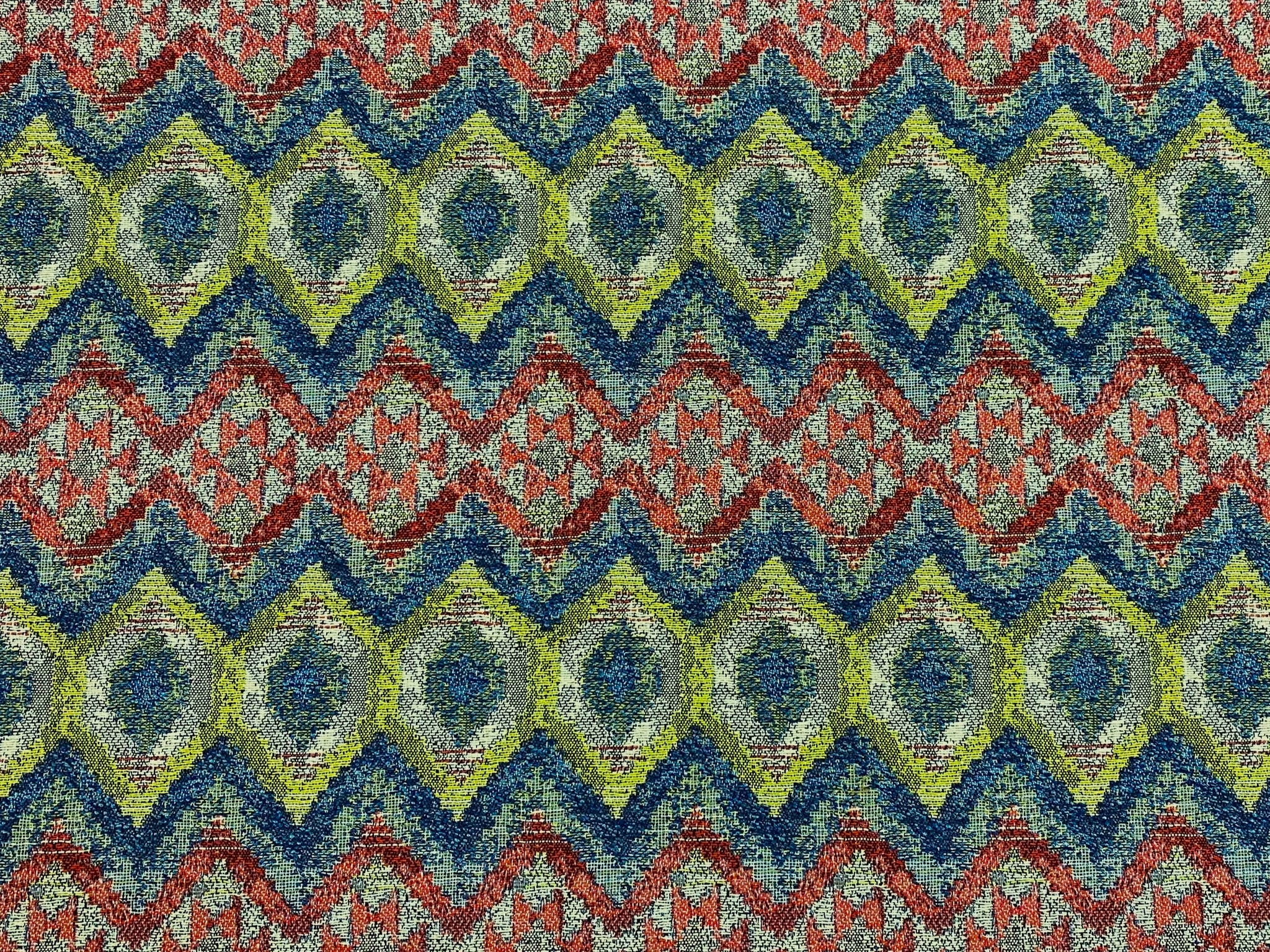 55" wide Fabricut Barbados Fiesta water & stain resistant ethnic kilim ikat woven upholstery fabric in green, red, teal blue, beige and taupe. Price is per yard. Let us know if you need more than what is available in our store.