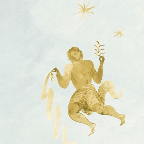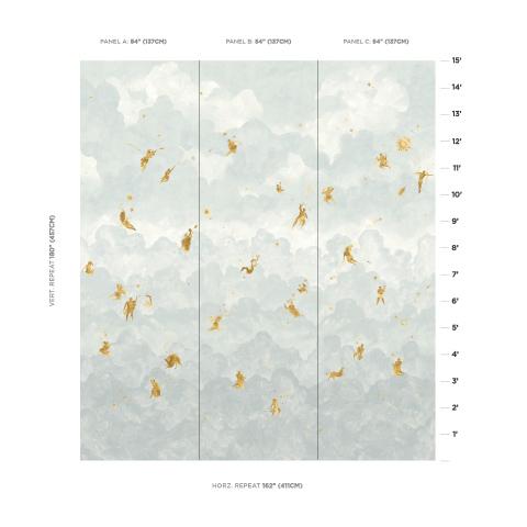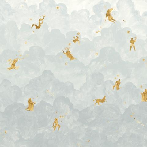 Backdrop collaborated with artist Xavier Donnelly to create Ascendance Panel Set, a billowy cloudscape with a dramatic tonal effect. Enlivened by gamboling mythological figures and fluttering fantastical creatures amid delicate stars and fiery comets, this ethereal three-panel wallpaper design has a stylized gestural aesthetic and the look of a hand-painted mural. It can wrap an entire room or make an expansive blank wall infinitely interesting.
