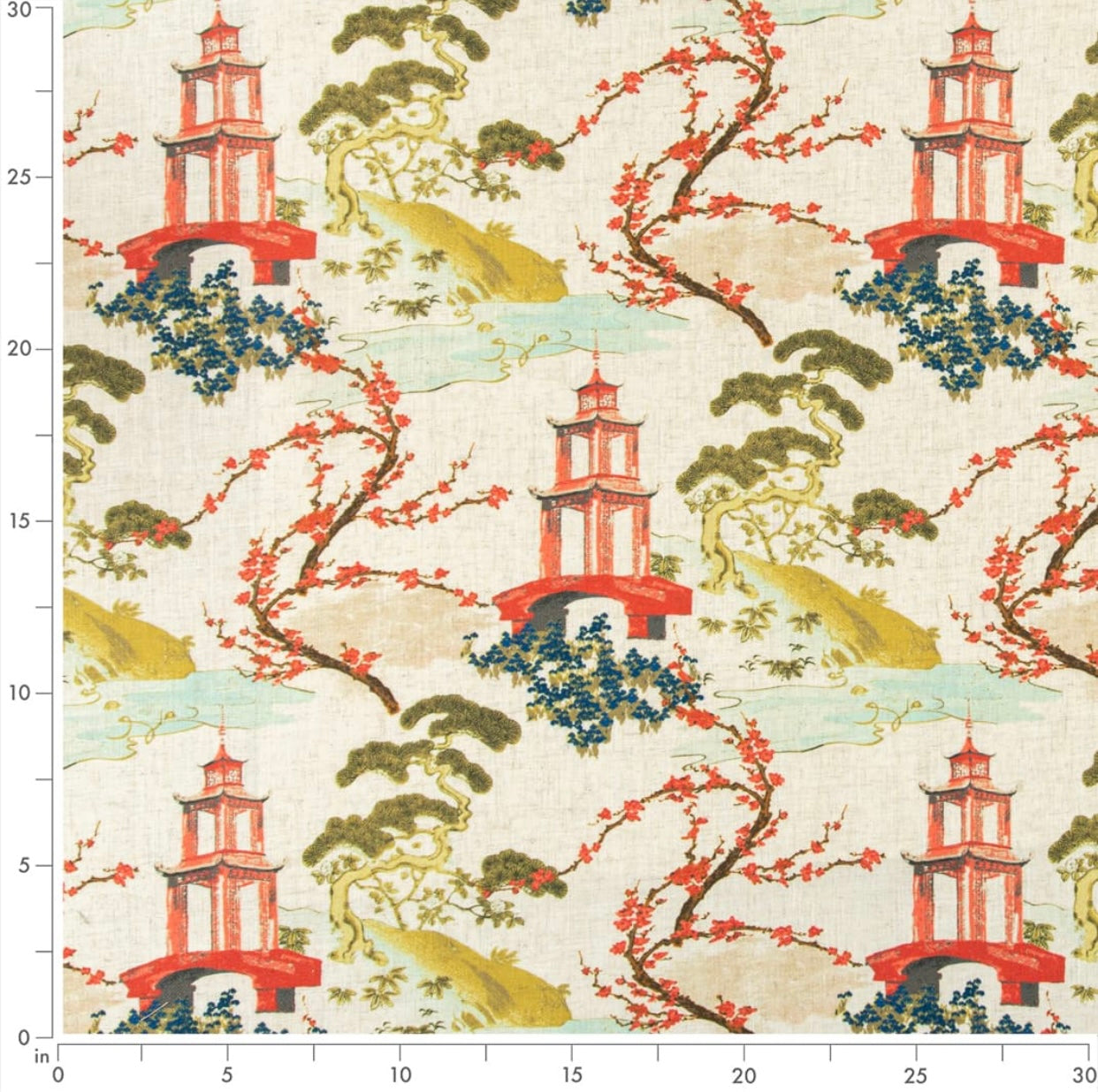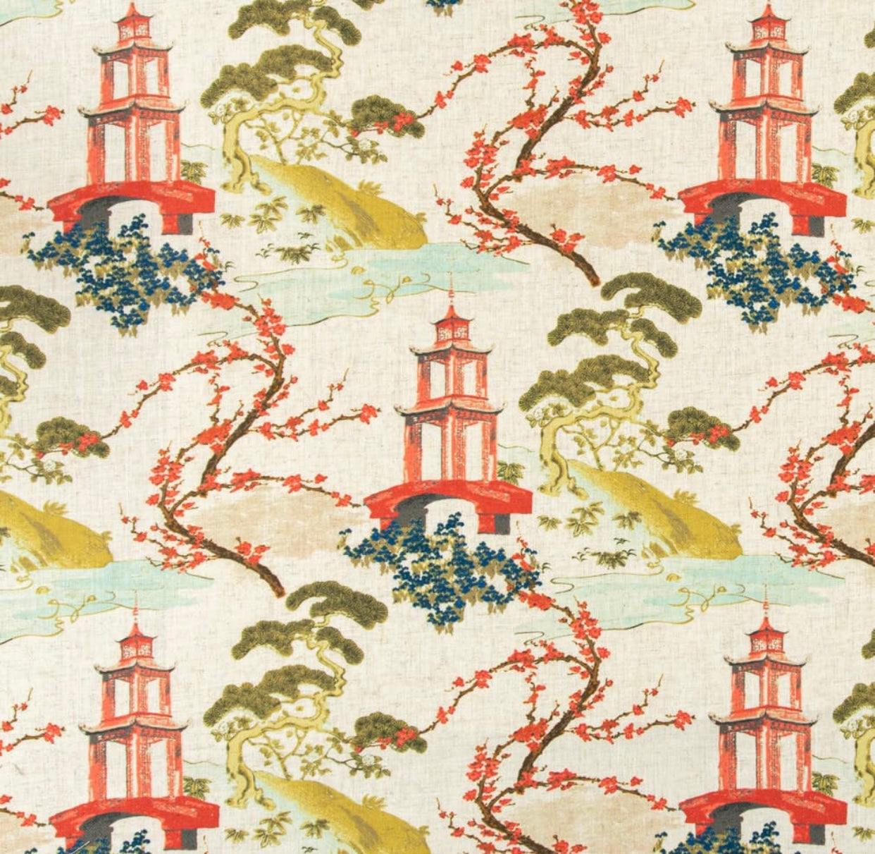 Stain resistant chinoiserie asian upholstery drapery fabric in aqua blue, cream, red and green. Price is per yard. Let us know if you need more than what is available in our store.