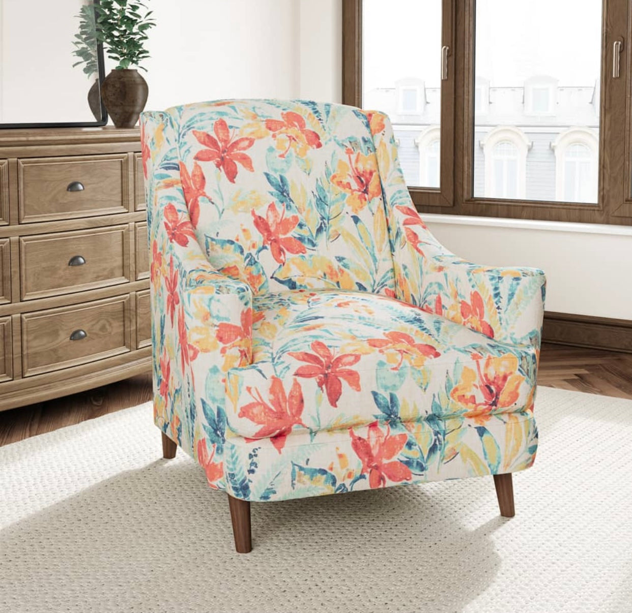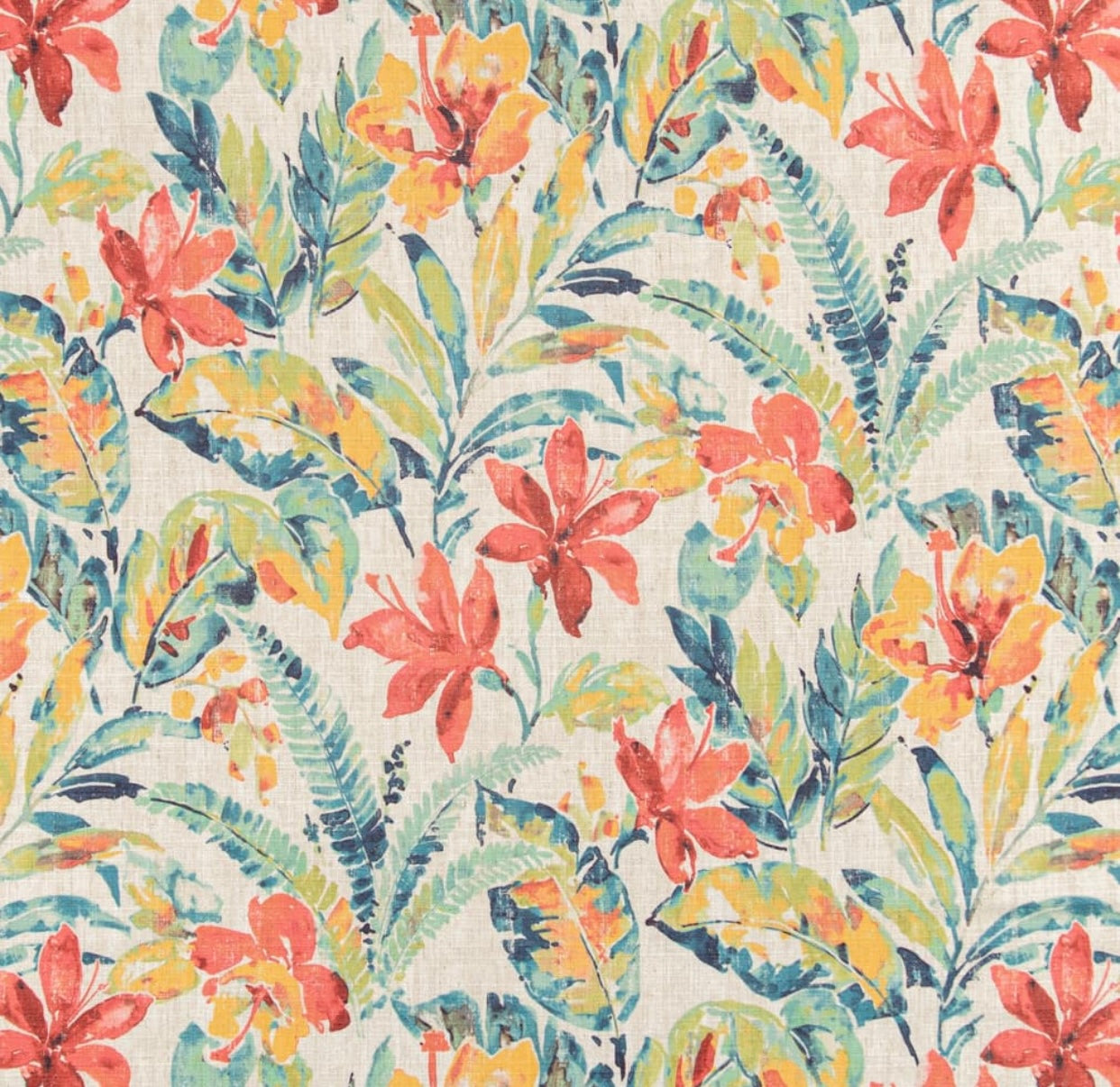 Width 54.00 in. Stain resistant floral upholstery drapery fabric in cream, teal, green and coral . Price is per yard.