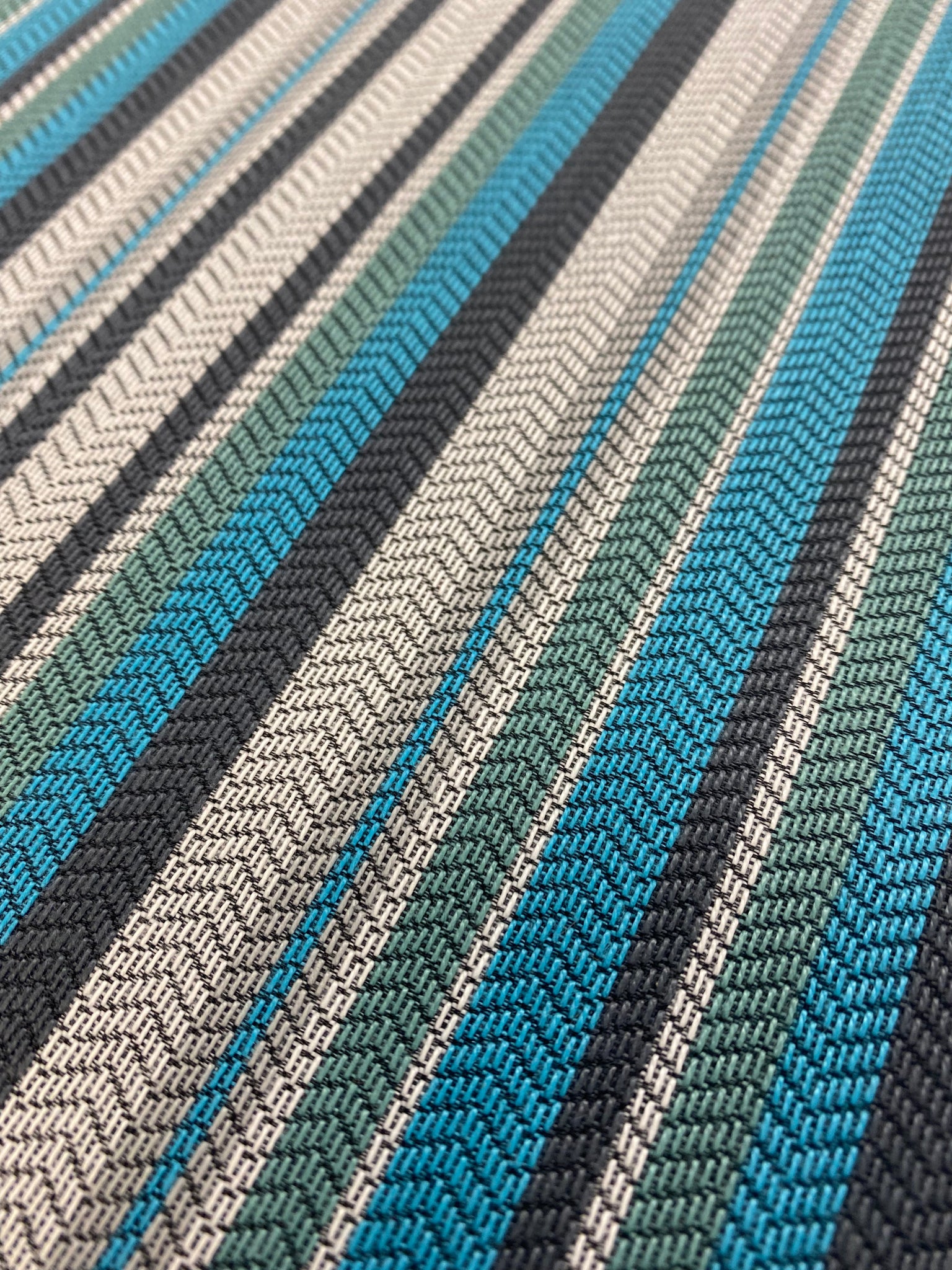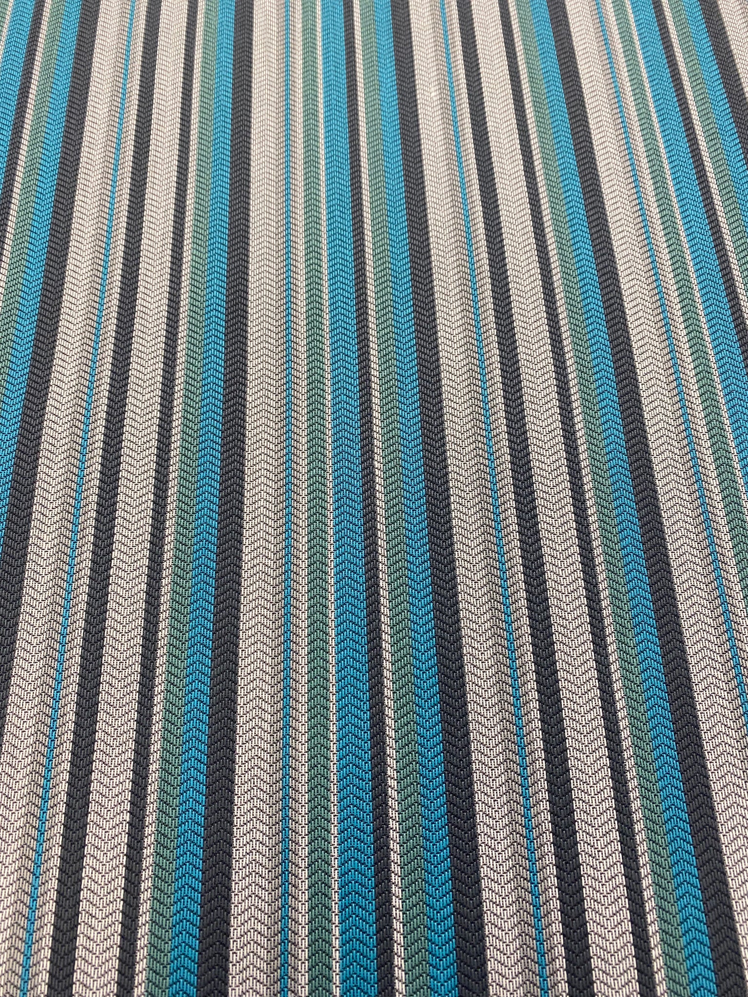 Width 58 Inches. Water & stain resistant stripe upholstery fabric in turquoise, blue, grey and teal. Price is per yard. Let us know if you need more than what is available in our store.