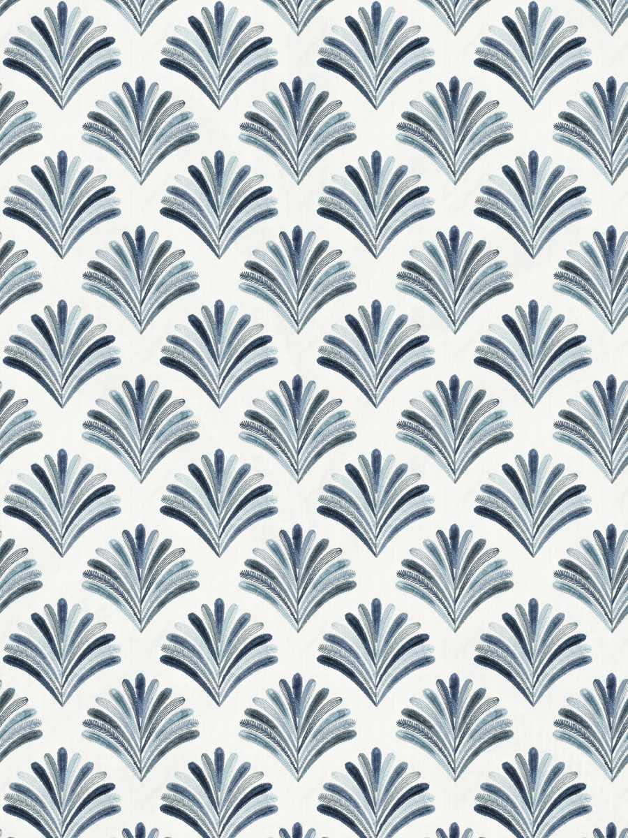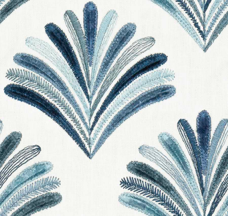 White Navy Blue Teal Aqua Embroidered Fan Drapery Fabric